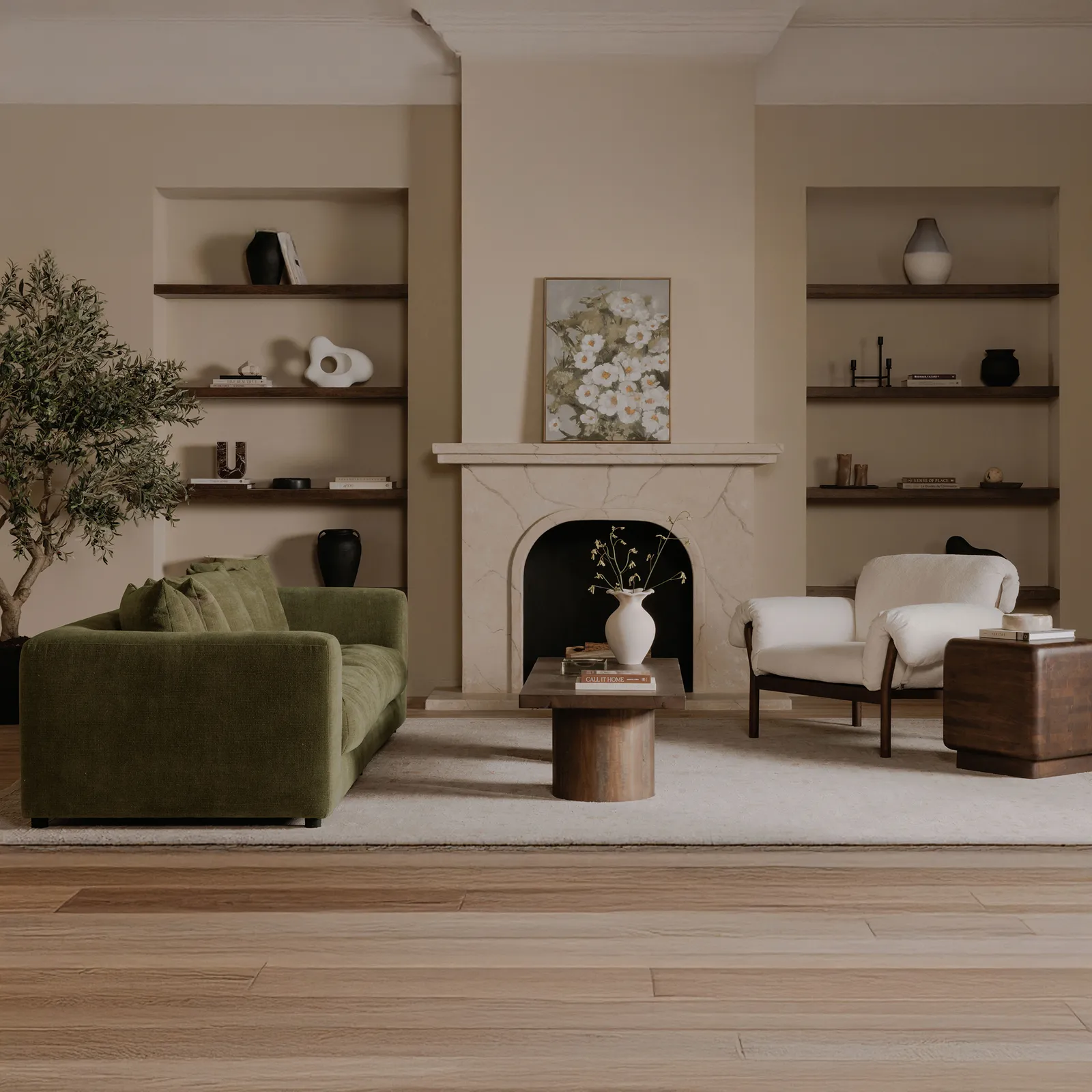 The Davie Sofa’s generous scale and deep seat invite serene relaxation. Tufted seat cushions adorned with feather and fiber toppers create a plush landscape made for lounging. The two-piece sofa in velvety chenille upholstery offers a flexible arrangement as six loose back pillows create personalized comfort.