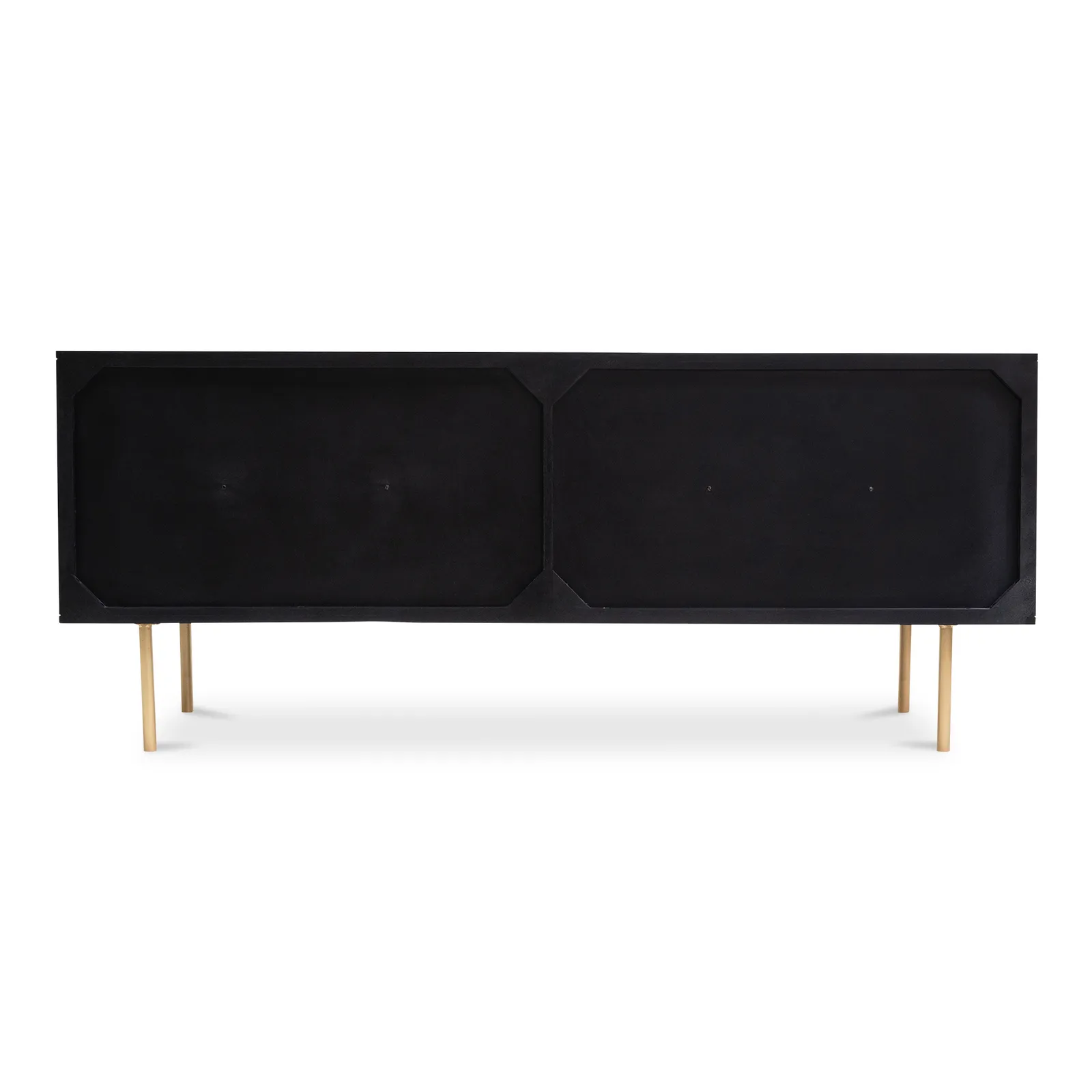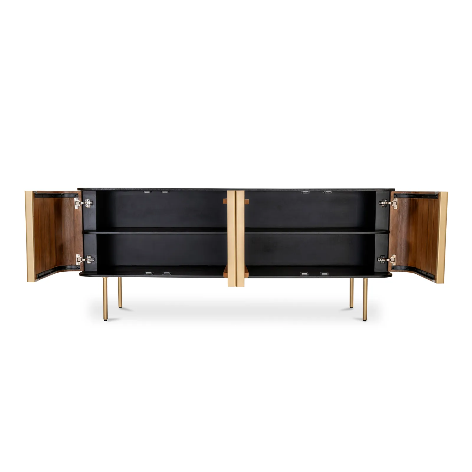 Made from mid-tone brown mango wood, the Dionne 4-door sideboard strikes a balance between natural beauty and contemporary design. Antique brass accents highlight the wood’s natural grain, infusing the piece with a modern flair. The soft, curved door design adds a gentle touch, while the sophisticated black frame contrasts with its refined elegance.