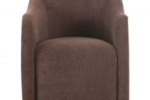 An updated take on the classic barrel chair, the Drava rolling dining chair is all about comfort-driven design with a continuous curve from arms to back and a squared padded seat wrapped in soft, textured upholstery for ultimate comfort with added versatility–its rolling base can be replaced with included plastic legs to create stationary seating.