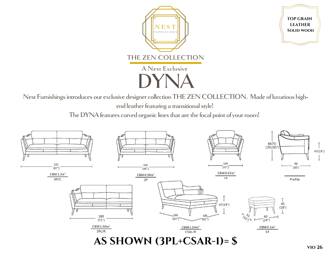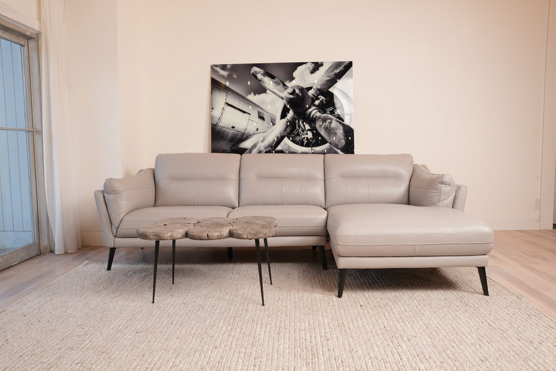 The Dyna mid-century leather sofa offers clean lines and tapered metal legs. Customize as a sofa, love, or chair, or add a chaise for a mini sectional for small spaces. Elevate your living space with our Mid-Century Modern Leather Sofa, a perfect blend of classic elegance and contemporary style. Crafted for those who appreciate the finer things, this sofa is designed to be the centerpiece of your home. Available in hundreds of leathers or fabrics. The price shown is for a grade 10 leather. See a Nest designer to customize.