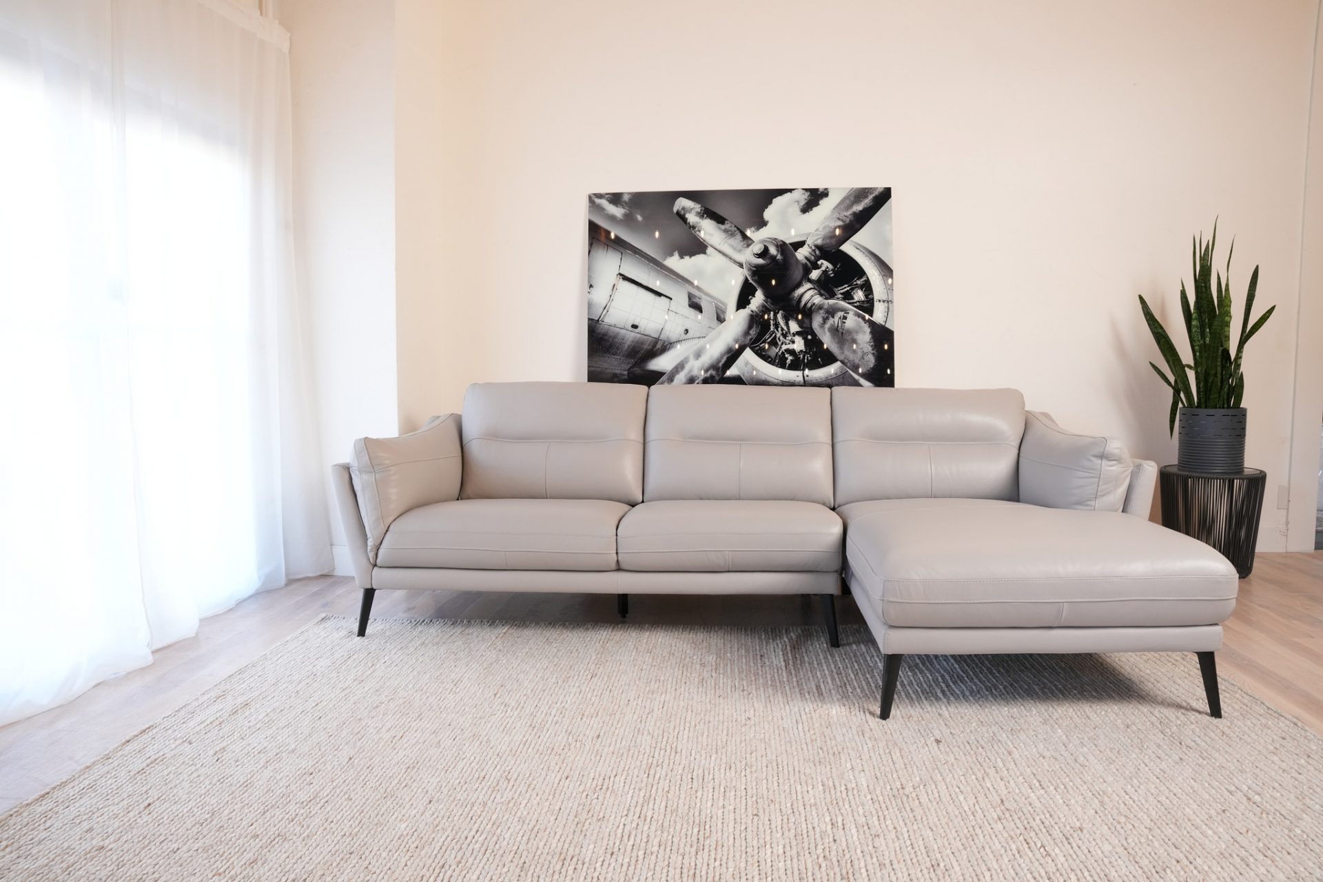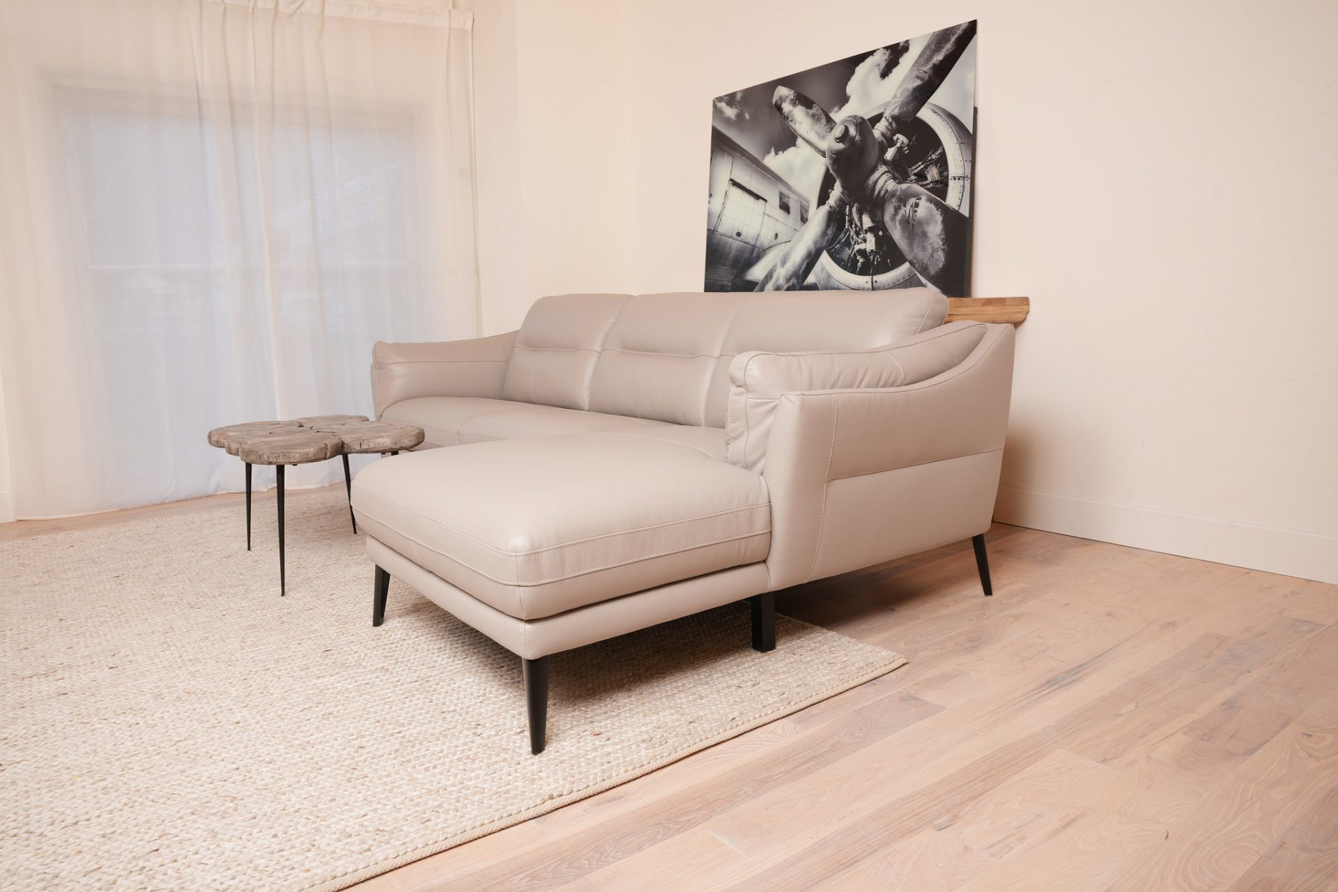 Mid-Century modern sofa with a chaise. Sectional leather or fabric. Dove Grey