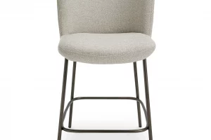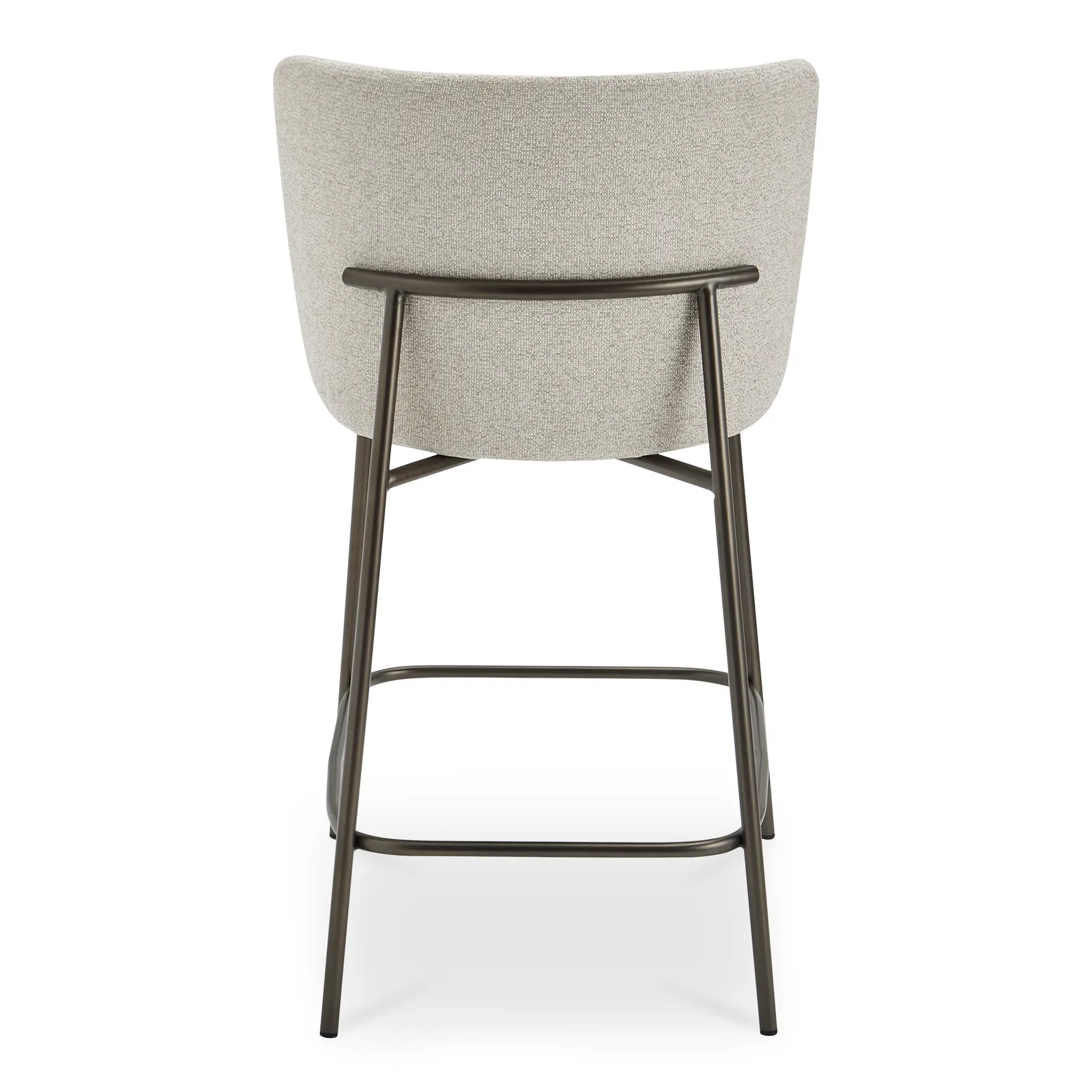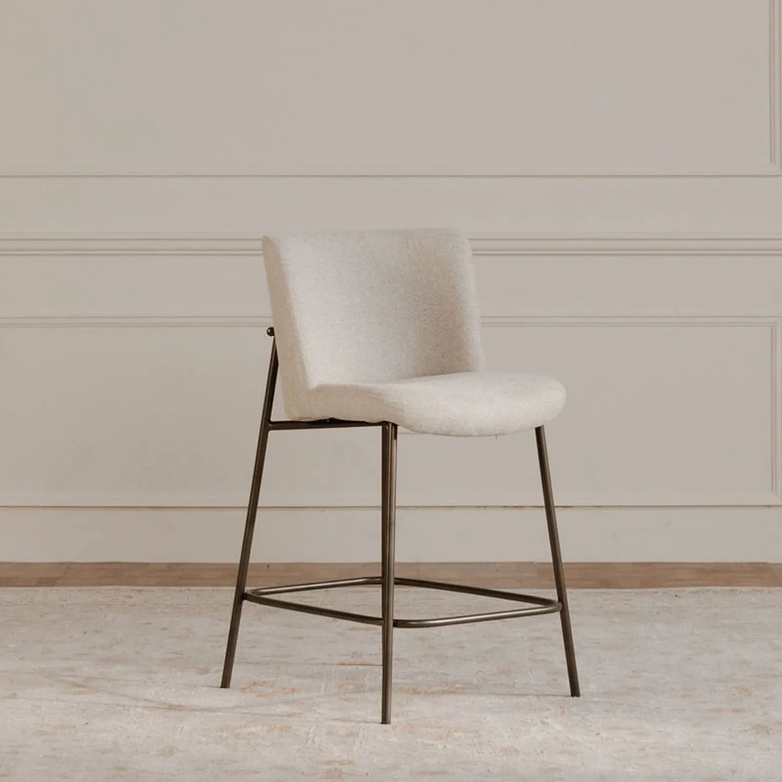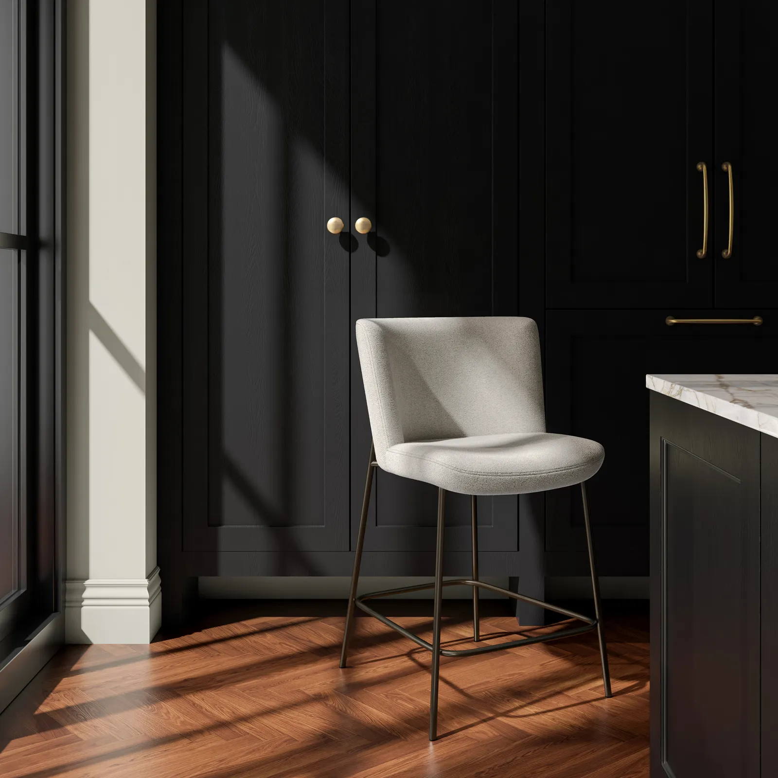 The Early counter stool is an elegant fusion of minimalist design and comfort that features a slim metal frame in a blackened bronze finish. Its seat and comfortably curved back are upholstered in durable, easy-to-maintain Performance fabric. It complements any dining setting, especially alongside wooden tables, presenting a clean, cohesive look that invites sophisticated ease.