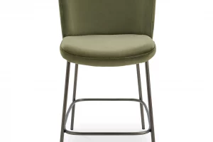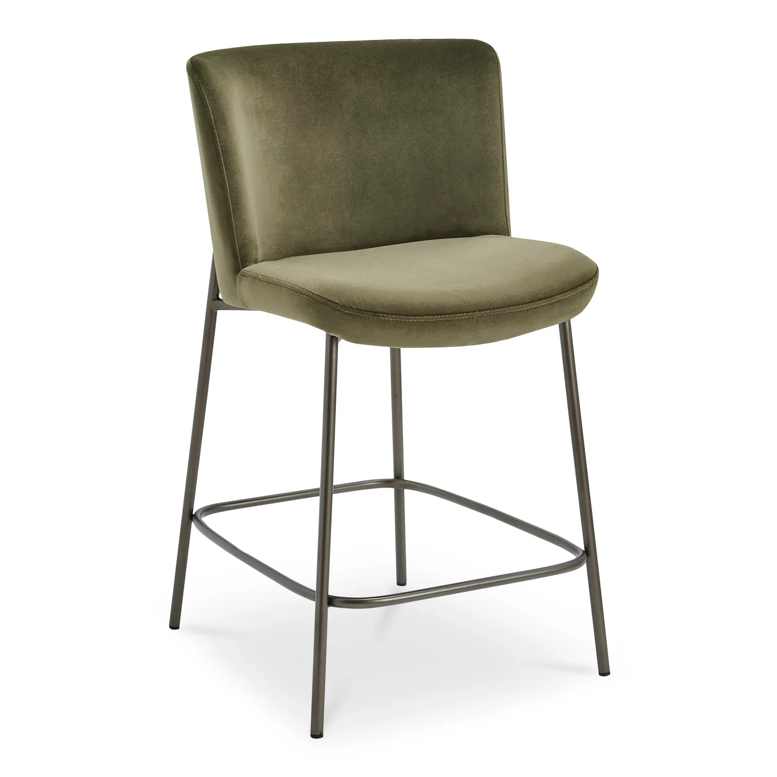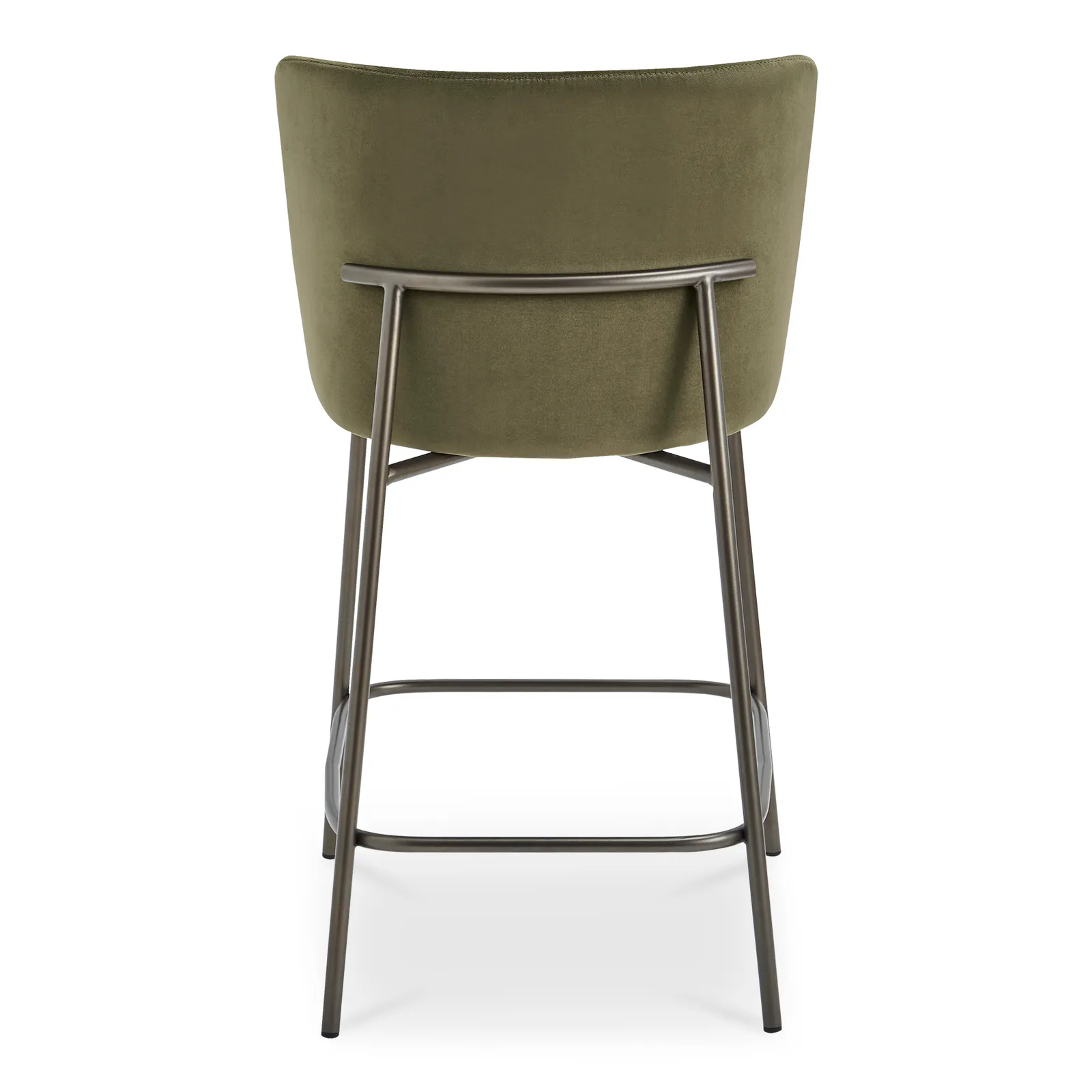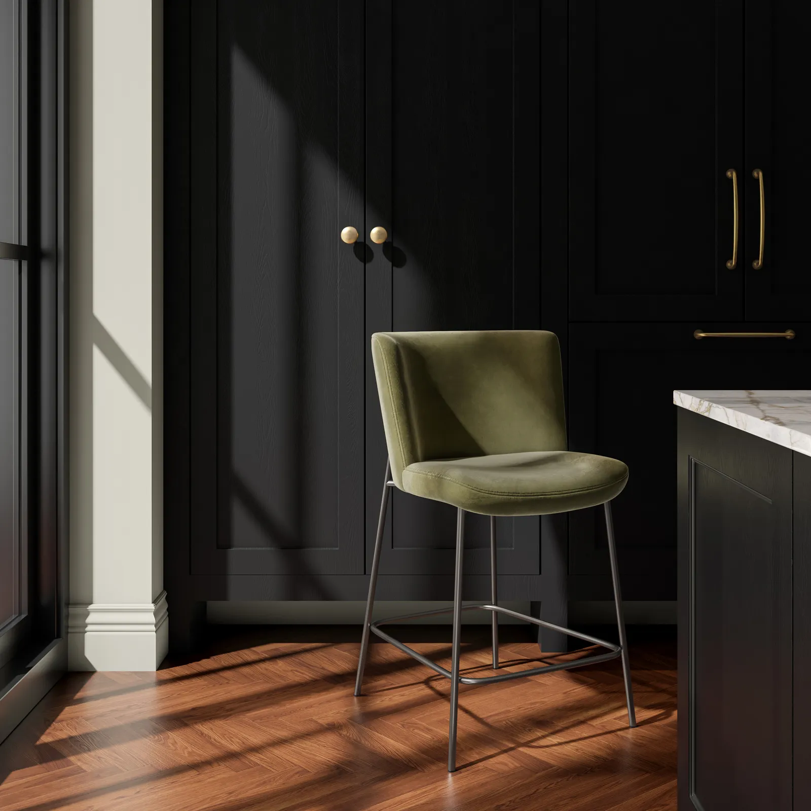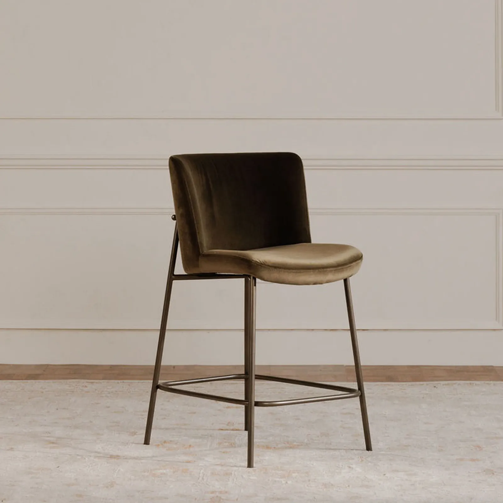 The Early counter stool is an elegant fusion of minimalist design and comfort that features a slim metal frame in a blackened bronze finish. Its seat and comfortably curved back are upholstered in durable faux mohair that resembles velvet’s soft allure but is easier to maintain. It complements any dining setting, especially alongside wooden tables, presenting a clean, cohesive look that invites sophisticated ease.