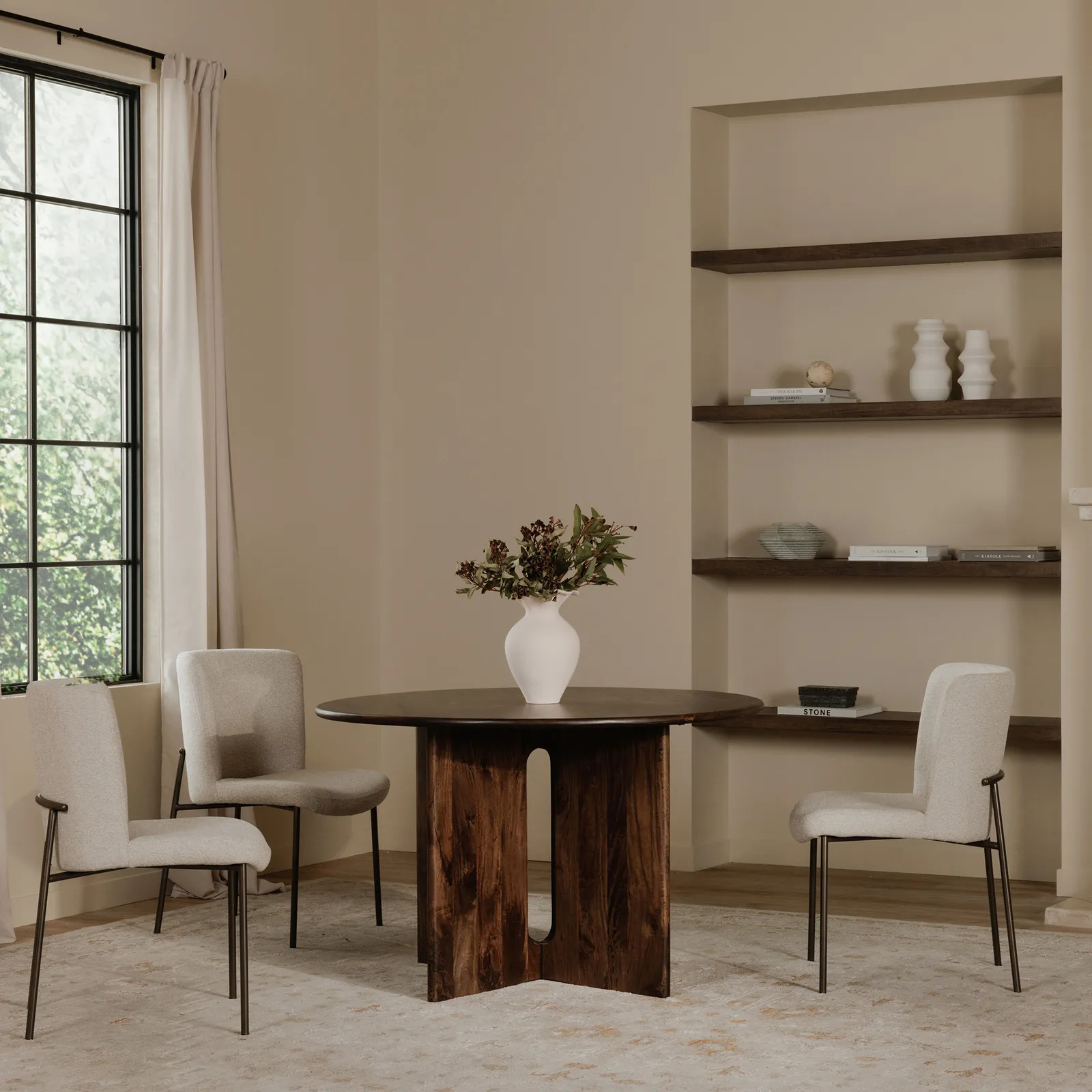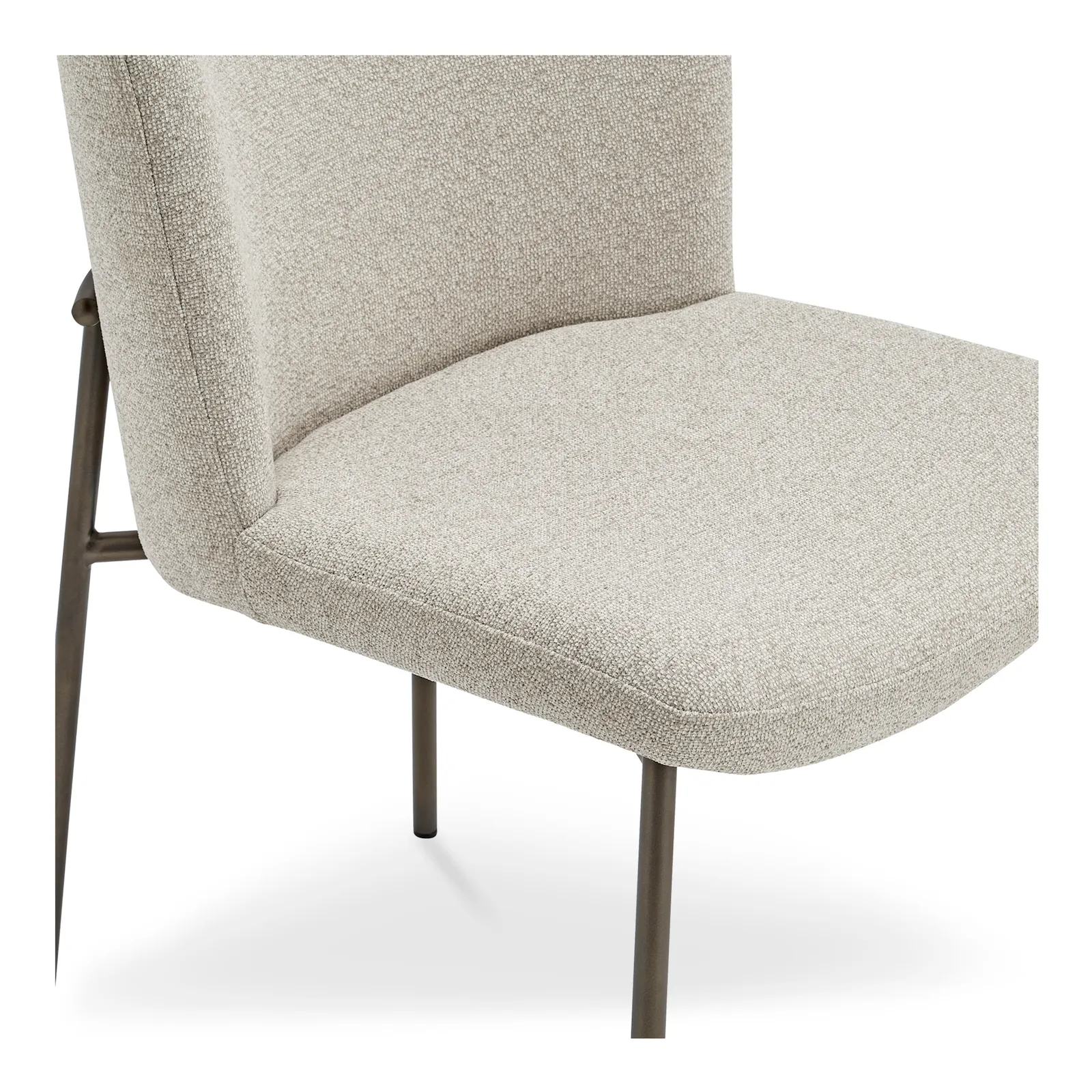 The Early dining chair is an elegant fusion of minimalist design and comfort that features a slim metal frame in a blackened bronze finish. Its seat and comfortably curved back are upholstered in durable, easy-to-maintain Performance fabric. It complements any dining setting, especially alongside wooden tables, presenting a clean, cohesive look that invites sophisticated ease.