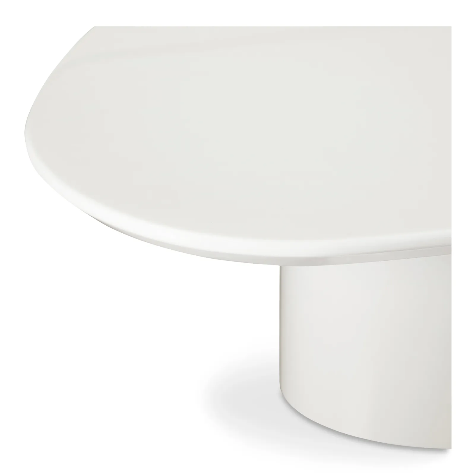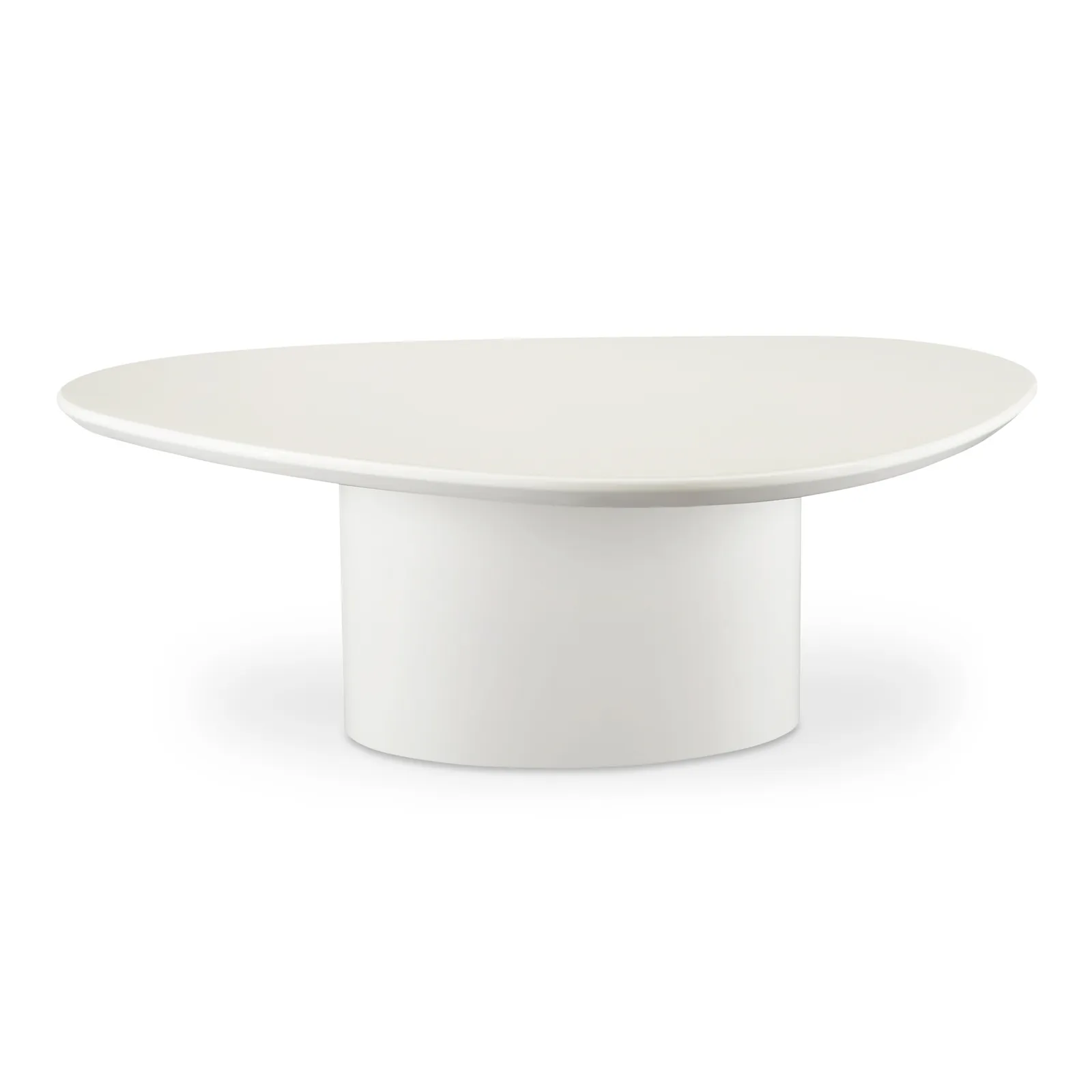 The Eden coffee table features a rounded triangular shape and oval pedestal base, creating a scultural silhouette that exudes modern sophistication. An ivory white and black high gloss finishes this coffee table’s surface, reflecting light, brightening and opening up any space.