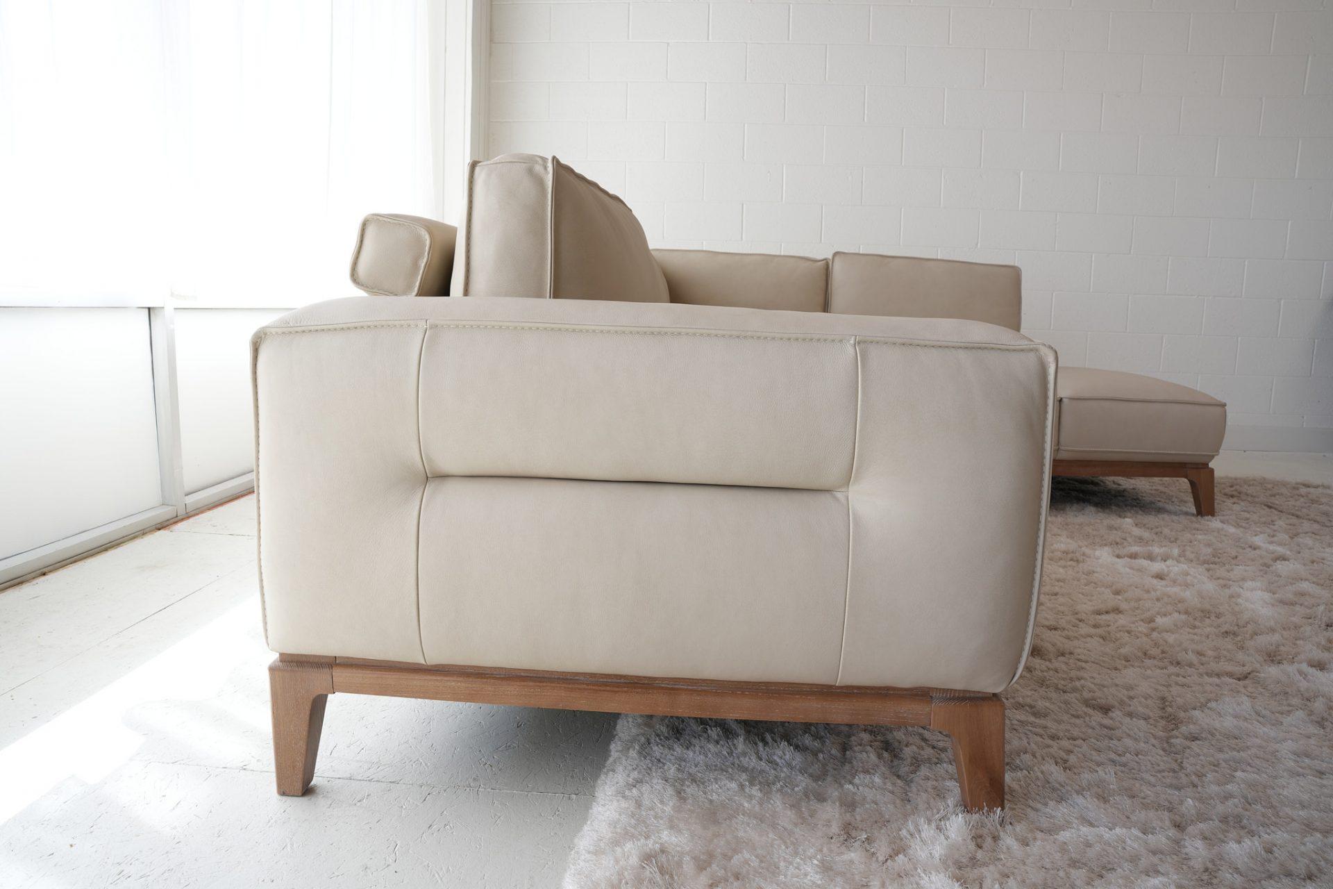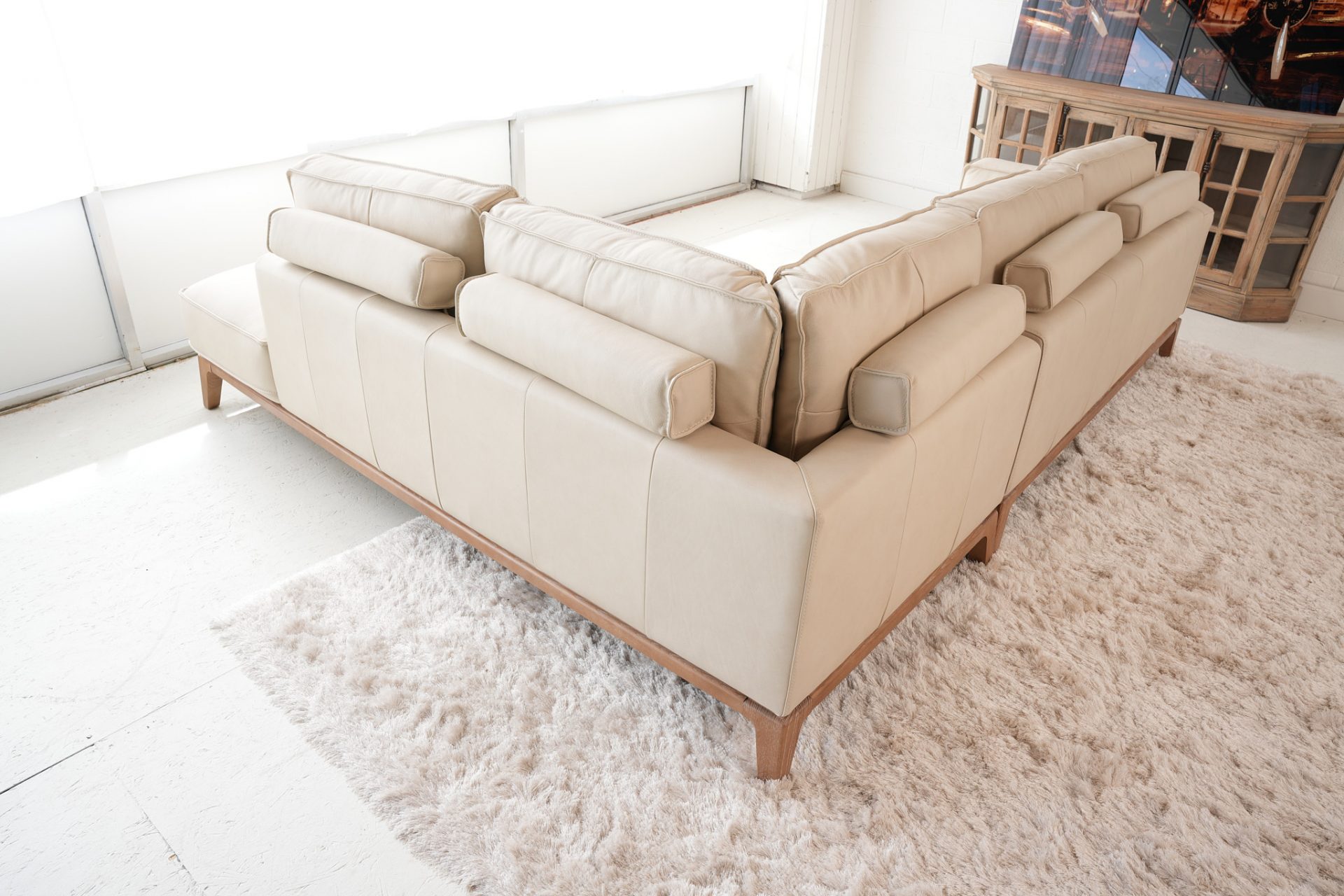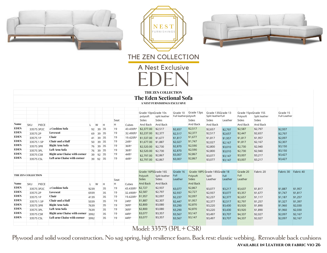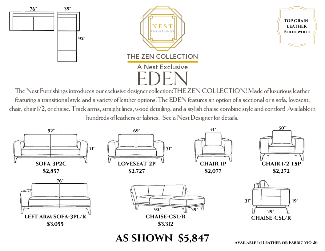 The Eden Leather Sectional is part of the Nest Furnishings Zen Collection. It is customizable in hundreds of fabrics or leathers. The elegant modern styling is complemented by a blond hardwood base and leg detail. The bolster pillows in the back add a fun detail and give a stylish back view, giving you the option to float this showpiece in your space. This sectional is substantive and well-built with a hardwood frame. The price depends on the leather or fabric grade. The price shown is for leather grade 10. See a Nest designer for customization details.