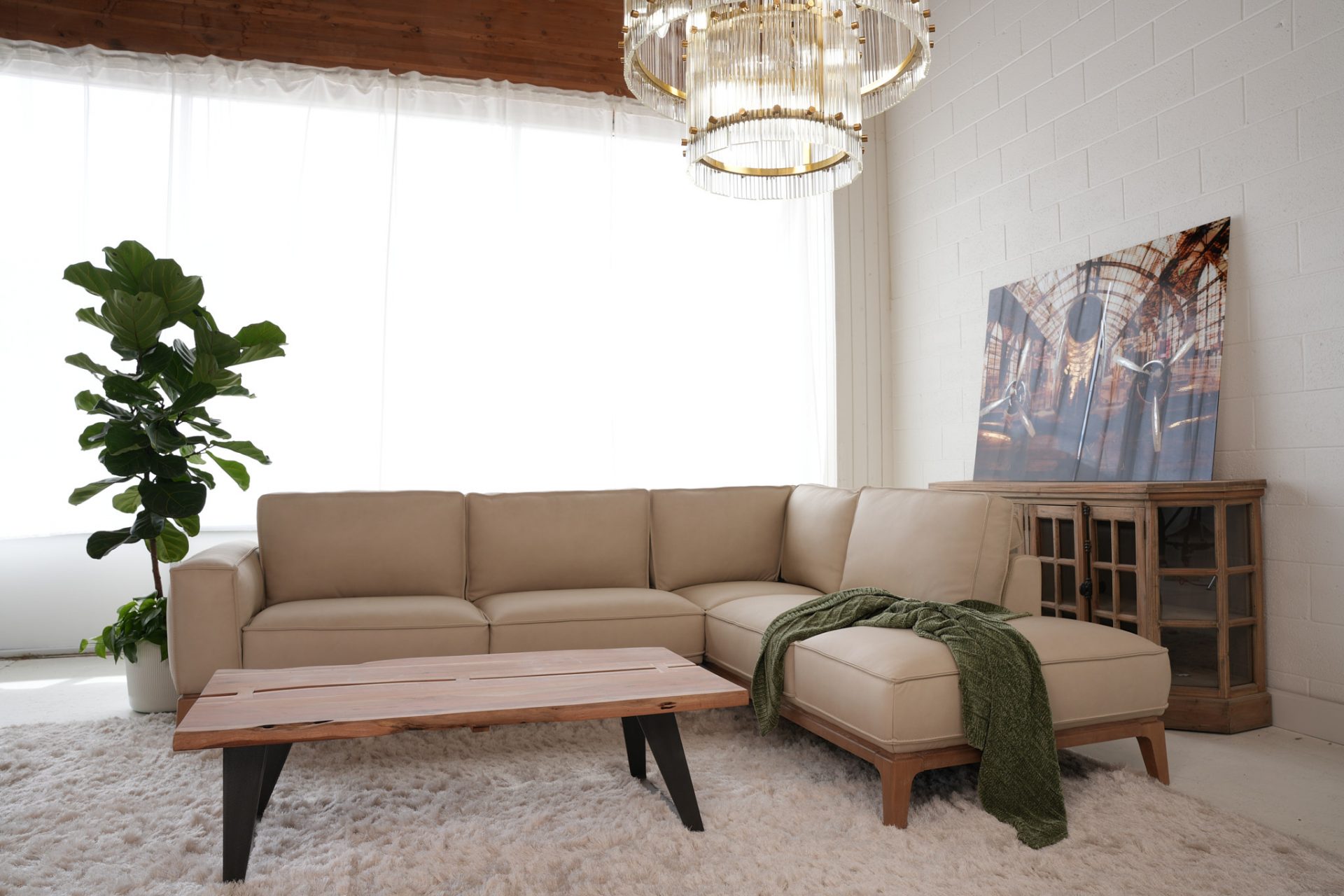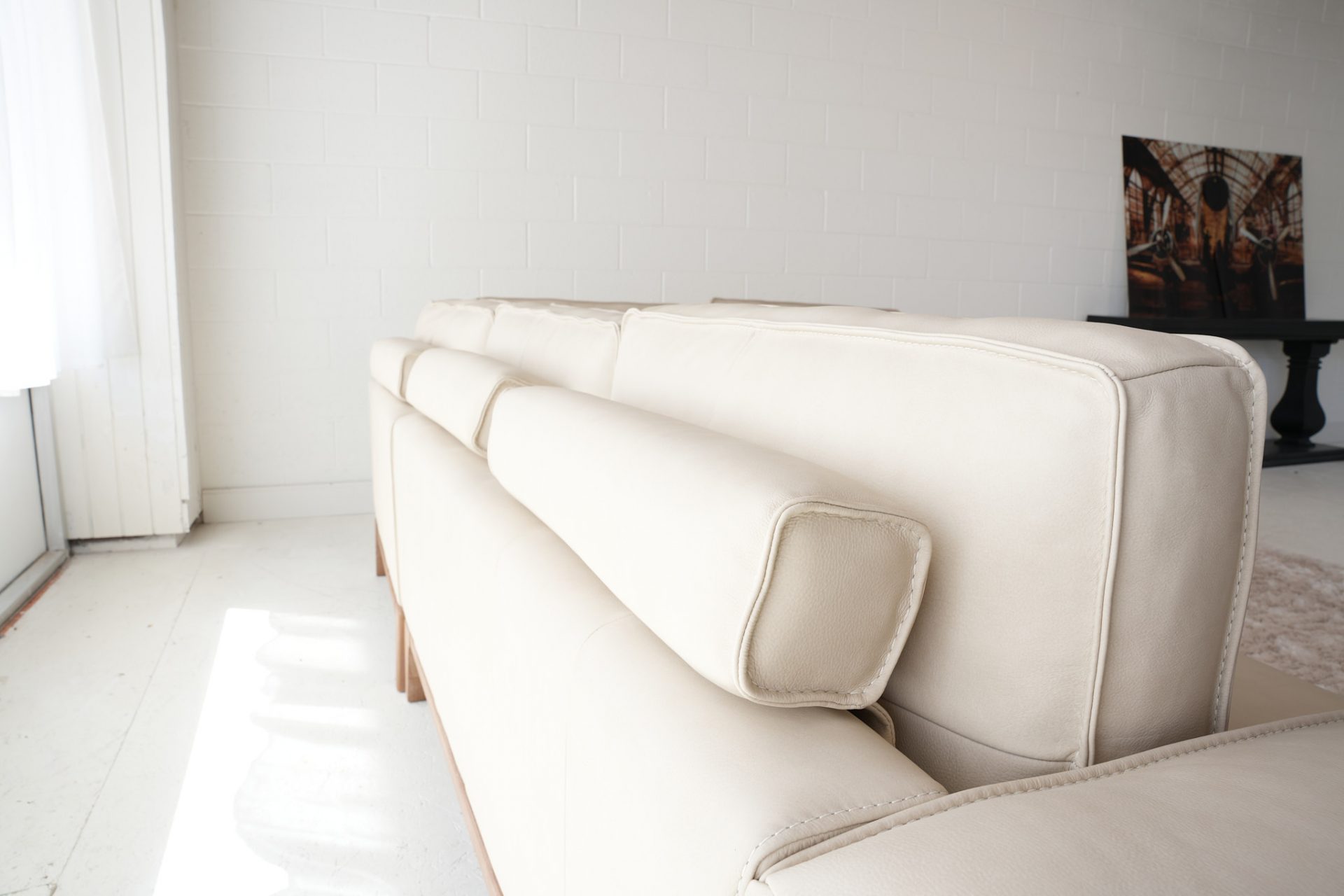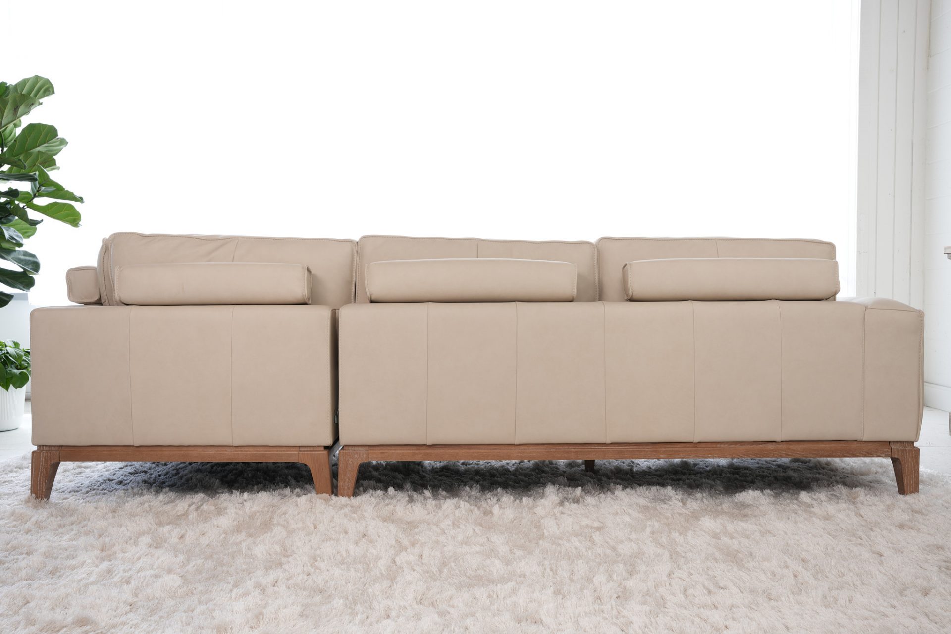 The Eden Leather Sectional is part of the Nest Furnishings Zen Collection. It is customizable in hundreds of fabrics or leathers. The elegant modern styling is complemented by a blond hardwood base and leg detail. The bolster pillows in the back add a fun detail and give a stylish back view, giving you the option to float this showpiece in your space. This sectional is substantive and well-built with a hardwood frame. The price depends on the leather or fabric grade. The price shown is for leather grade 10. See a Nest designer for customization details.