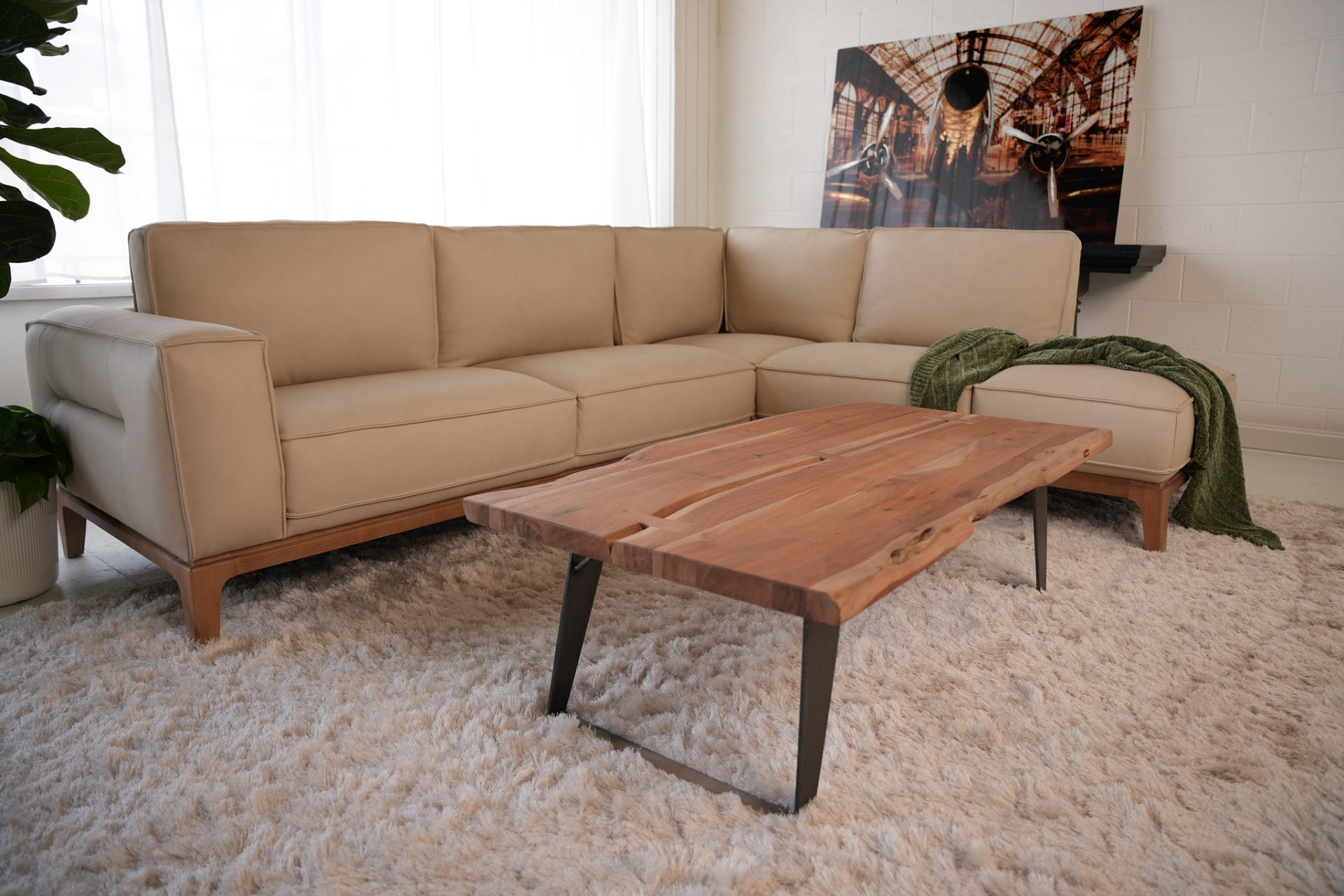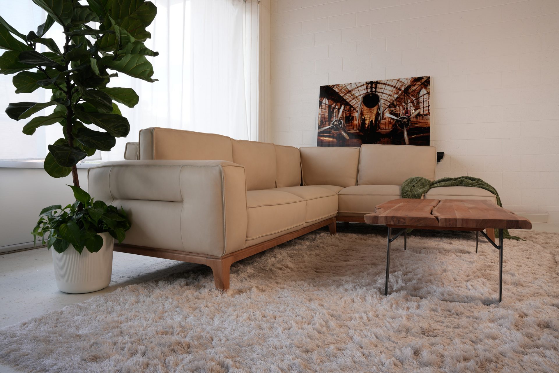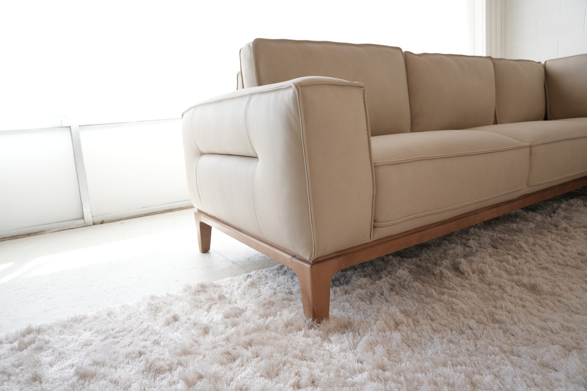 Leather modern customizable sectional with wood detail base and leg.