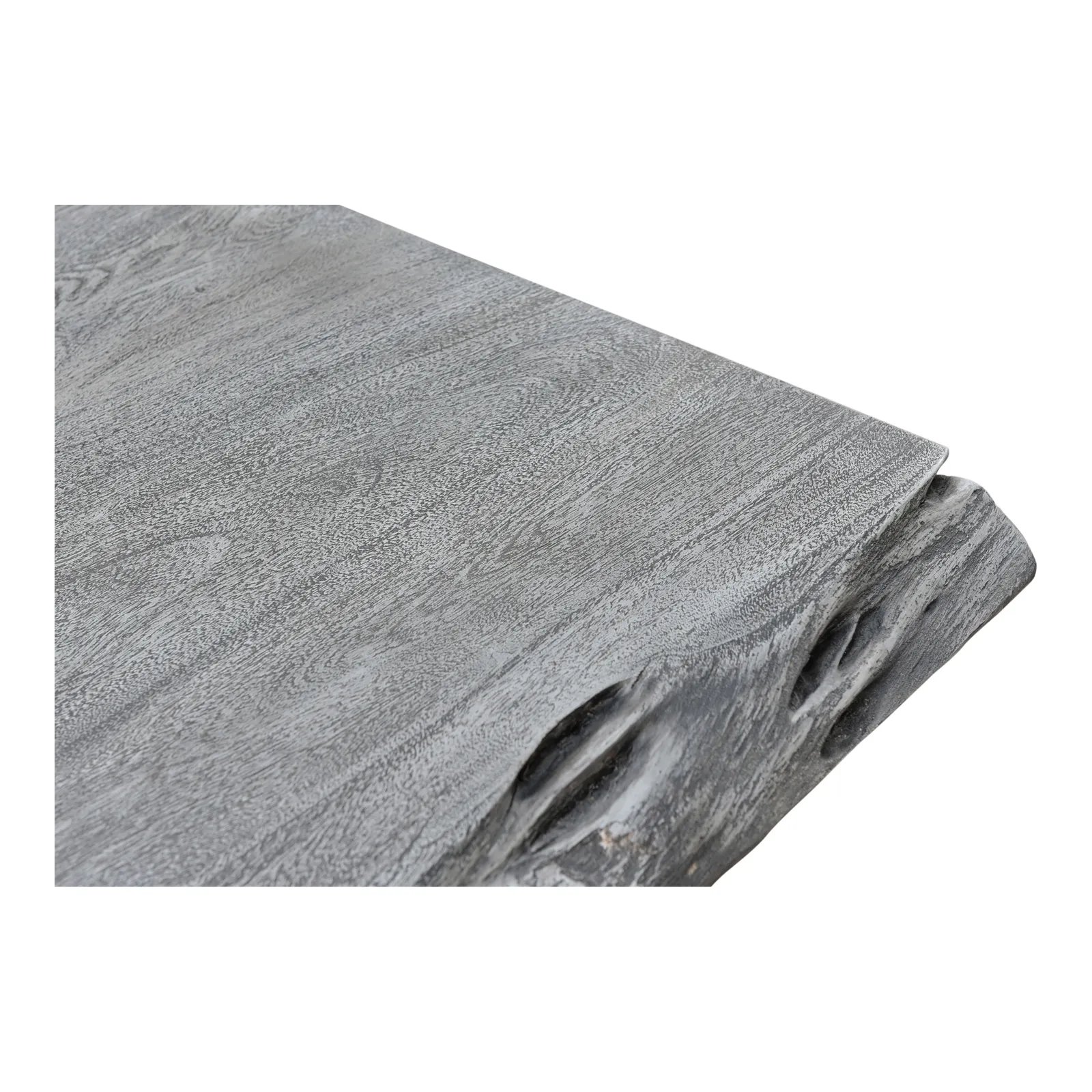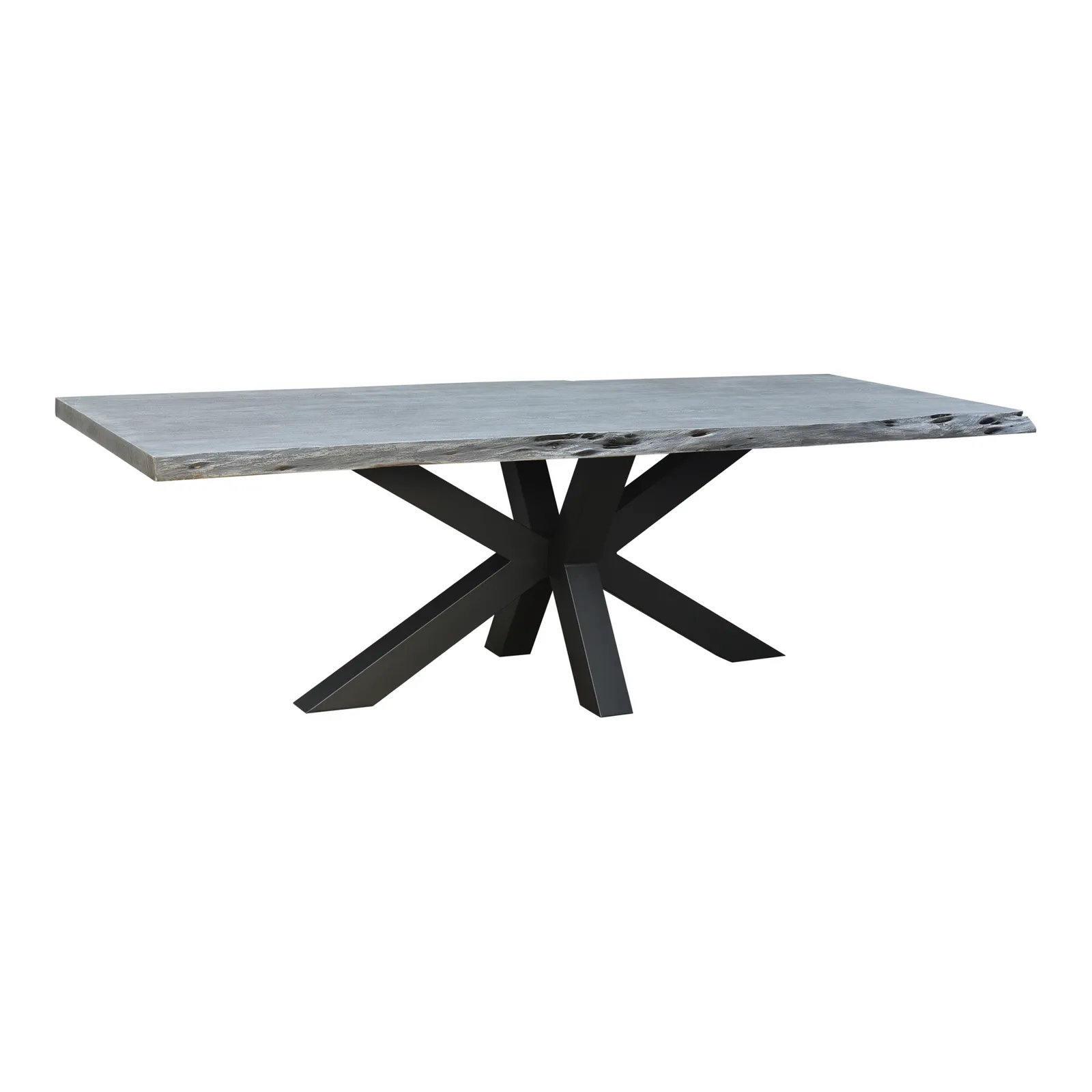 True to its namesake, the Edge Dining Table features a live edge. Thick slabs of solid acacia wood add a natural component to the grey stained wood. A solid iron base adds a contemporary modern twist.