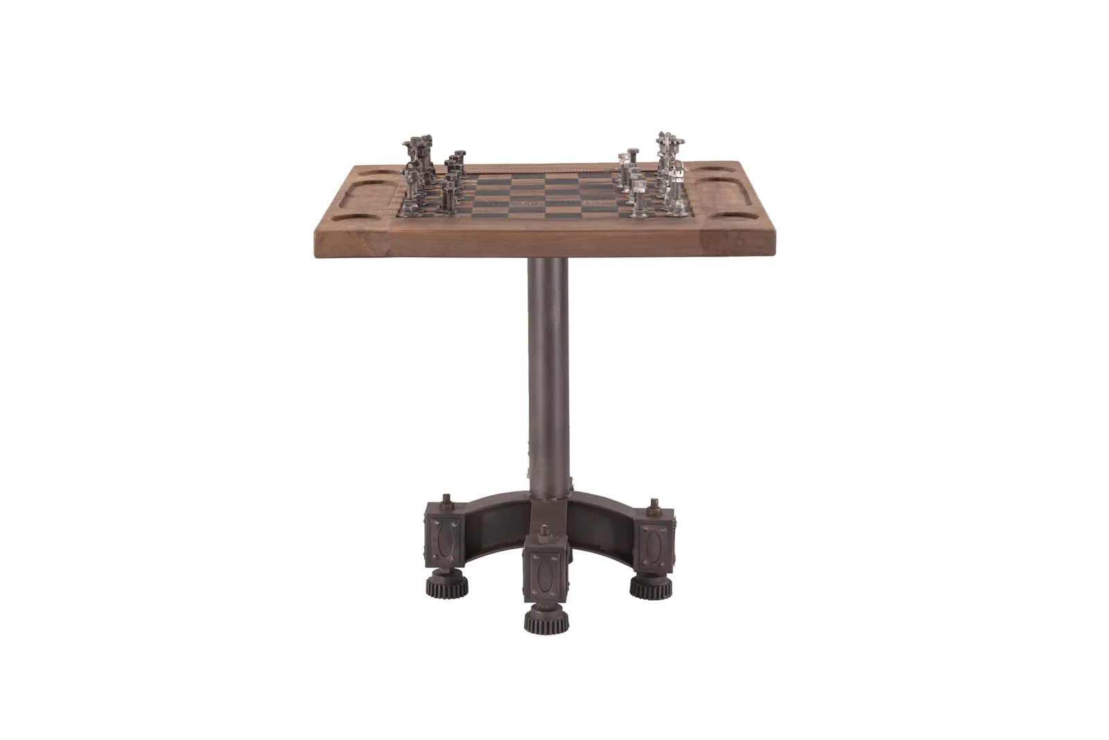 The Eiffel 30″ Chess Bistro Table showcases a bold industrial design with a chess-inspired tabletop. The chess pieces are creatively crafted from reclaimed materials, adding a unique eco-friendly touch. Supported by a sturdy metal base, this compact table is ideal for small spaces, cafes, or game rooms. It combines modern style with sustainable, playful sophistication.