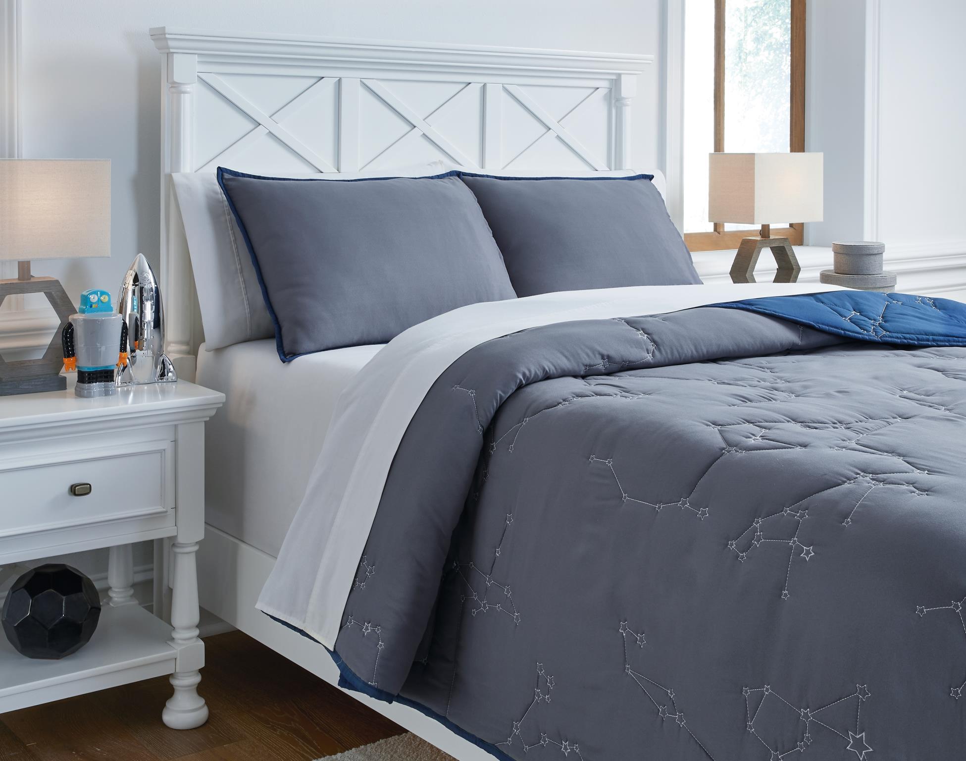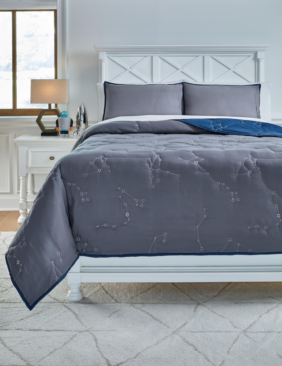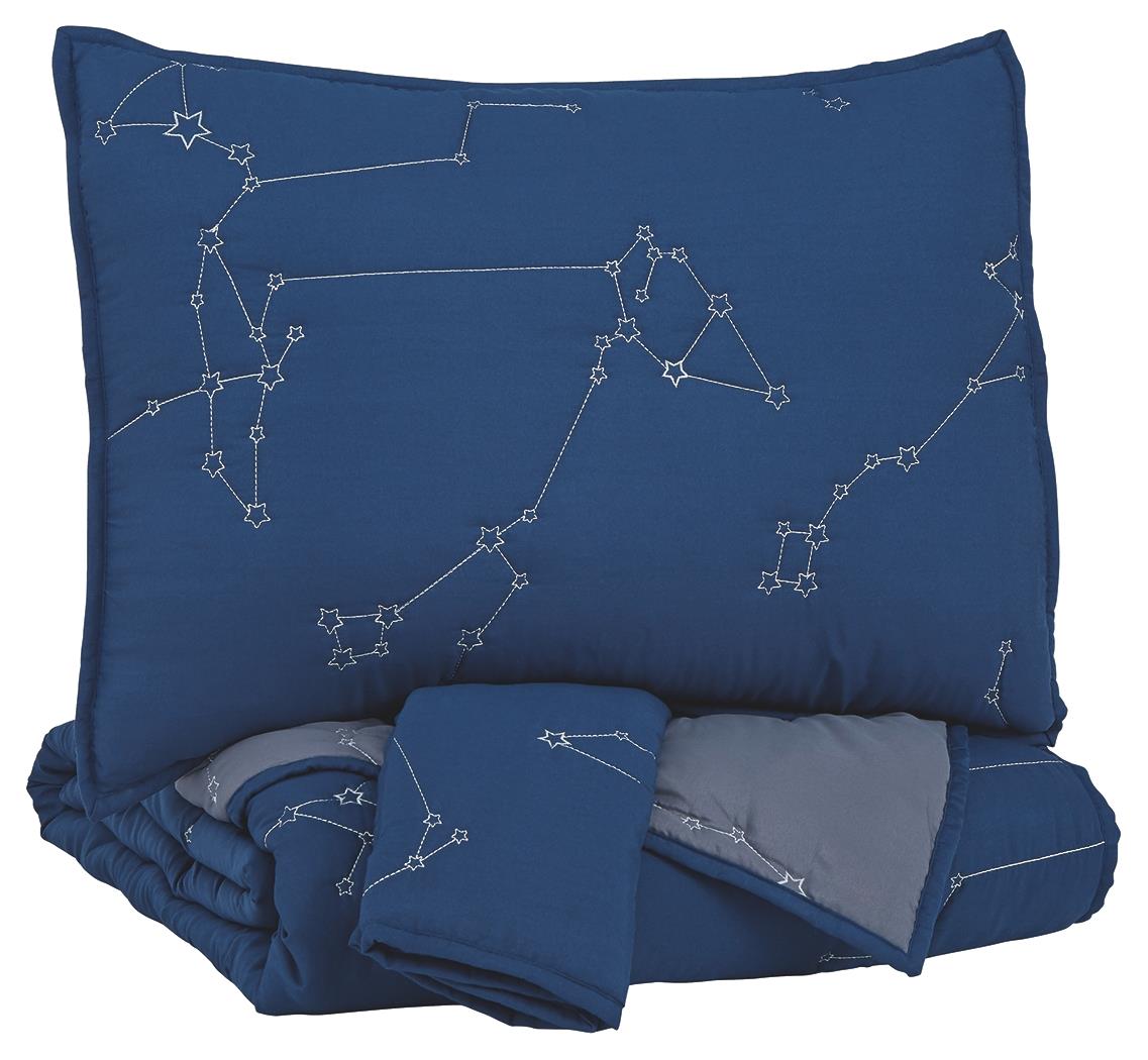 Create room for self-expression with this fun bedding set. Encourage your child’s interest in the stars and delight them with this comforter set. Solid navy and white embroidered constellations on one side reverses to gray with white embroidered constellations on the other. Rest assured,,,, they’ll happily drift off to dreamland in a space that’s uniquely theirs.