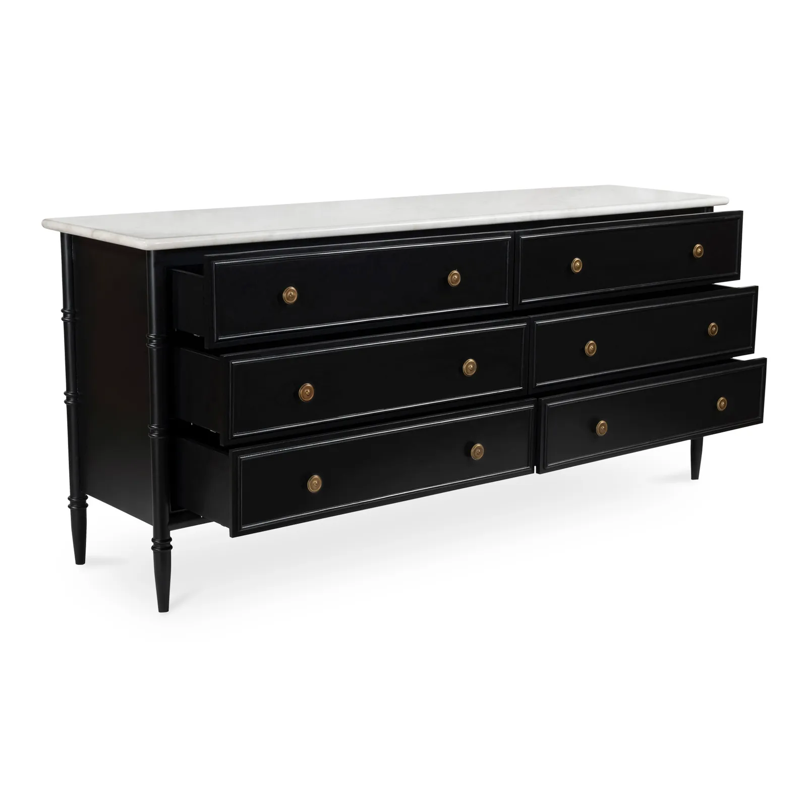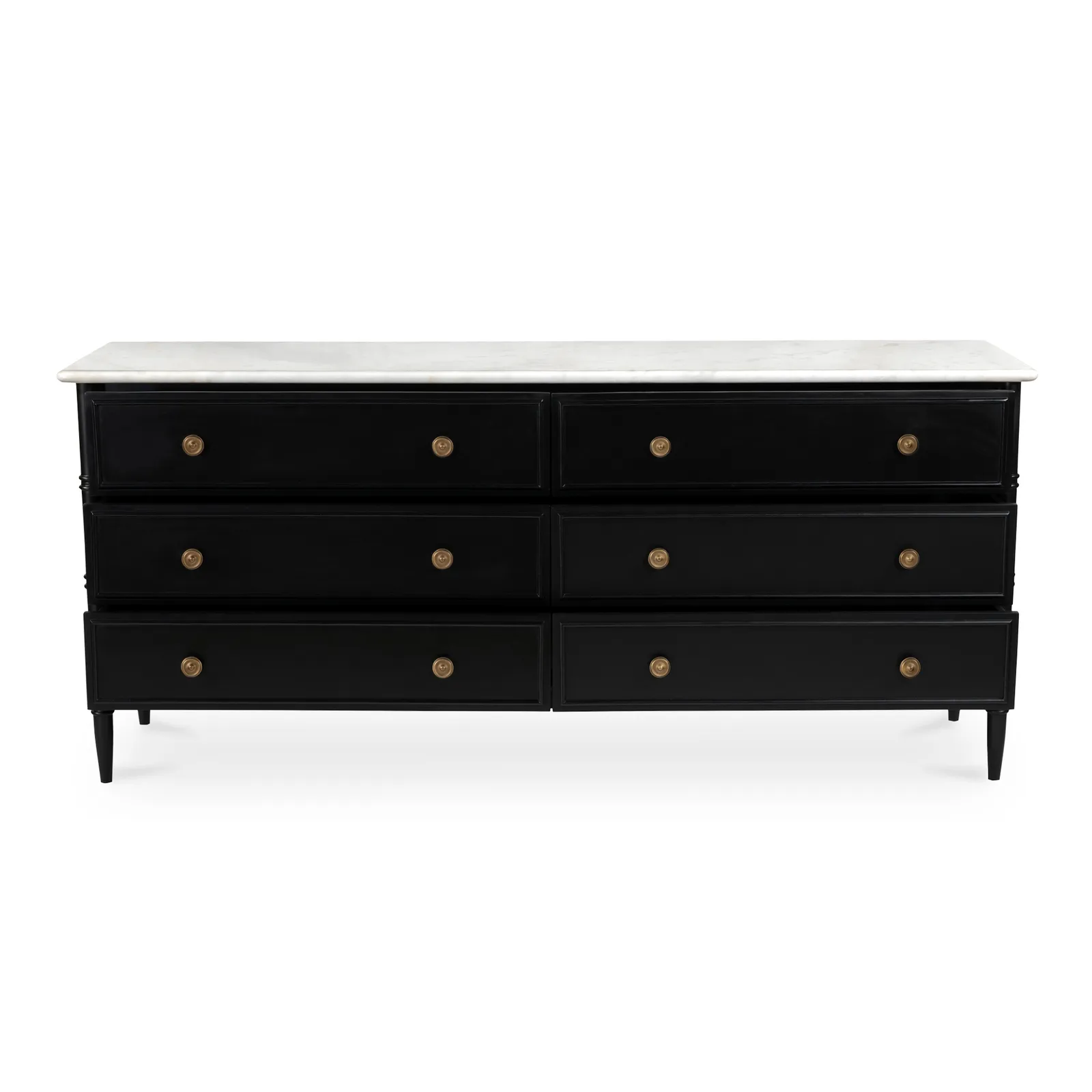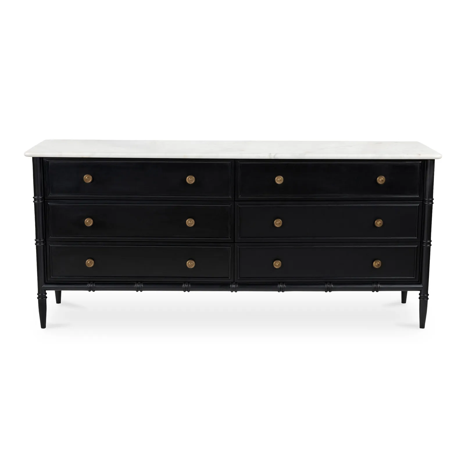 Inspired by the everyday grace of Provence style, the Eleanor 6-drawer chest showcases a classically graceful profile with distinctive turned details. Crafted from Mango wood, this piece is crowned with an expressive marble top and finished with solid antique finished brass finish handles, adding a touch of timeless sophistication and natural beauty.