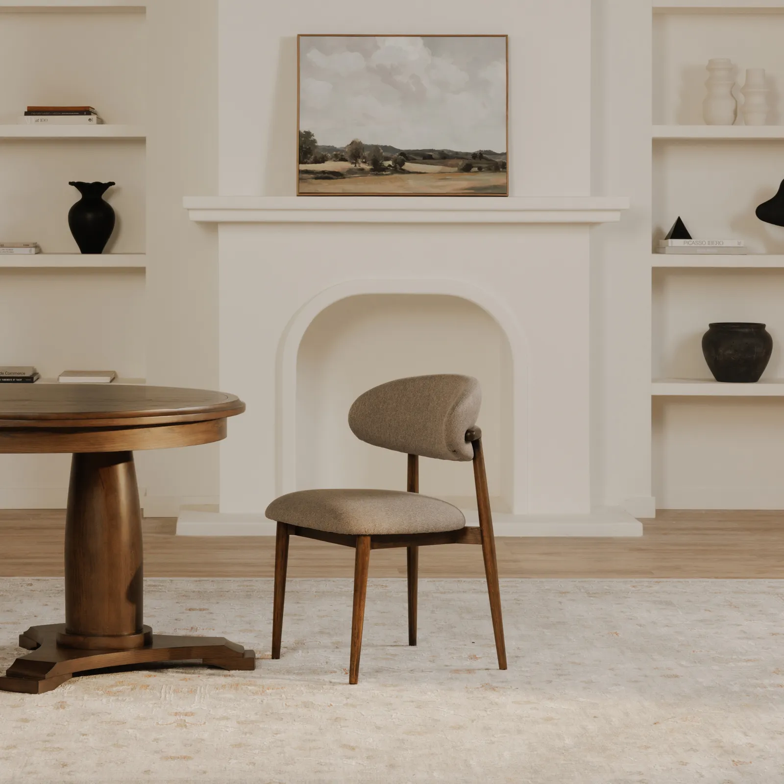 The Ellie dining chair features a padded winged backrest, a refined invitation to gather. A robust rubberwood frame bathed in a dark espresso brown finish harmonizes with the rustic, warm brown, easy-to-clean performance fabric upholstery, adding a vintage charm with modern convenience–a versatile design that complements a myriad of interior styles.