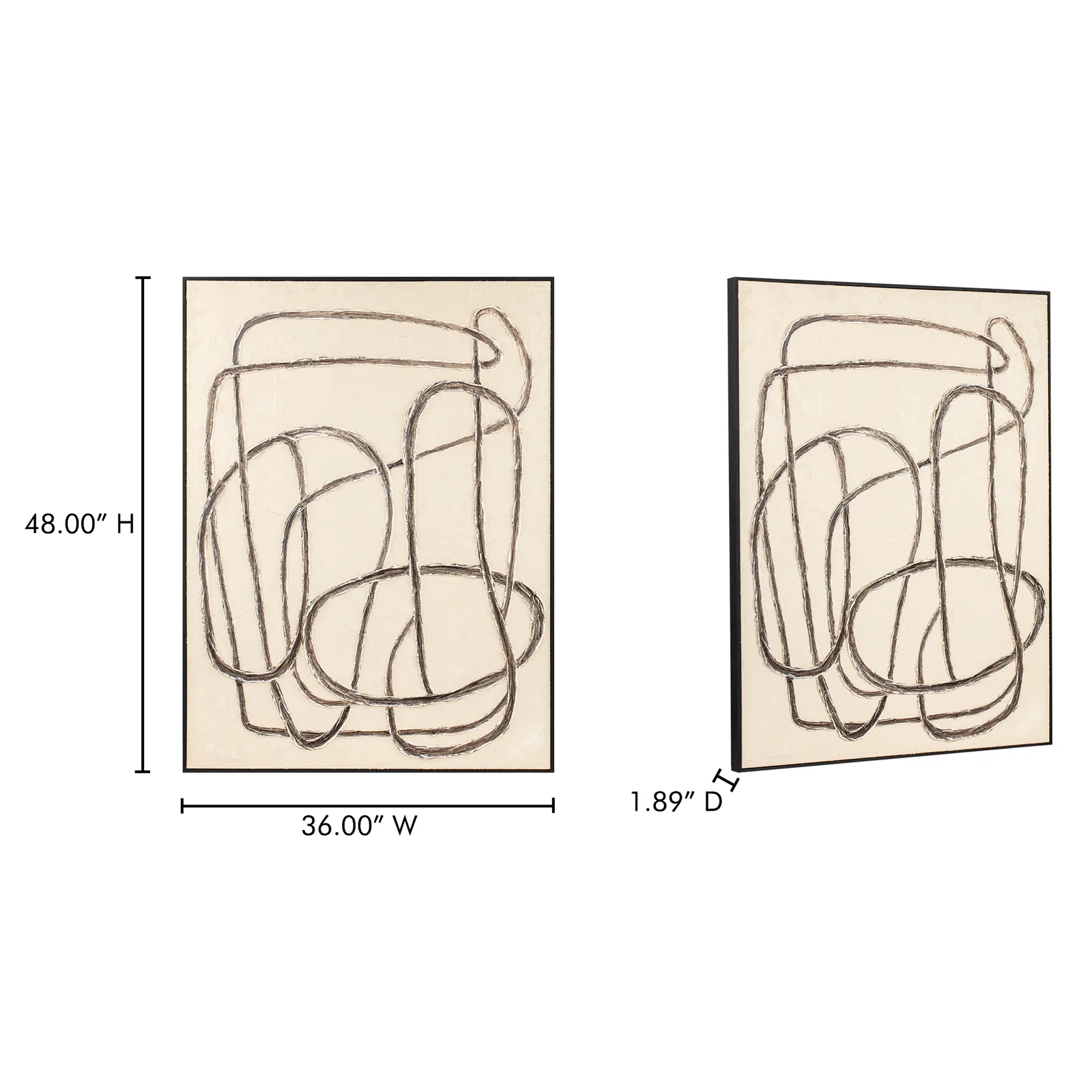 The Encounters framed painting features a looping line that weaves over and under itself in a mesmerizing dance of self-interaction. Crafted with depth in mind, the line work is ingeniously integrated within the acrylic paint, creating a profound sense of dimensionality. At the same time, its neutral color palette ensures a seamless fit into transitional homes.