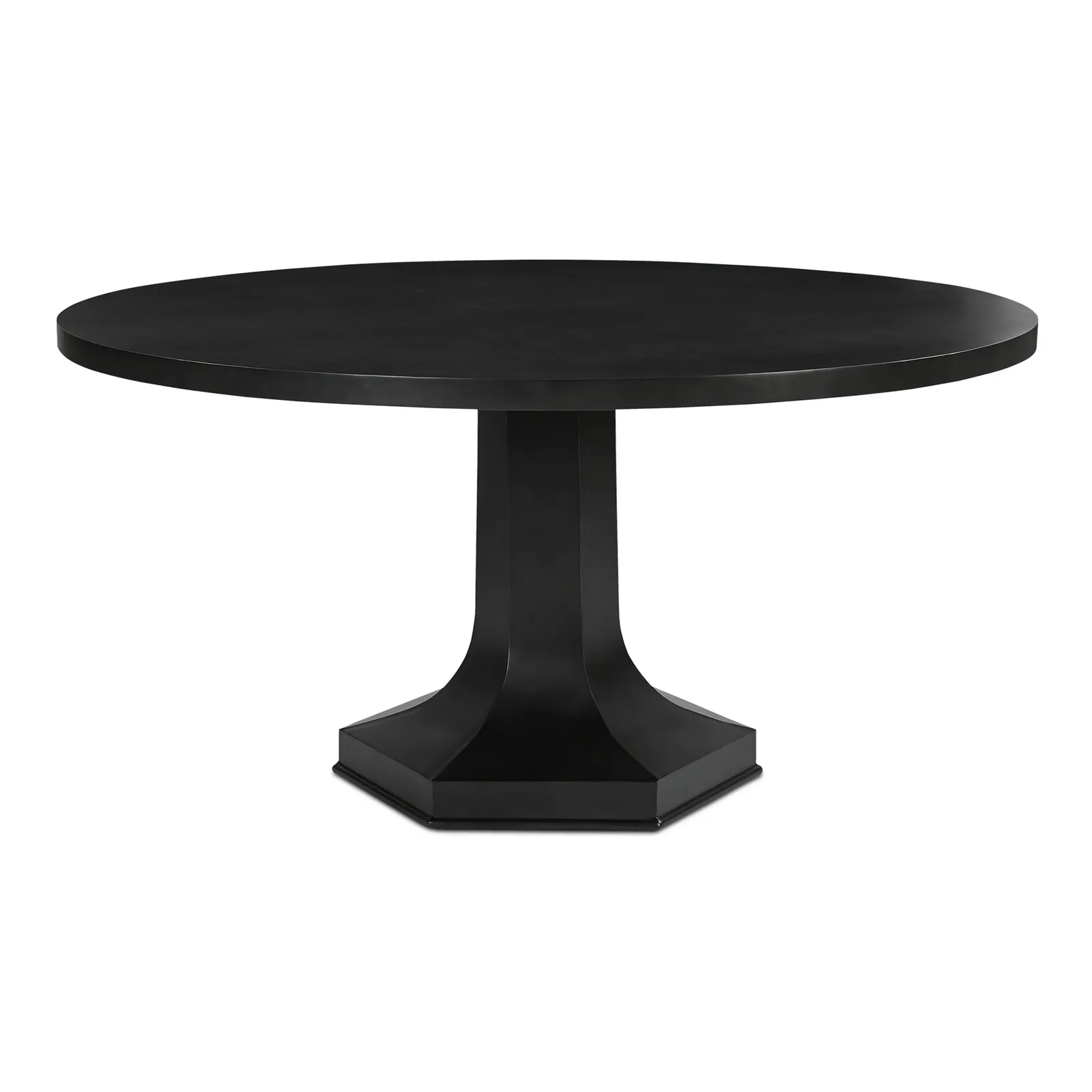The Ethan dining table blends geometric precision with fluid grace. Its substantial tabletop rests upon a hexagonal base with gently curving sides, creating a continuous silhouette that marries strength and elegance. Crafted entirely from cast iron with a rich black finish, this sophisticated focal point whispers graceful appeal.