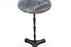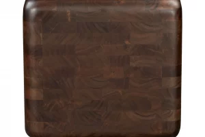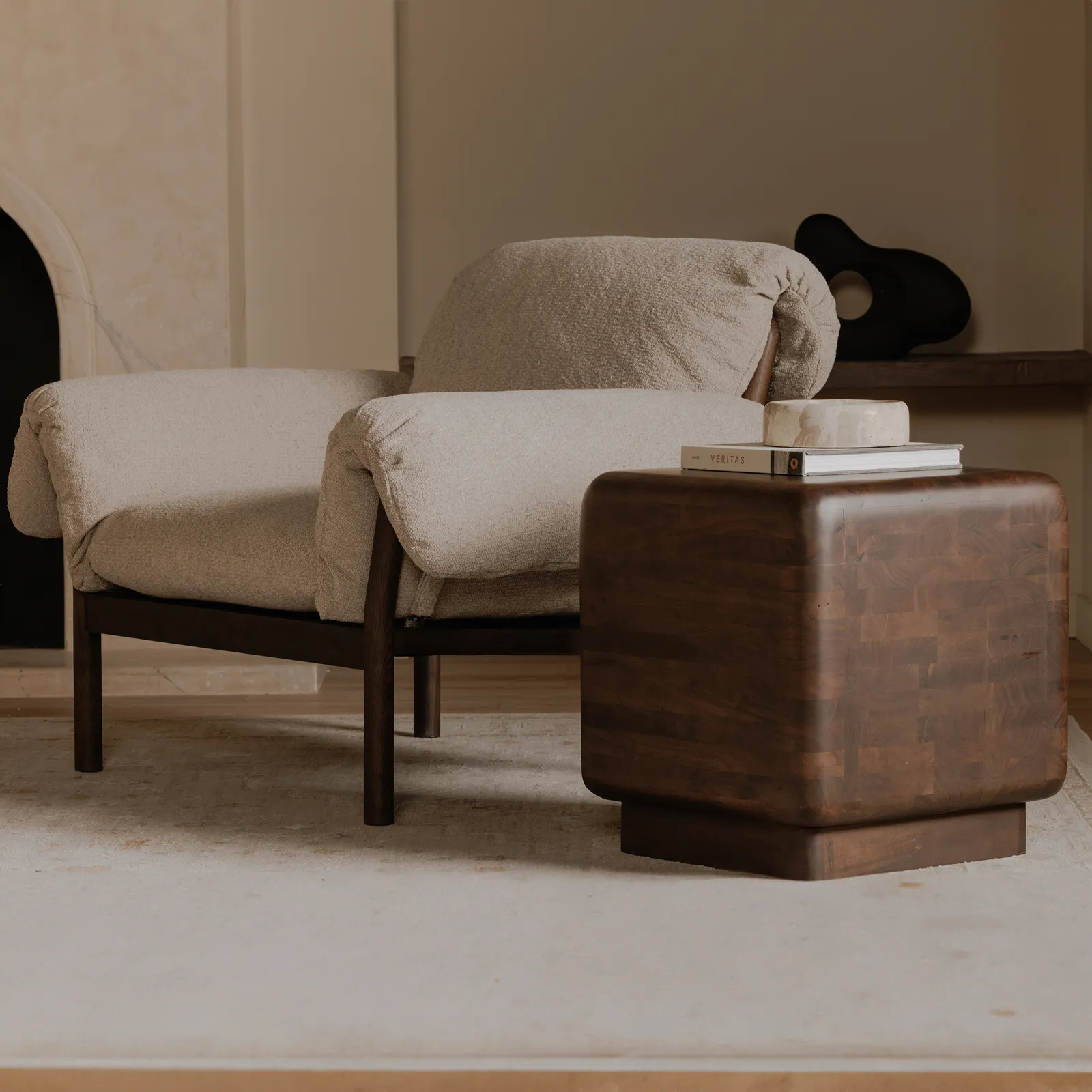The Eton side table is a study in contrasts, marrying bold geometry with gentle curves. Crafted from rich Acacia wood, the substantial top appears to float above a recessed base, creating visual intrigue. Each piece showcases unique grain patterns through its thoughtful design and natural beauty as its dark brown finish matures the overall look.