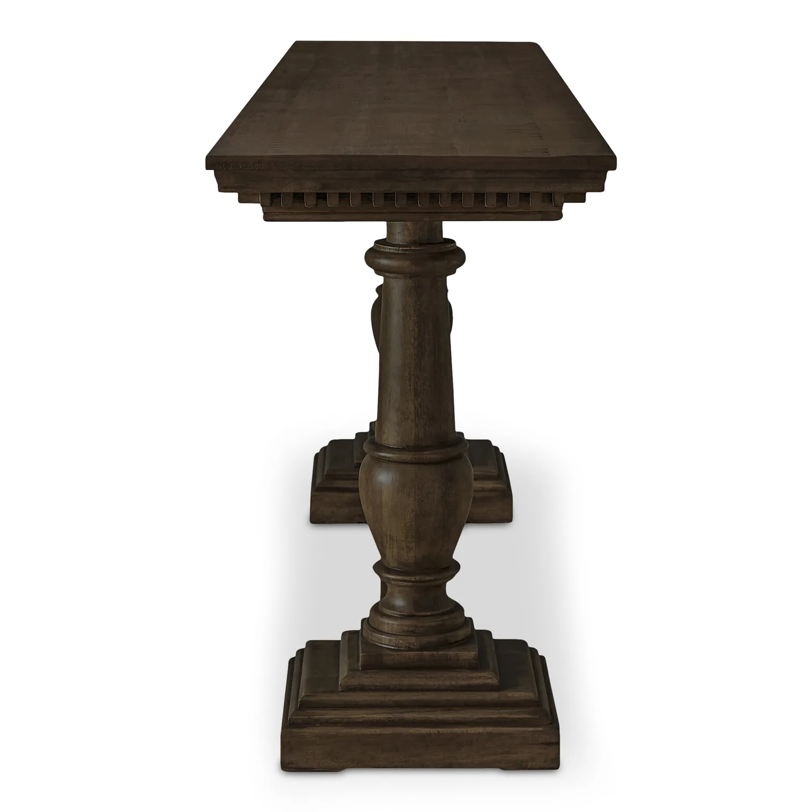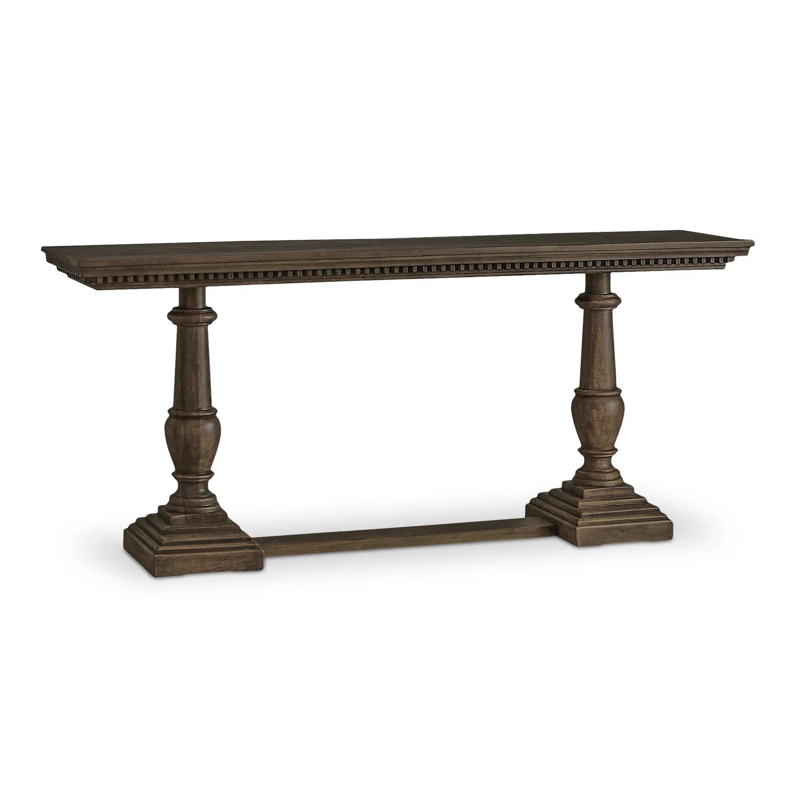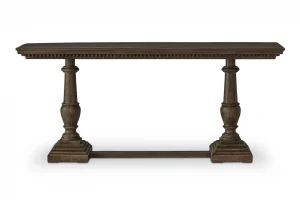 The Everson console table blends traditional elements with modern craftsmanship. Meticulously molded detailing and graceful leg profiles with a stretcher in between showcase its sophisticated design. Crafted from sustainable mango wood, the rich brown finish enhances the natural grain.