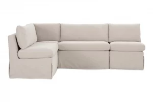 The Fable slipcover dining banquette L-shape’s snug-fitting, washable slipcover with inverted pleats offers a tidy appearance and effortless upkeep. A slight tilt encourages a relaxed seating posture with a pillow back and seat cushions for comfort. Designed to be modular, it includes alligator clips to connect with other pieces in the collection, adapting seamlessly to various dining table sizes.