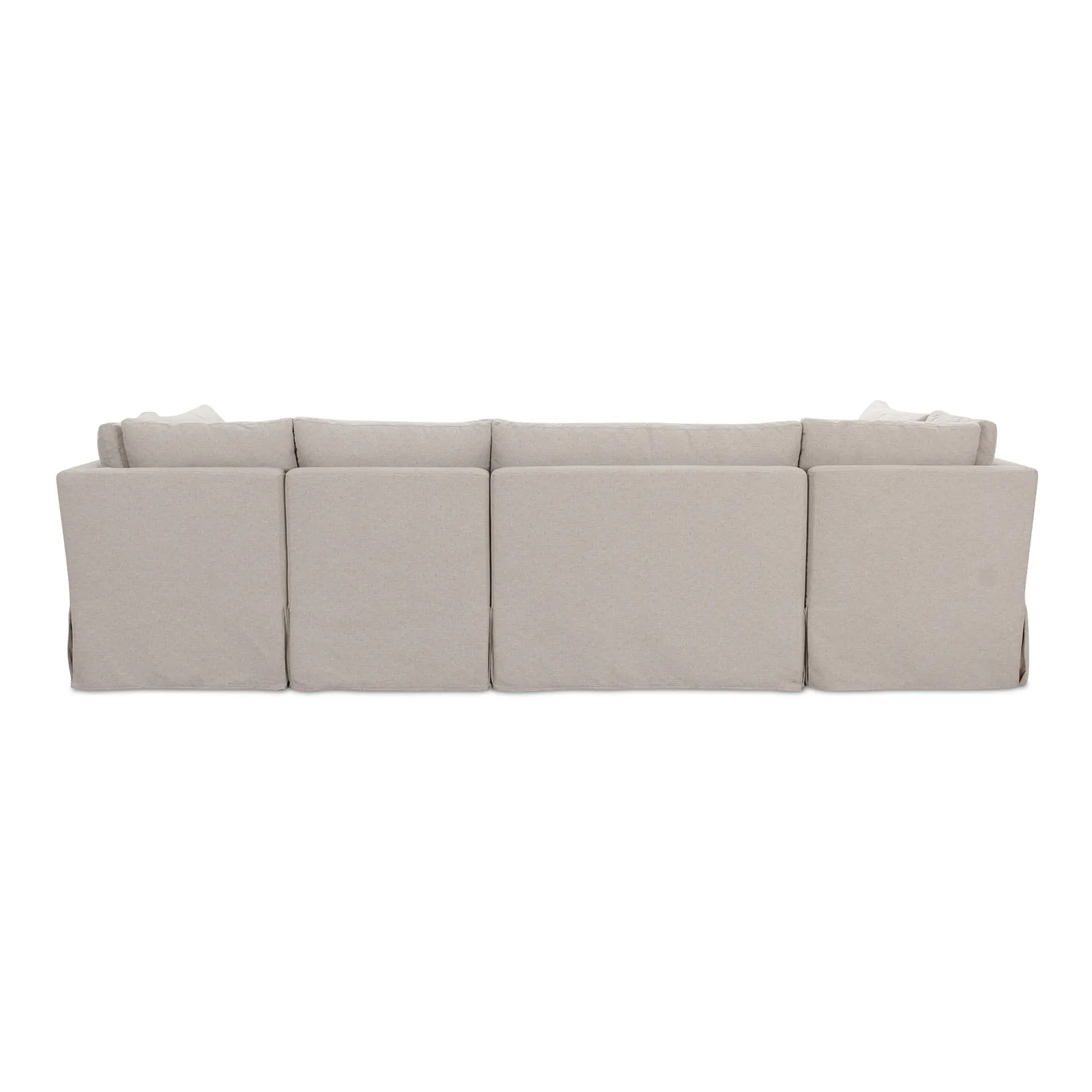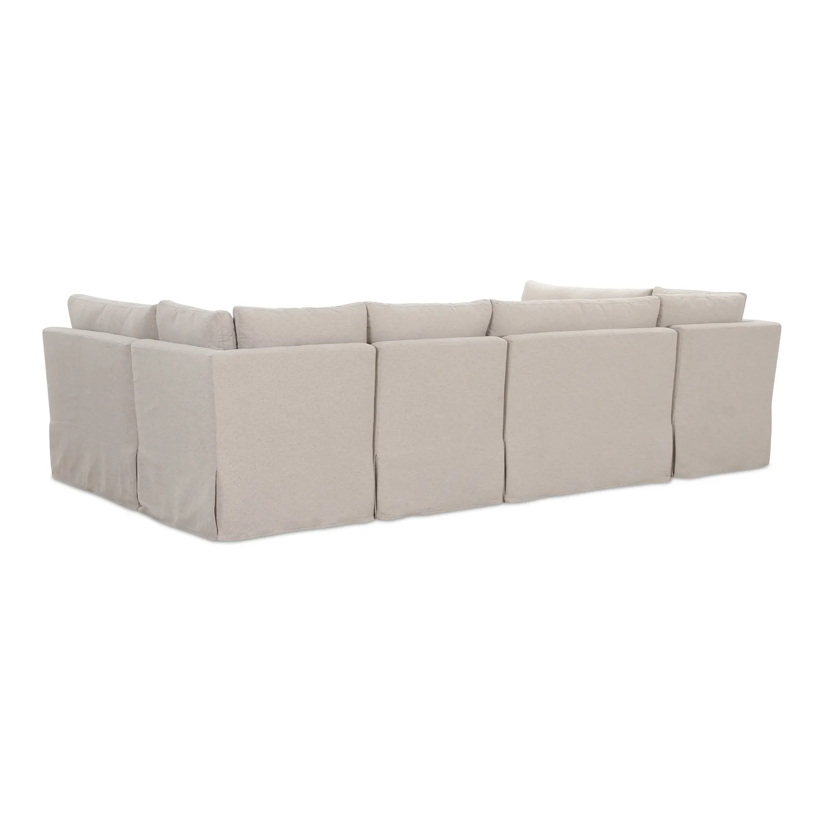 The Fable slipcover dining banquette U-shape’s snug-fitting, washable slipcover with inverted pleats offers a tidy appearance and effortless upkeep. A slight tilt encourages a relaxed seating posture with a pillow back and seat cushions for comfort. Designed to be modular, it includes alligator clips to connect with other pieces in the collection, adapting seamlessly to various dining table sizes.