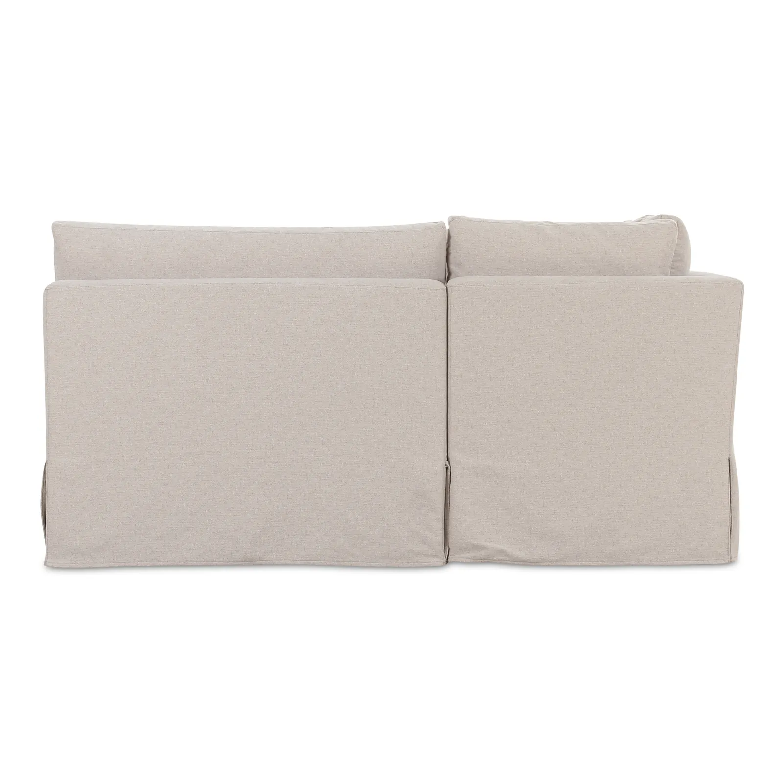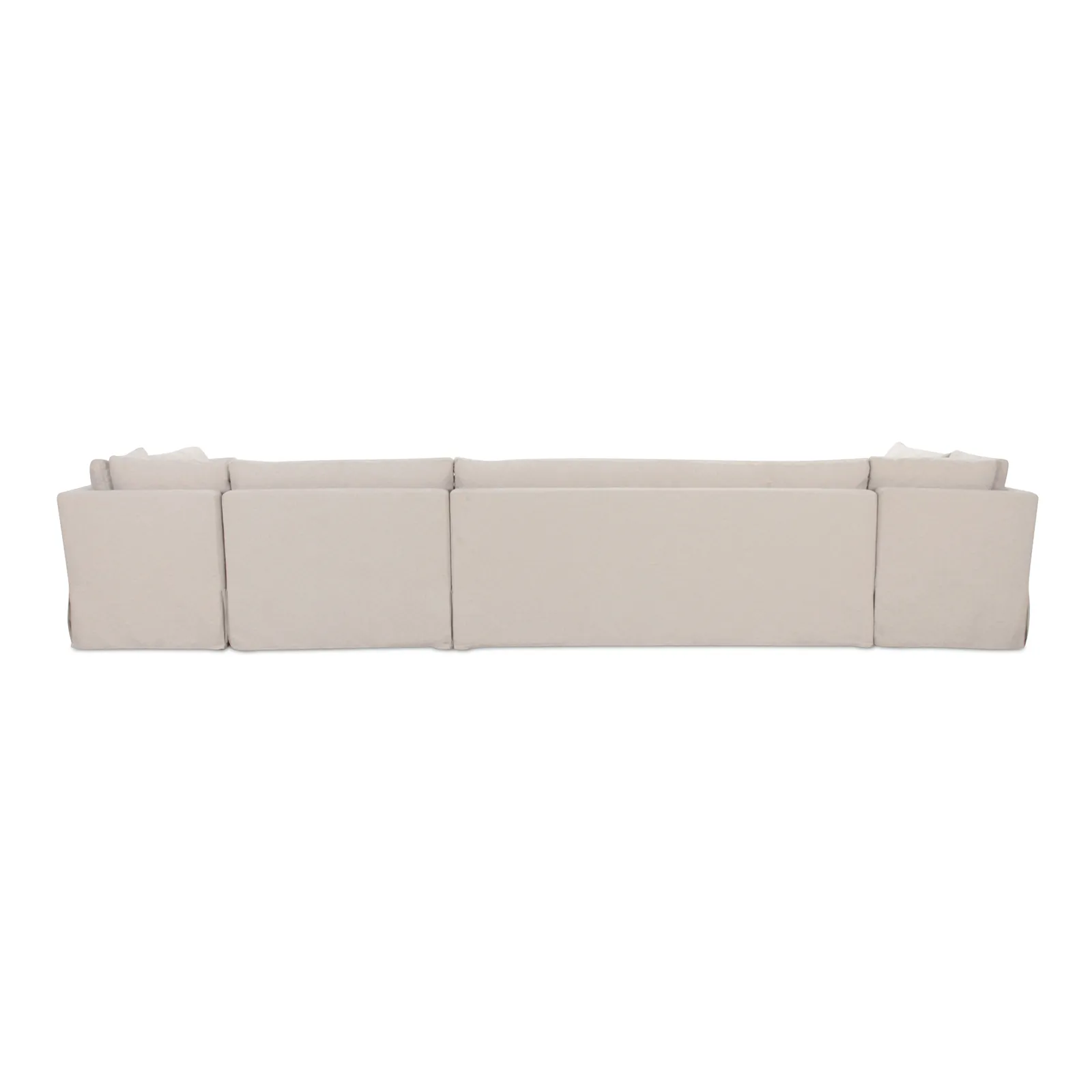 The Fable slipcover dining banquette U-shape’s snug-fitting, washable slipcover with inverted pleats offers a tidy appearance and effortless upkeep. A slight tilt encourages a relaxed seating posture with a pillow back and seat cushions for comfort. Designed to be modular, it includes alligator clips to connect with other pieces in the collection, adapting seamlessly to various dining table sizes.