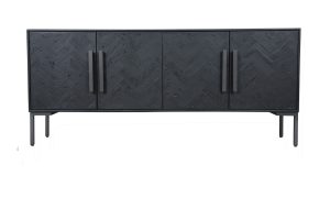 Clean lines with sleek sophistication, this credenza sidelines a timeless design for continuous style and function. Full-sized, the Fishbone sideboard is made from reclaimed mango wood with a herringbone pattern shaped into its warm, darkened up design. Mounted on a sturdy pewter finished iron frame, its 4 cabinet doors swing open to reveal welcoming storage compartments for your dining ware, bar supplies, whatever you need to be stored safely away.