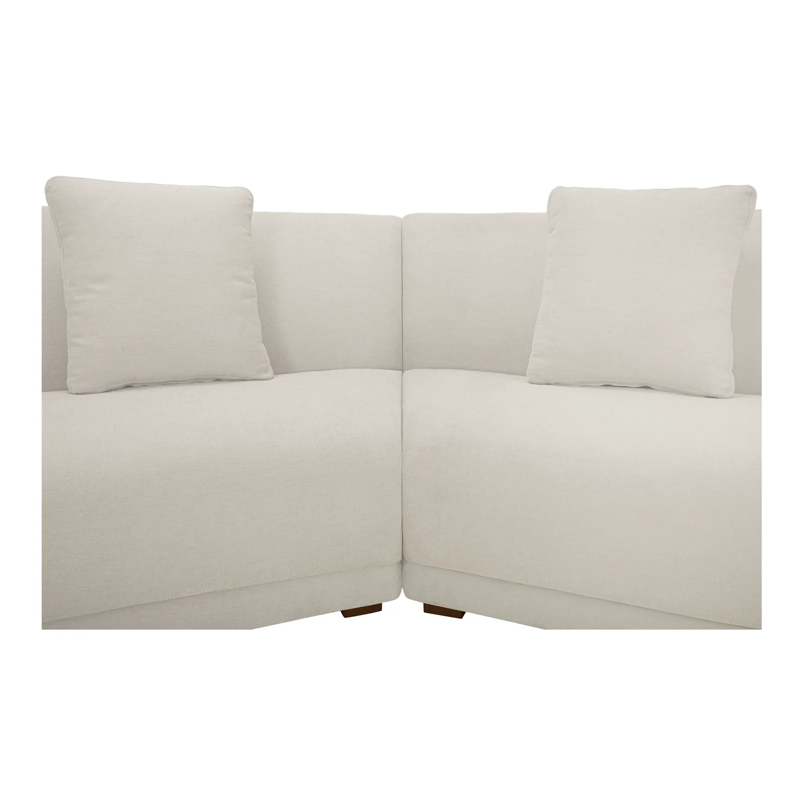 The Fraser sectional’s contemporary modular design infuses the elegance of gentle slopes with linear precision, harmoniously merging soft curves and angular forms into its 60s and 70s-inspired aesthetic. Crafted on a minimalist plinth base and upholstered in sumptuous 100% polyester, foam and fiber seating invites serene repose.