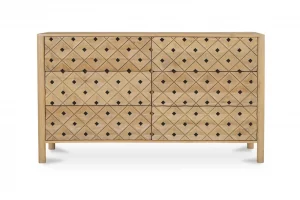 Carved from solid mango wood, the Fulton 6-drawer dresser’s geometric, off-centered front creates a striking focal point. Six spacious push-to-open drawers offer effortless functionality. The natural finish showcases the wood’s rich grain, celebrating its inherent beauty.