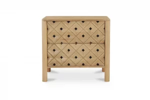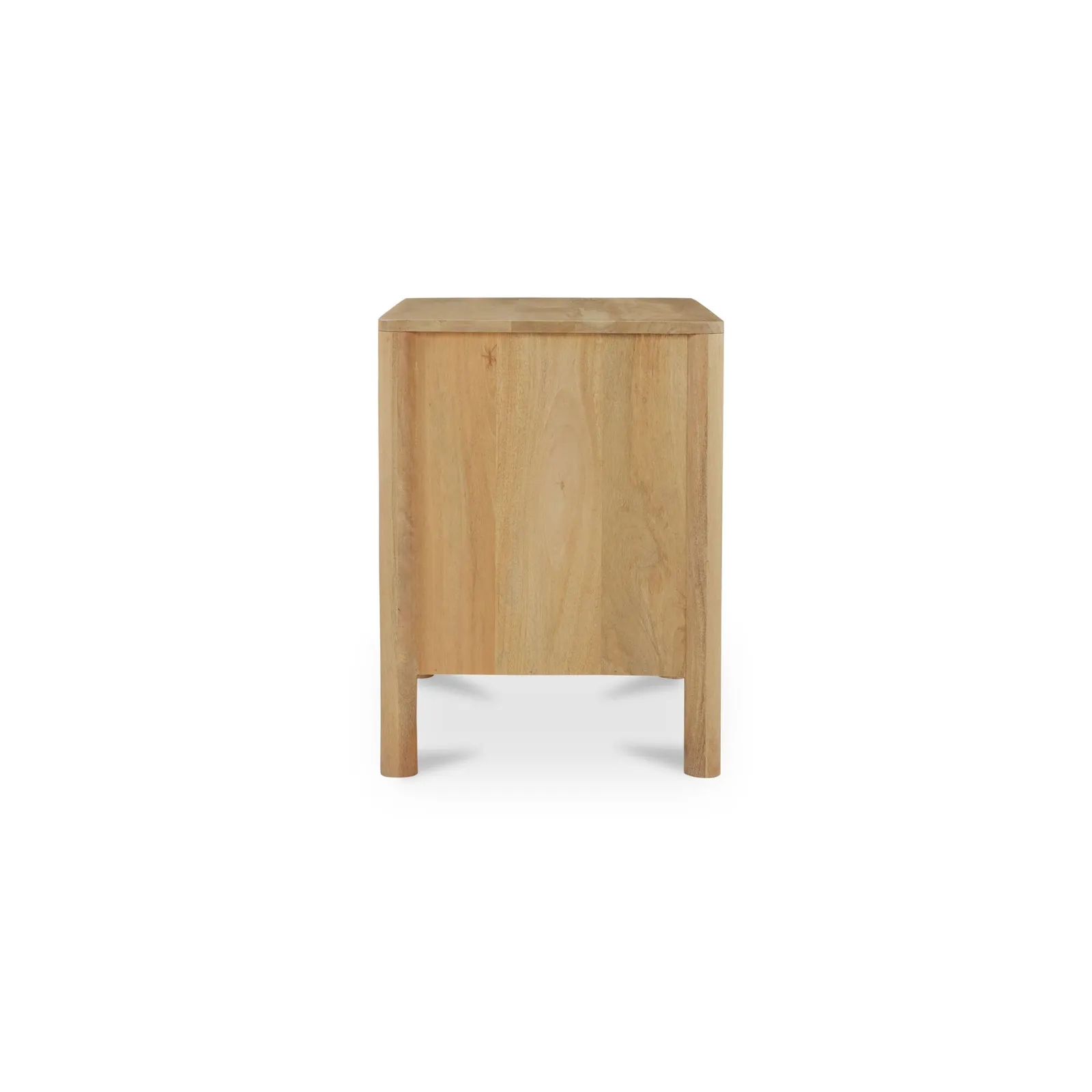 Carved from solid mango wood, the Fulton nightstand’s geometric, off-centered front creates a striking focal point. Two push-to-open drawers offer effortless functio nality. The natural finish showcases the wood’s rich grain, celebrating its inherent beauty.