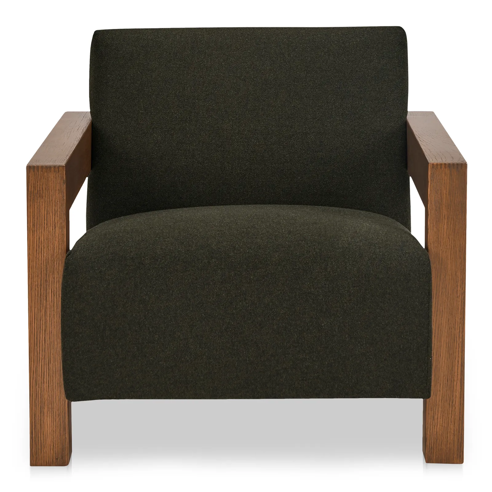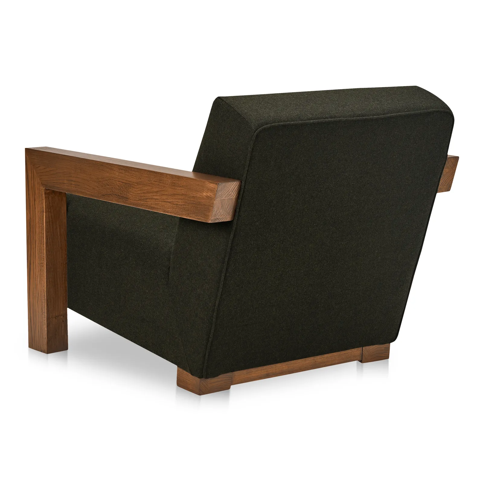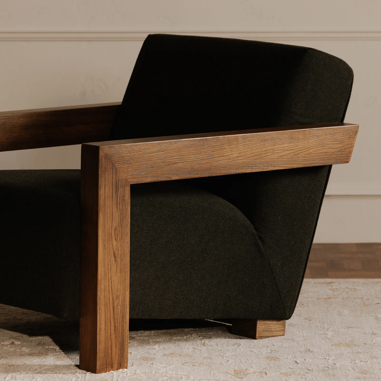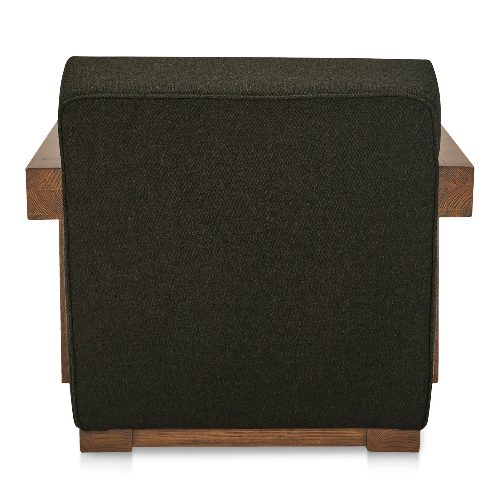 Crafted with a solid oak frame and detailed in a warm, aged stain highlighting its expressive grain, the Garnet lounge chair showcases a soft wool blend upholstery for a touch of heritage feel. Its blocky form blends traditional and retro aesthetics, creating a warm, inviting piece that complements any setting.