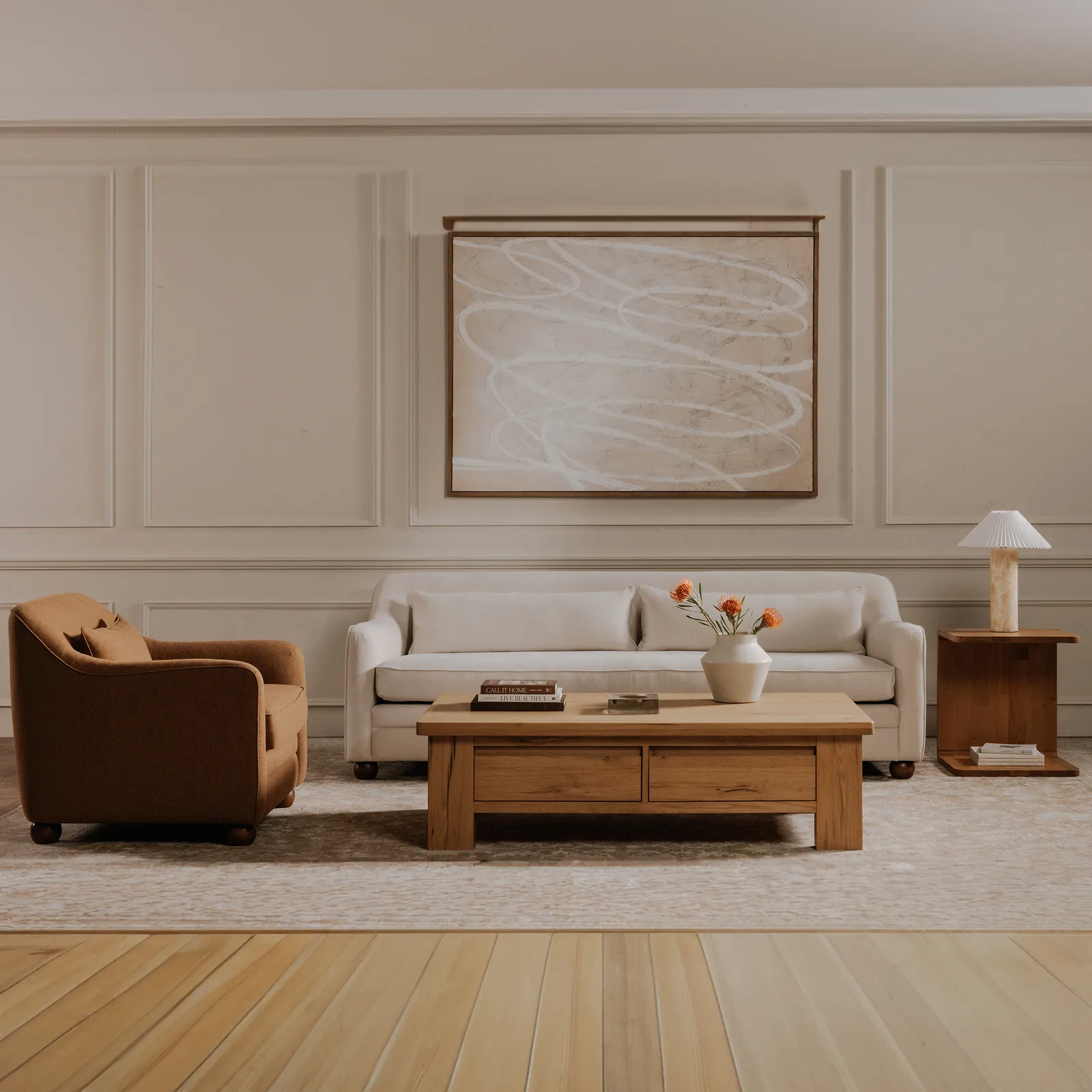 The Graham coffee table reimagines the classic trunk coffee table design with contemporary elegance. Crafted from premium oak with a rustic finish, its rounded tabletop softens the sleek silhouette, while straight legs provide eye-catching contrast. Two discreet drawers offer versatile storage, accessible from either side.