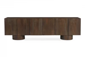 Crafted from reclaimed neem wood, the Hadley media unit celebrates simplicity and natural beauty. Its minimalist silhouette features a substantial 2-inch tabletop and cylindrical bases, artfully balancing form and function. Six sleek doors conceal ample storage, while thoughtful cable management ensures seamless integration.