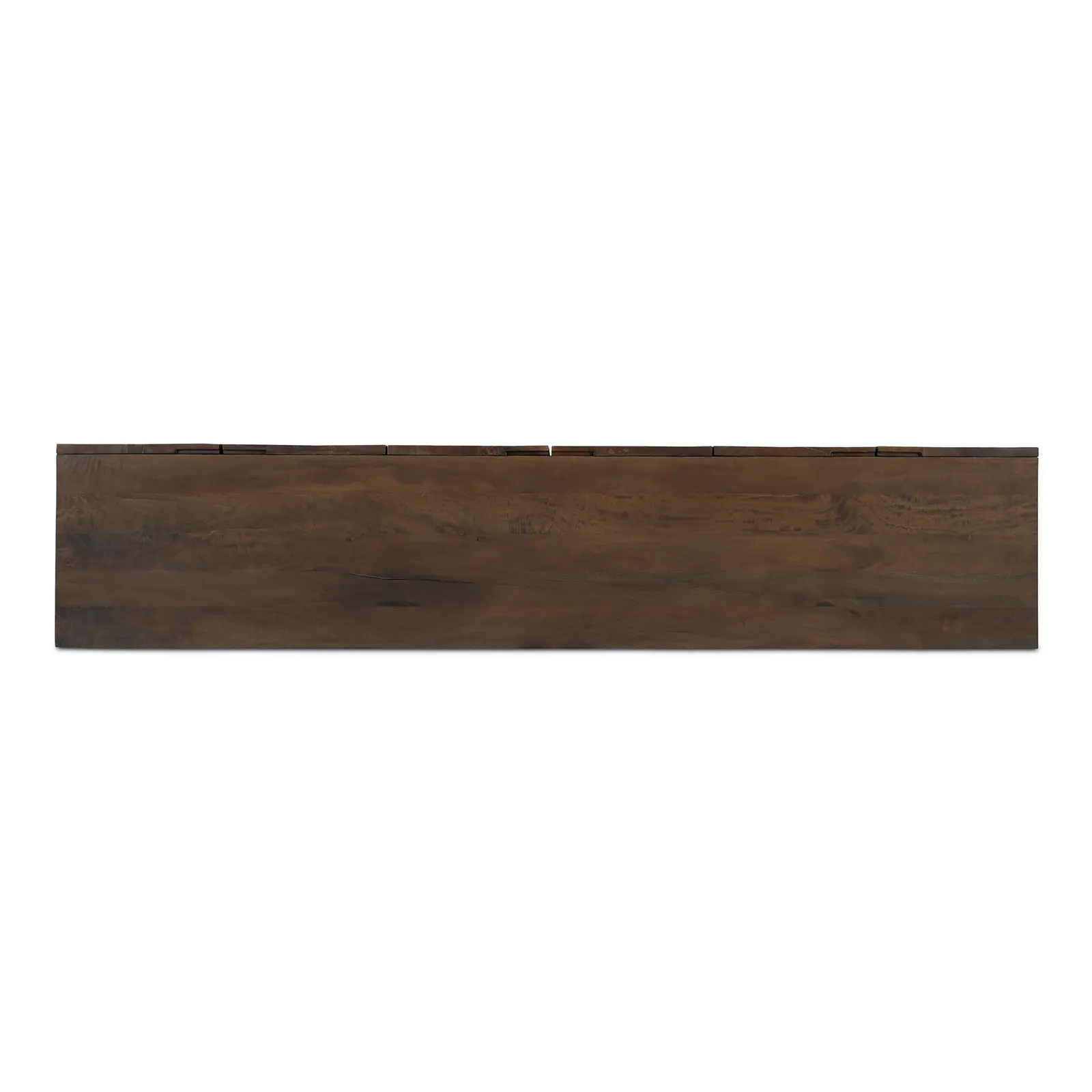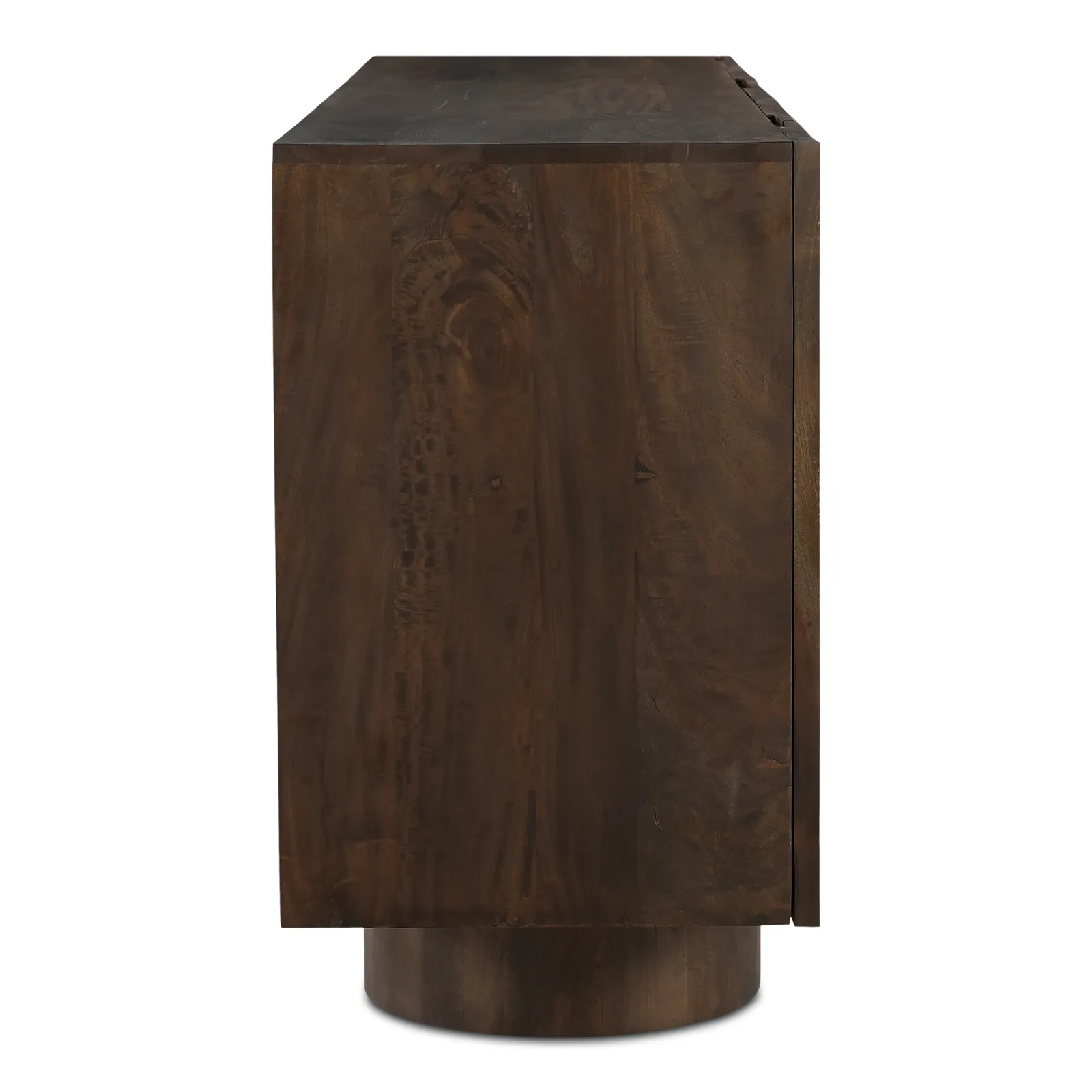Crafted from reclaimed neem wood, the Hadley sideboard top rests on robust cylindrical bases, grounding the piece with quiet confidence. Six generous doors featuring integrated handles reveal ample storage, while its warm hue and natural wood variations create a uniquely inviting ambiance.