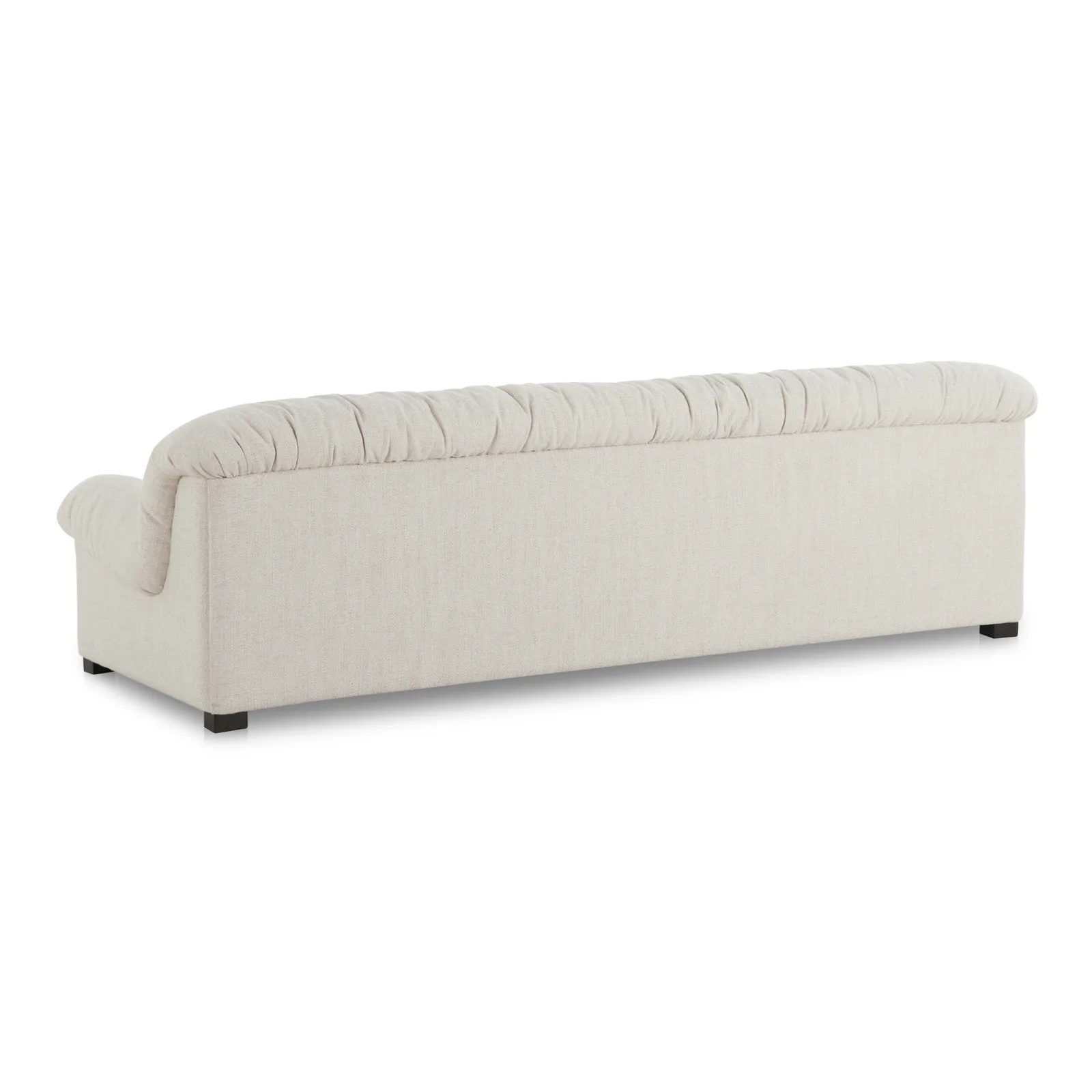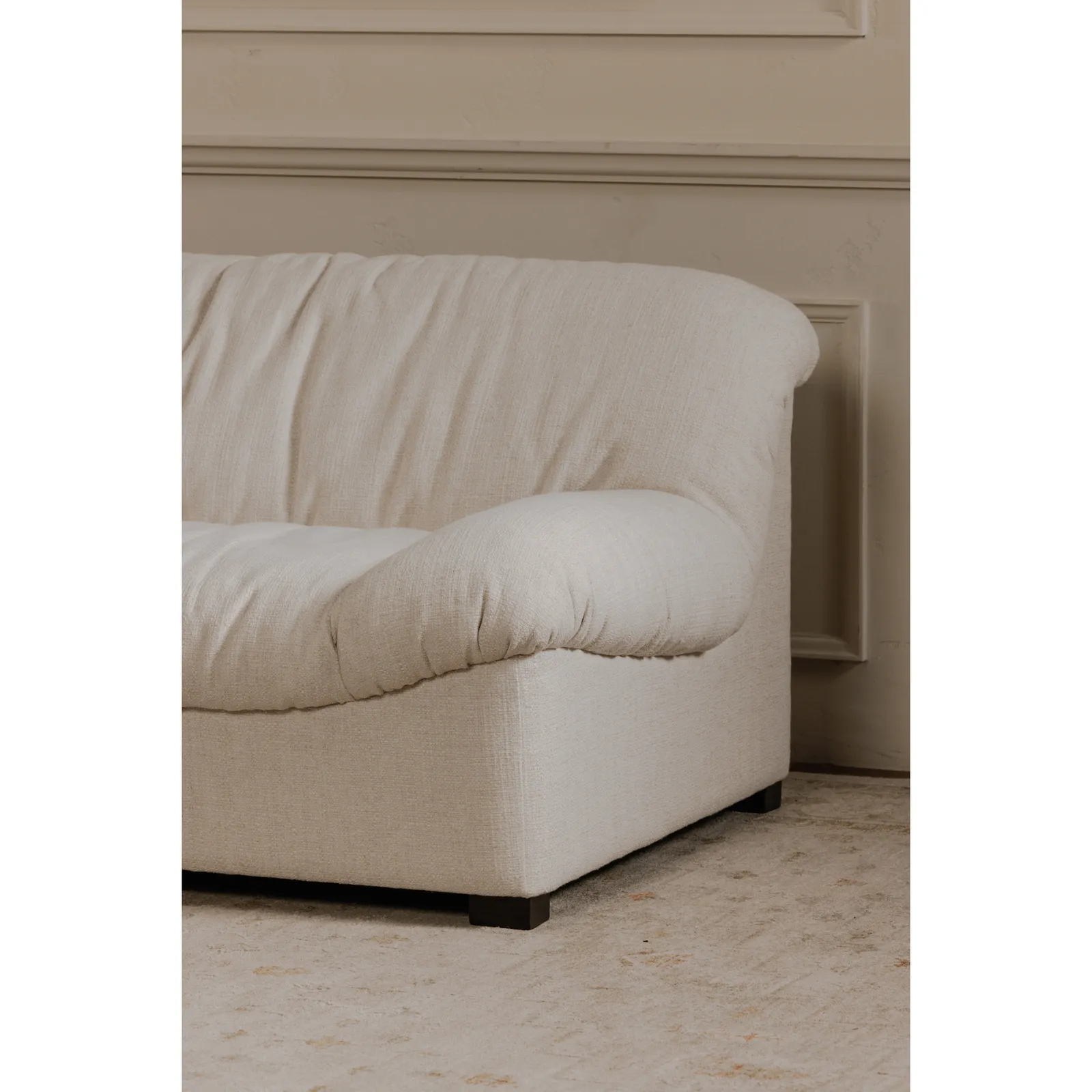 The oversized Halston sofa evokes a nostalgic 80s aesthetic through the relaxed, gathered look of its soft, textured woven fabric upholstery. Sink into its plush form, blending vintage-inspired postmodern design with contemporary repose.