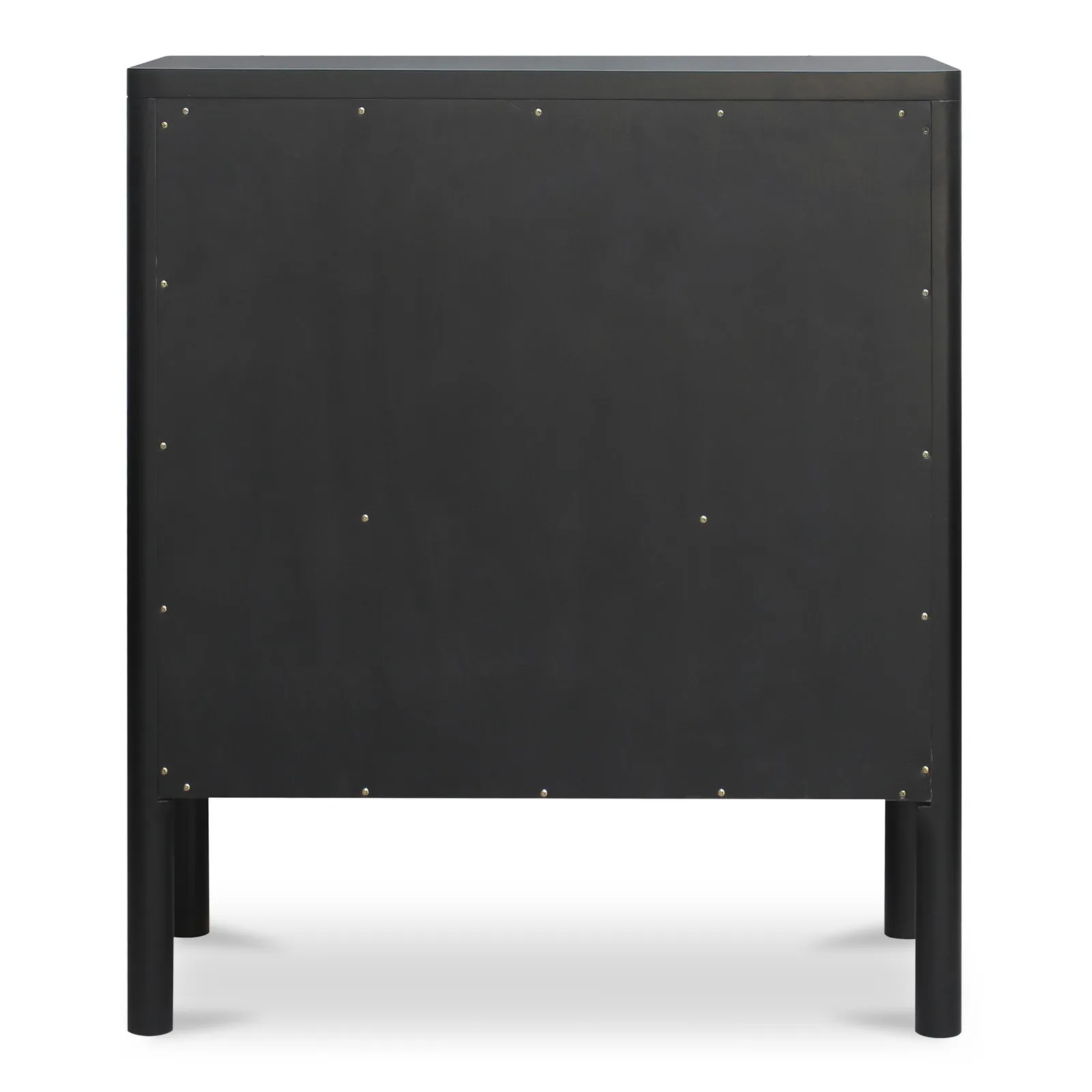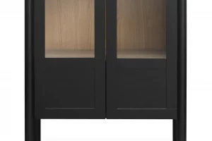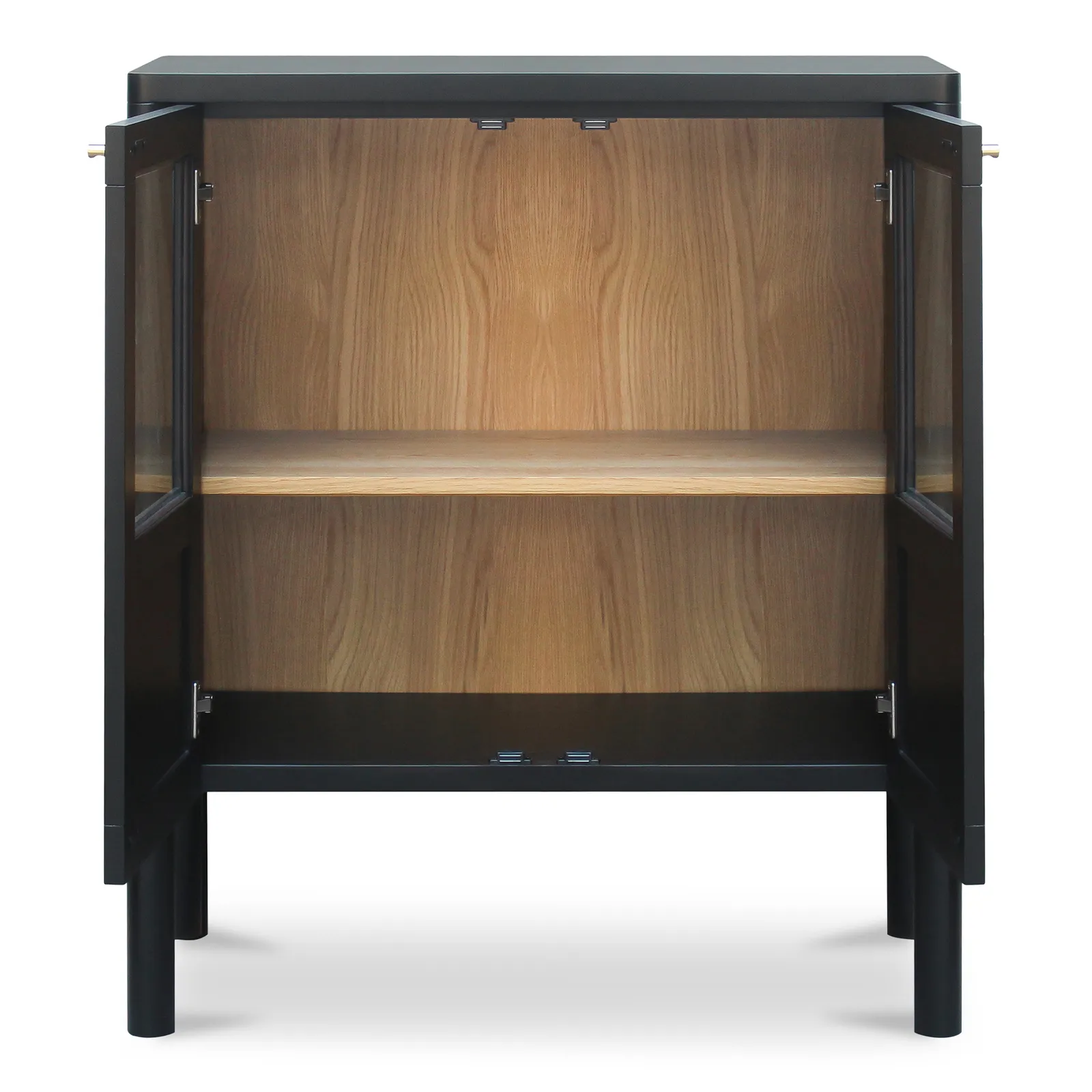 Thoughtfully designed, the Hannah cabinet balances transparency and concealment with tempered glass inserts. Crafted from solid pine frame and dowel legs with understated bronze hardware add a subtle softness, while the versatile finish complements diverse interior styles.
