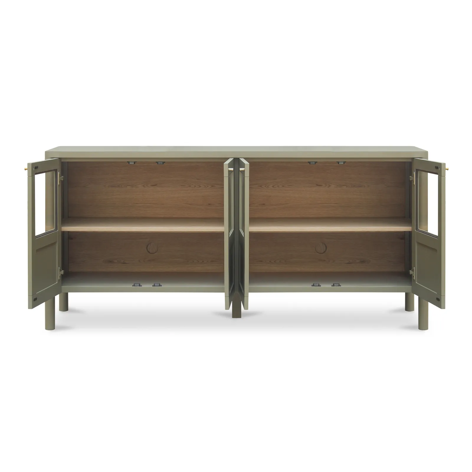 - Door front panels are a balance between transparent and concealed storage. Dowel legs and simple bronze hardware add softness