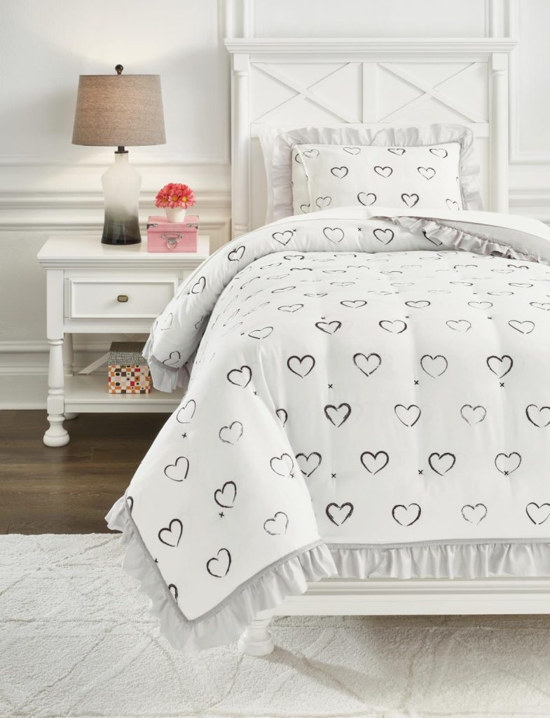 This comforter set is fresh,,,, fun and feminine without being too girly-girly. In solid gray with a romantic ruffled flange border and black cross-stitched tufting,,,, it reverses to a black and white heart design that’s full of love. Comfortable and practical,,,, your special young lady will feel right at home with her fashion-forward style.