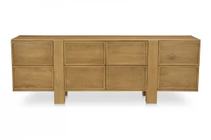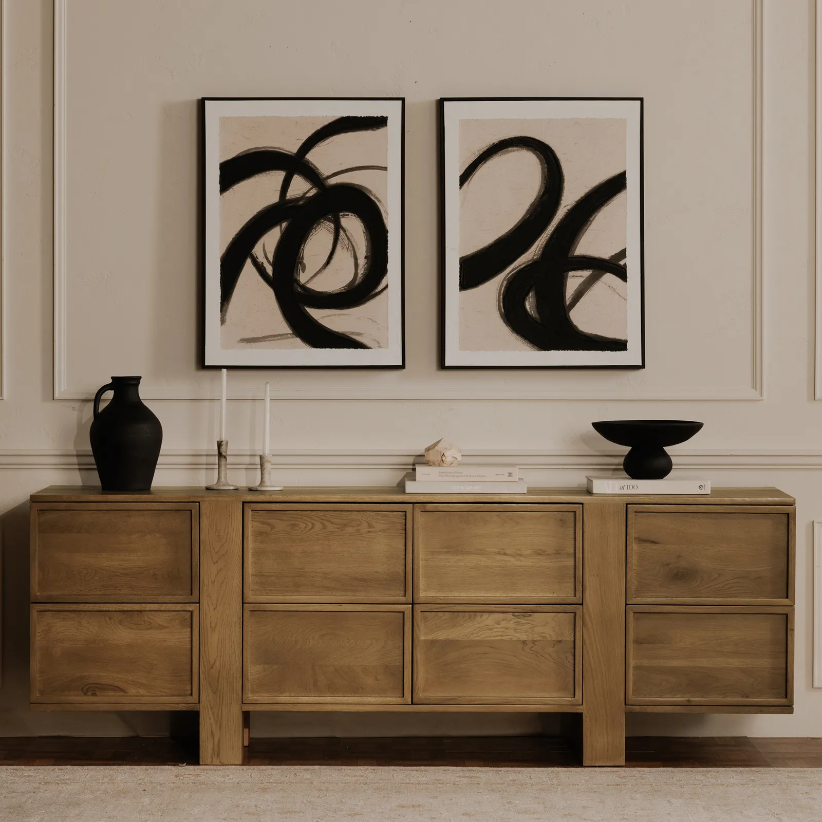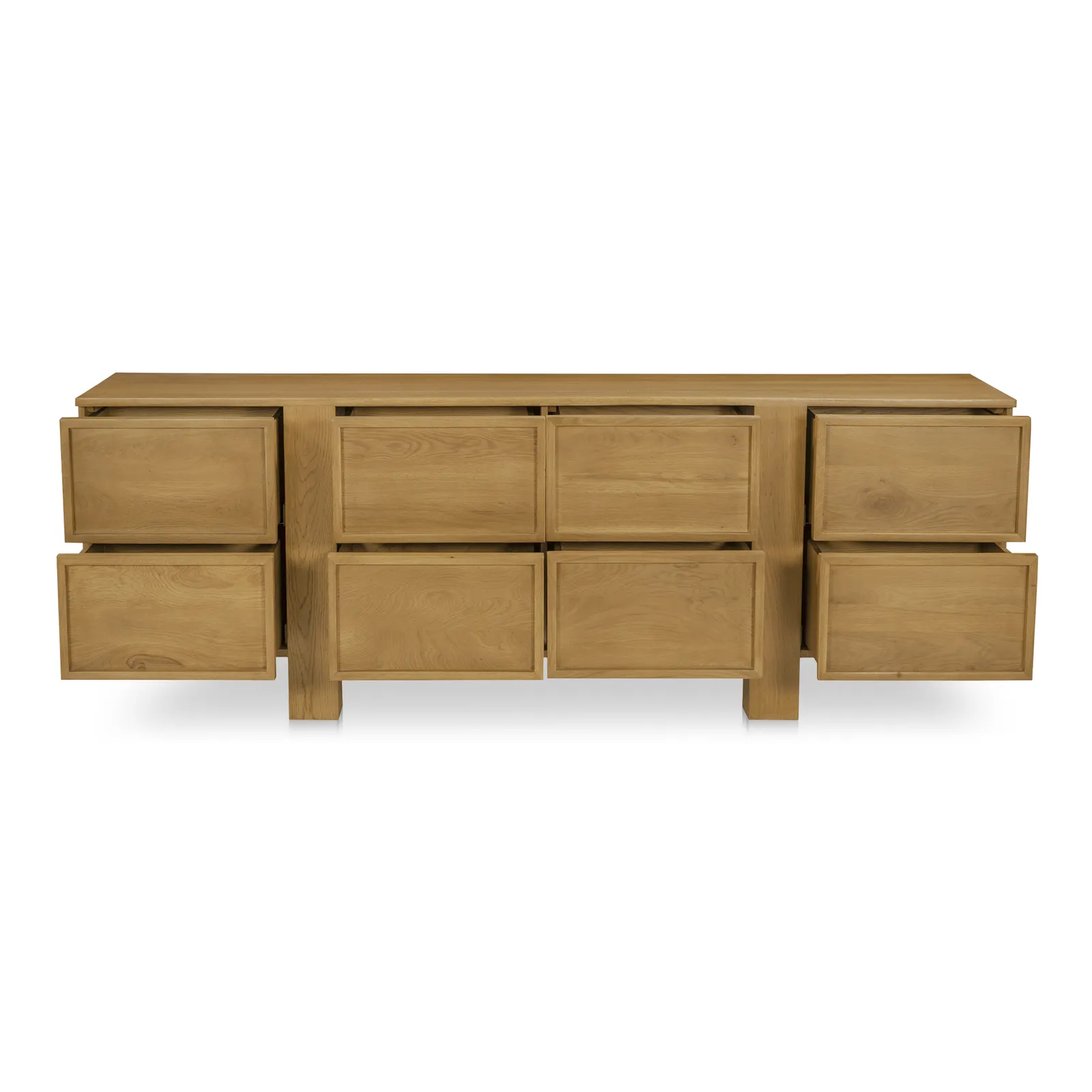 Drawing from the deep familial roots and craftsmanship of a traditional Japanese tansu, the Henley 8 drawer dresser embodies a blend of heritage and minimalist design. Crafted from solid oak, its design subtly incorporates storage that maintains the integrity of its elegantly elongated legs, presenting a piece that feels both anchored and effortlessly light.