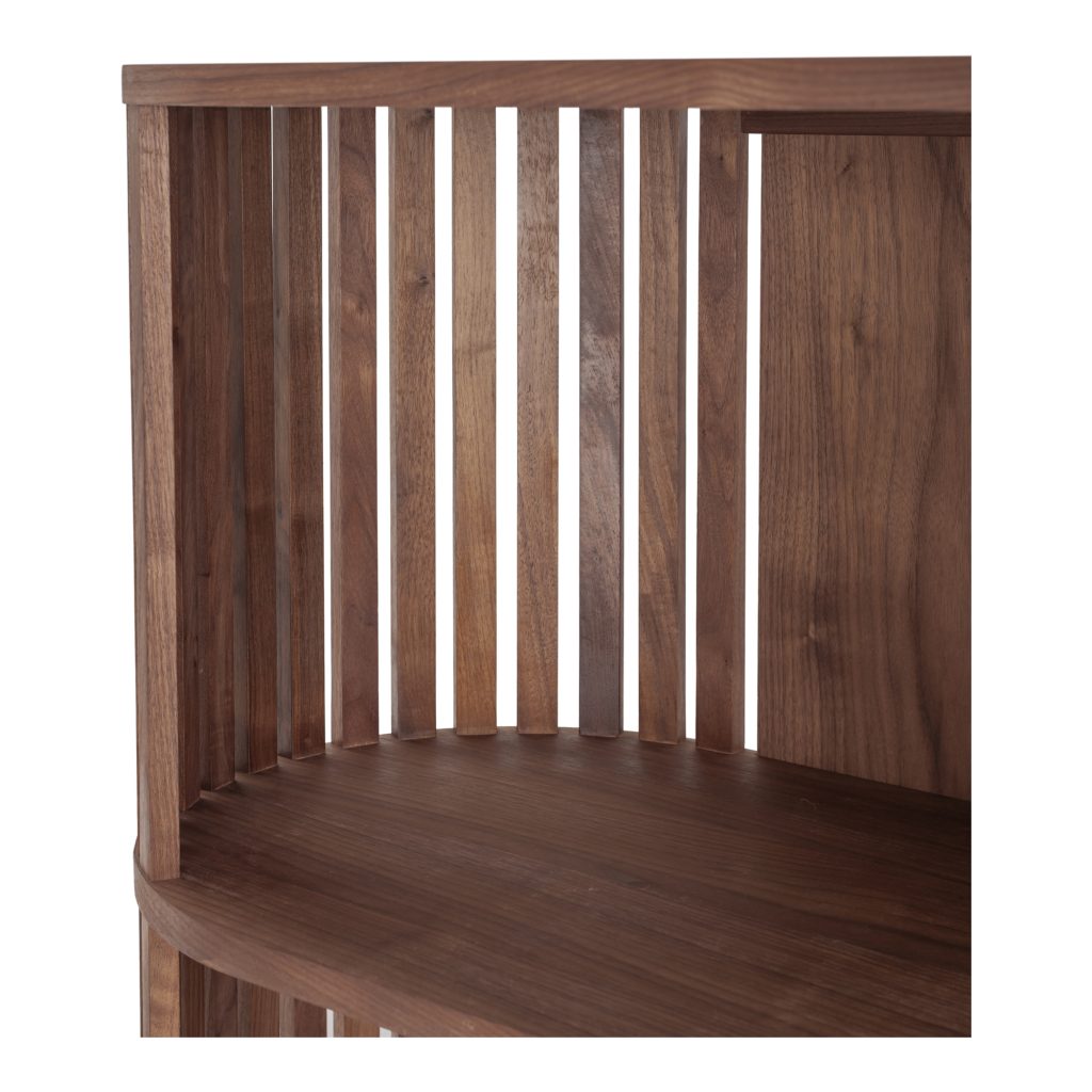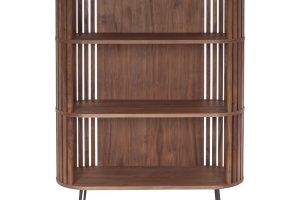 A stunning display for your own arrays. Ideal for your book collection, seashells, or whatchamacallits, this shelving unit is blazed in richly veneered solid walnut with deeper shelves for even those larger Taschen’s. Mid-century modern style with a gently rounded form and gated paneling that details its sides and back, with slightly flared steel legs. Practically perfect, this bookshelf is a multi-functional style that works from room to room.