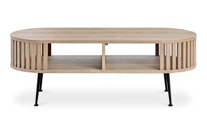 An entirely practical mid-century modern design with clean lines, tapered legs, and a gently rounded, smooth silhouette. This solid oak, lightly finished coffee table features gated paneling that details its spacious storage areas. A beautiful nod to 1950s décor, this versatile style works from room to room, centerfold as a coffee table or under the window with plants and sunlight.