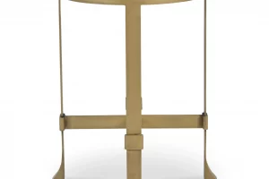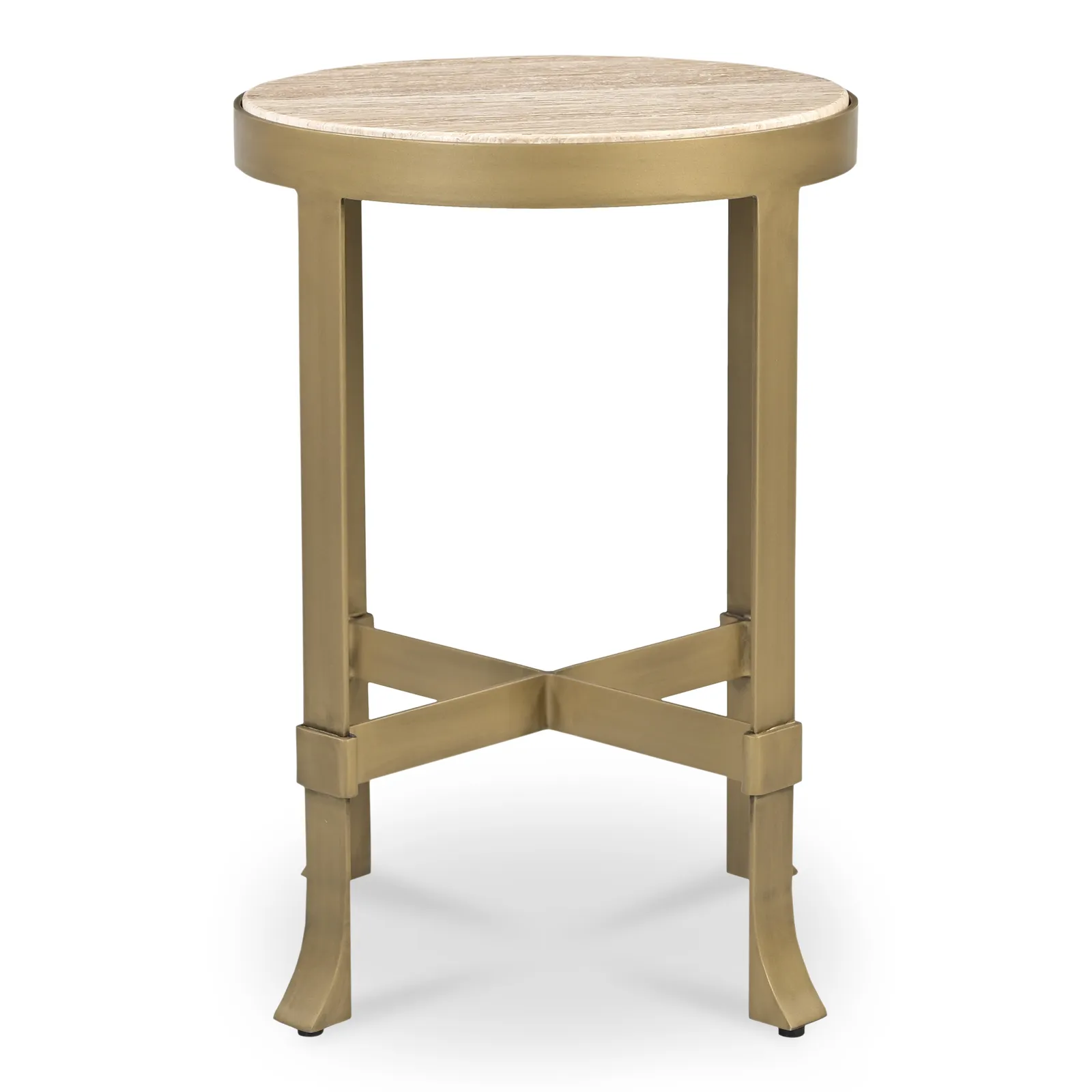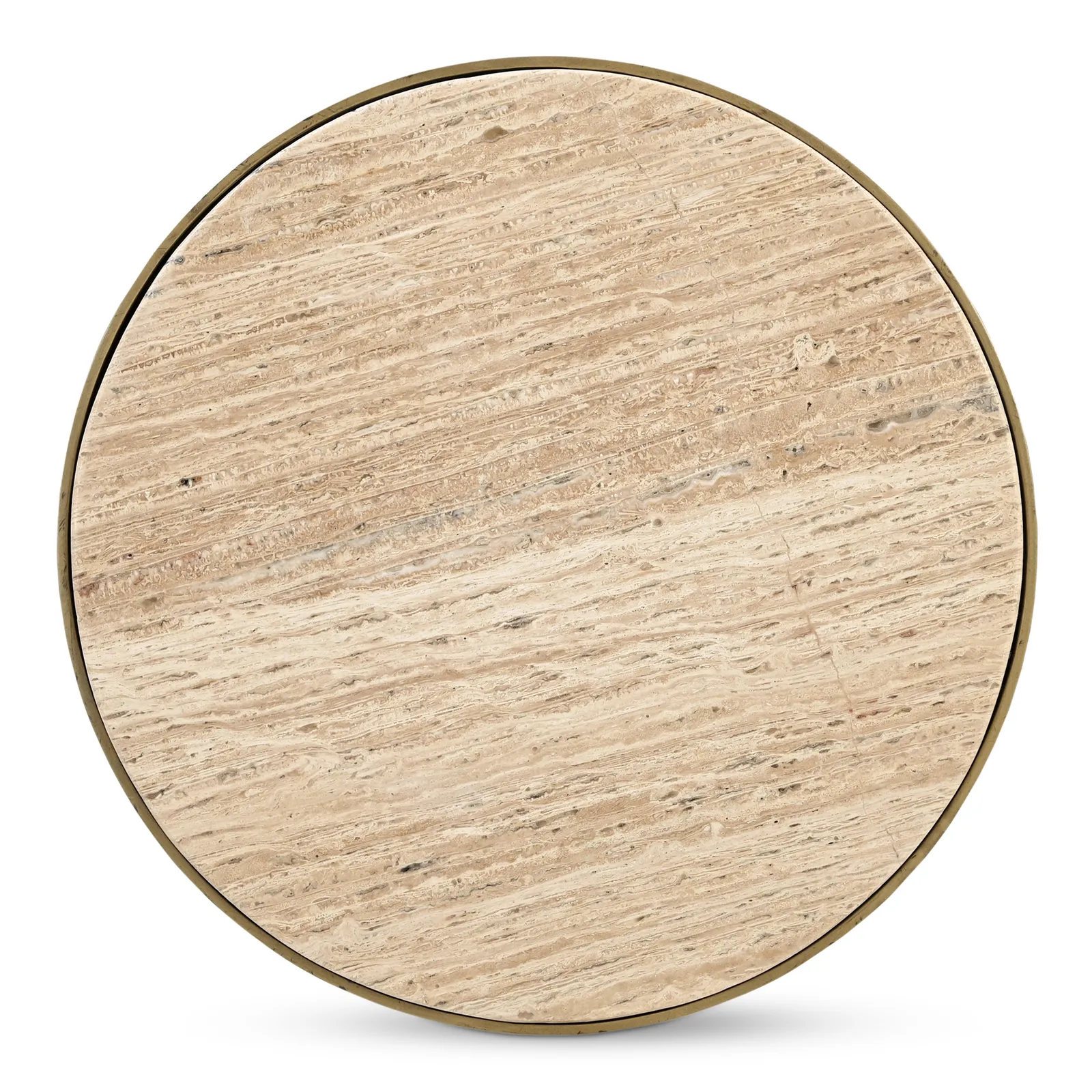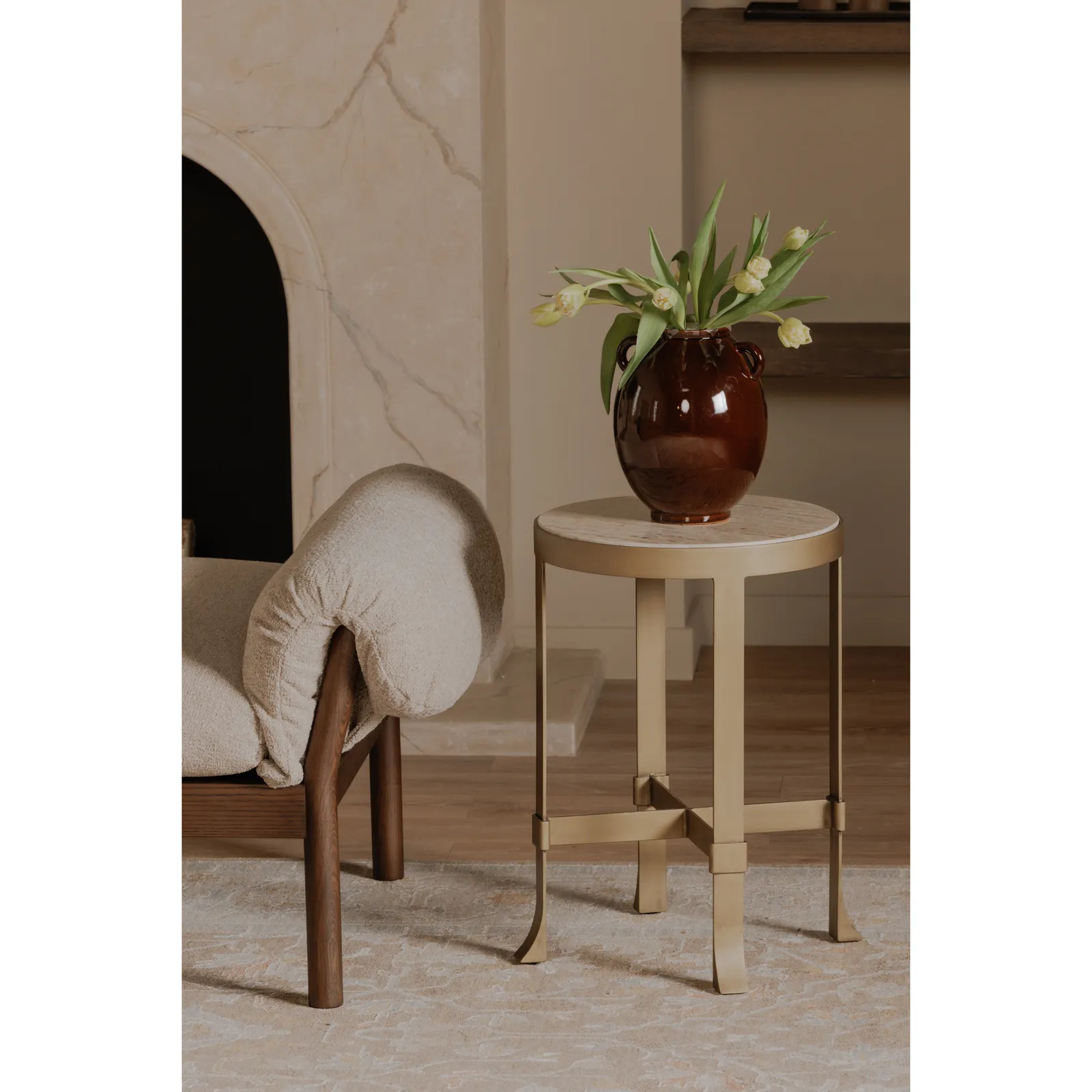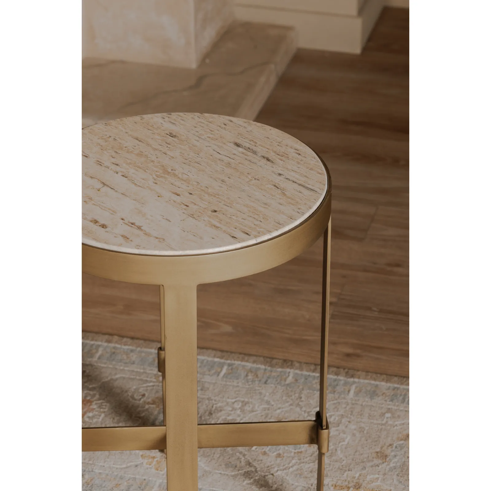 The Holli side table blends timeless travertine with sleek iron, as its organic top rests within a subtle metal rim. The antique gold base, featuring gentle curves and distinctive buckle-like detail, showcases meticulous craftsmanship in a timeless hue.
