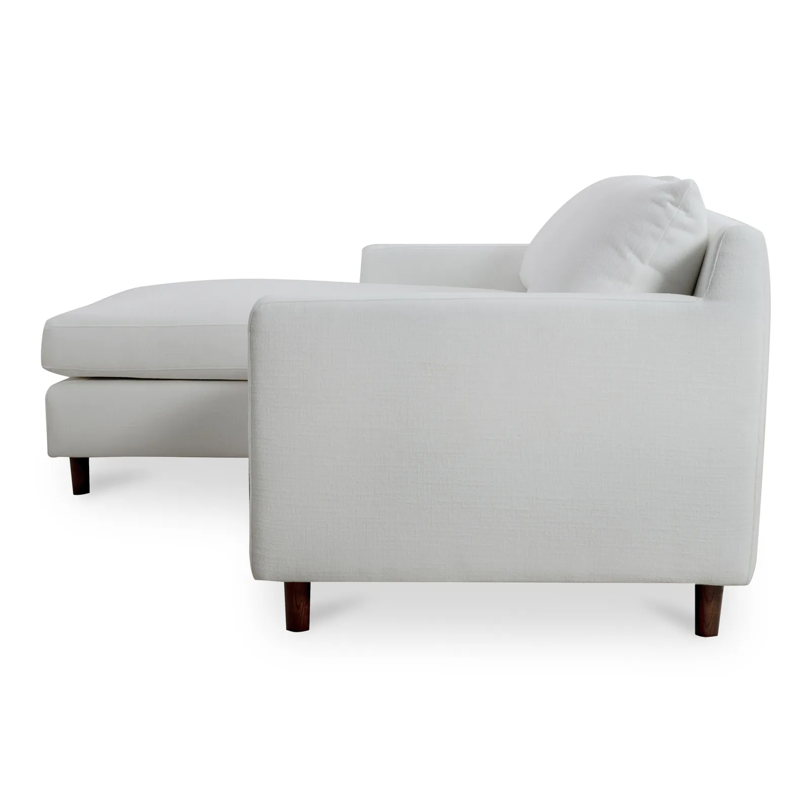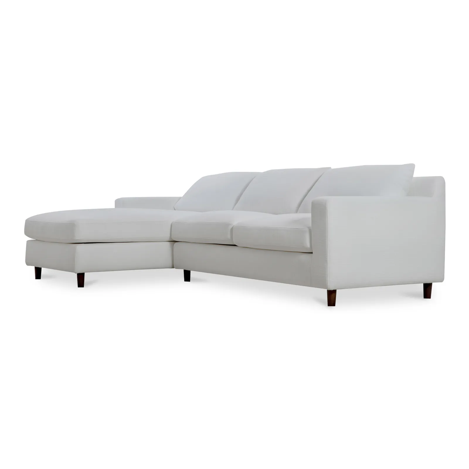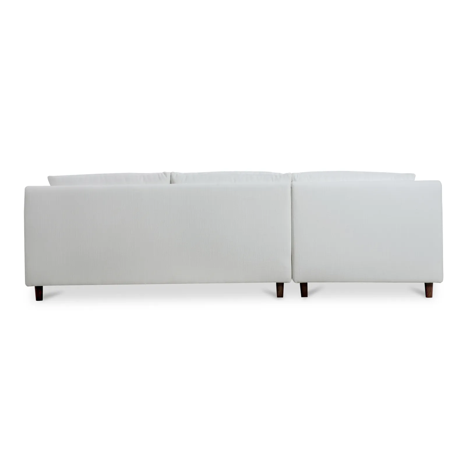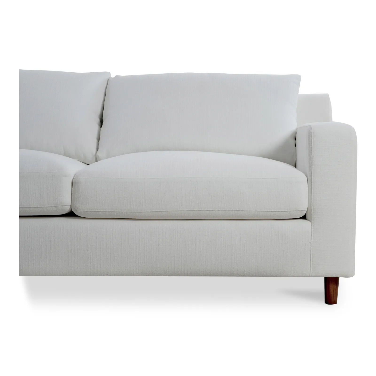 The Hutton sectional features soft-to-the-touch chenille fabric constructed from 100% polyester treated with C0 performance technology. A traditional higher back and tapered dark wood legs nod to mid-century aesthetics while providing contemporary coziness as a plush feather topper ensures unparalleled comfort.