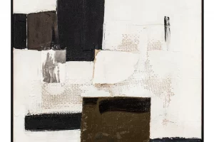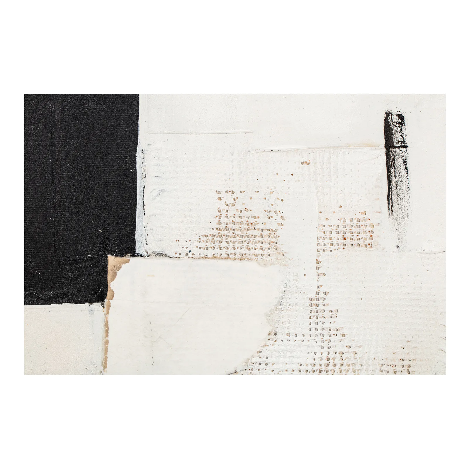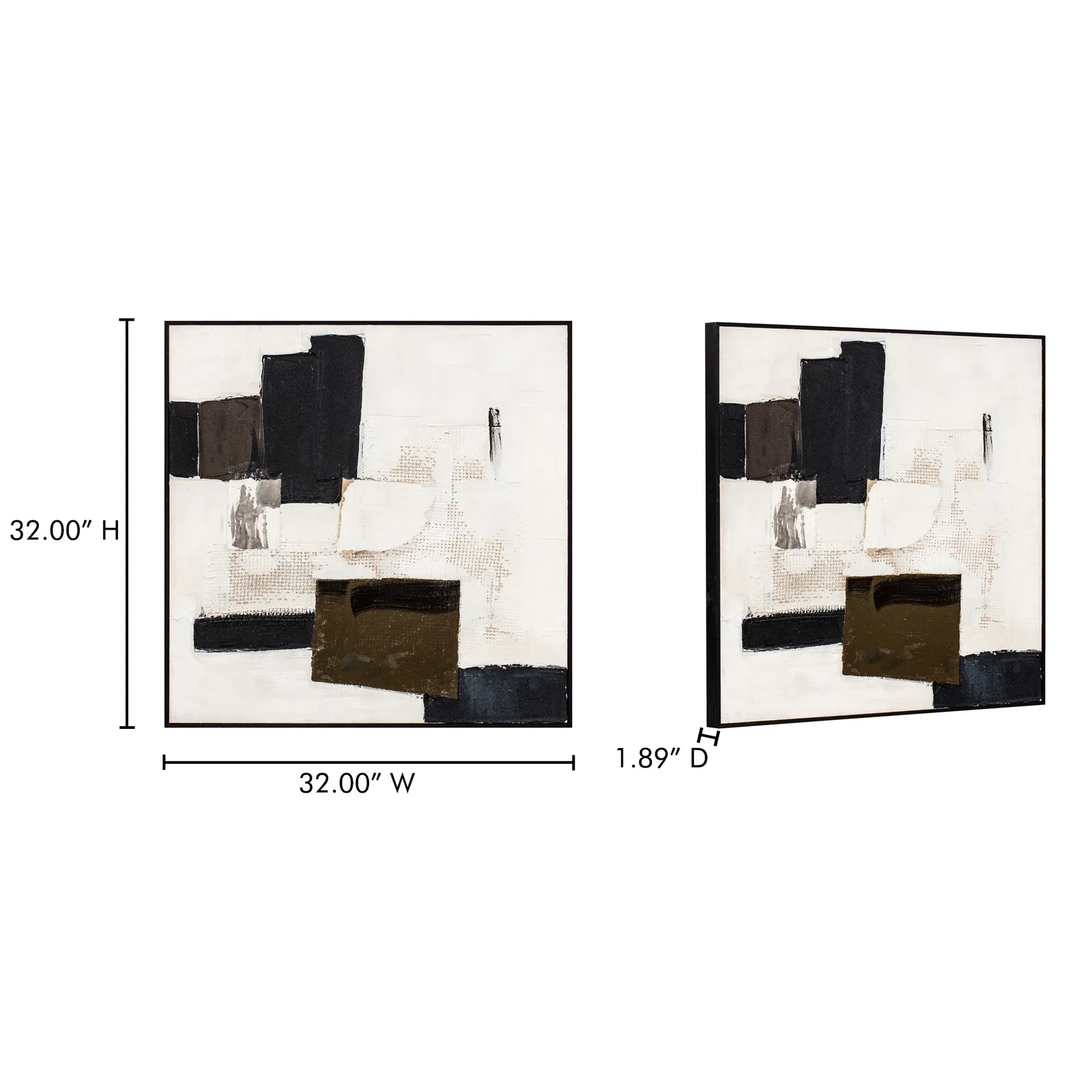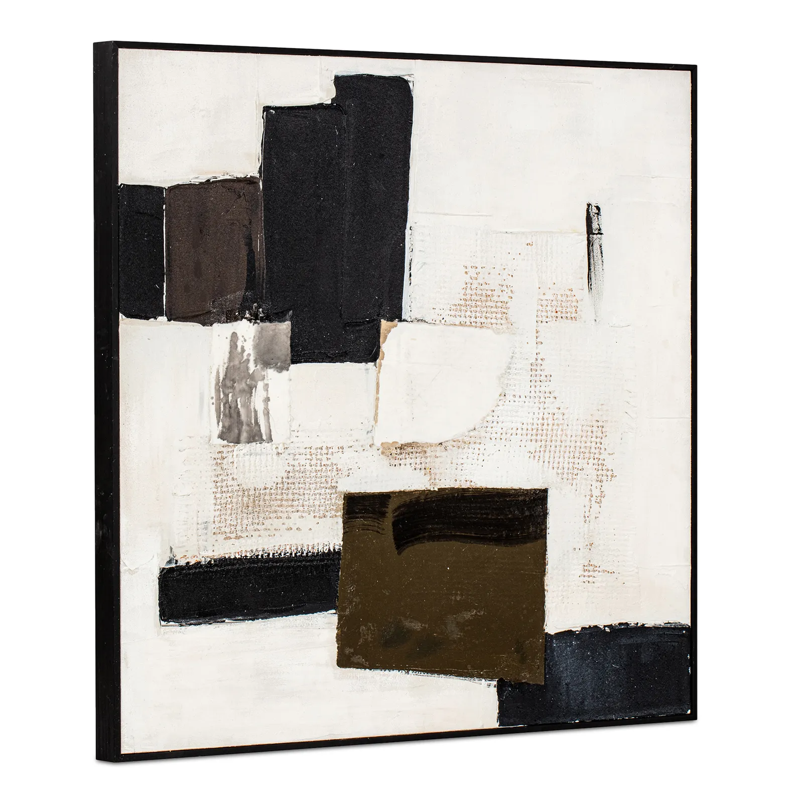 The Interlude framed painting melds abstract layers with a dance of material and color, set against a canvas of serene neutrals. Dark, moody tones woven with mesh bring depth, while a modernist ethos, softened by neutral beige and off-white hues, offers bold yet understated elegance, a sophisticated design and layered abstraction.