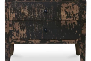 The Iris nightstand is crafted from mango wood with a carefully distressed finish and paired with minimal yet expressive hardware, paying homage to antique design while offering a fresh, contemporary edge. Its heavily distressed look captures a sense of history and character, making each piece uniquely its own. This piece combines structure and style, bringing a warm, rustic aesthetic to any bedroom.