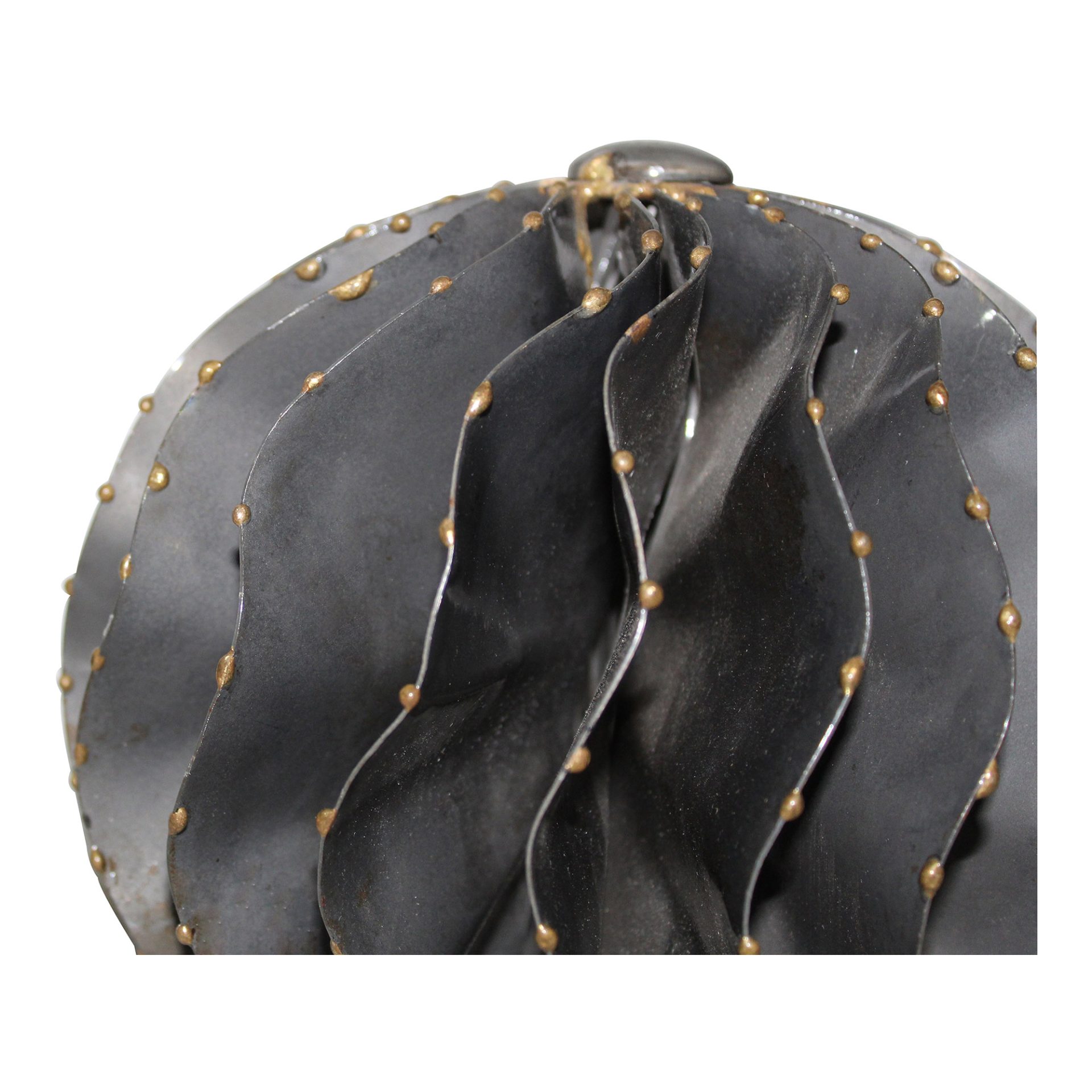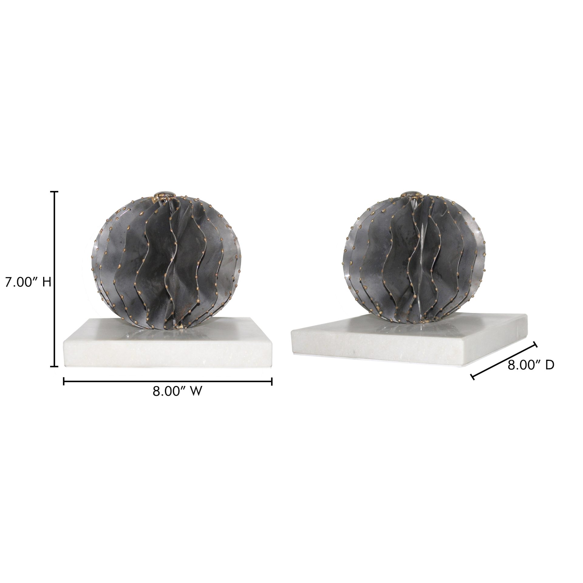 A piece perfect for additional decoration on your shelf. The Iron strips are welded together in a sphere and detailed with brass iron dots to create a magnificent orb like shape. Seamlessly fixed atop a white marble base, this tabletop piece adds subtle sophistication to any room.