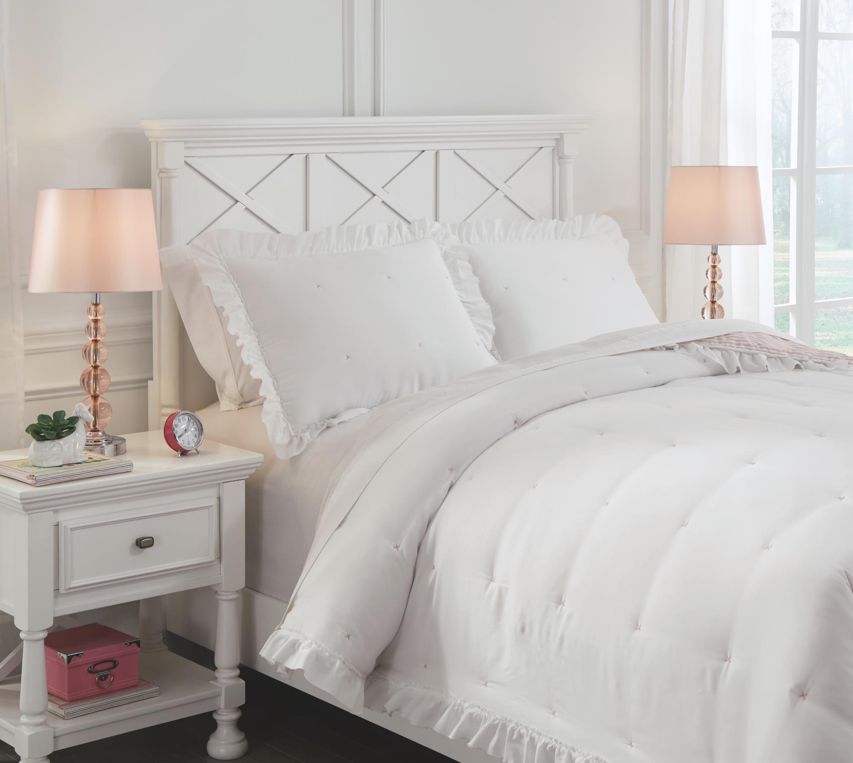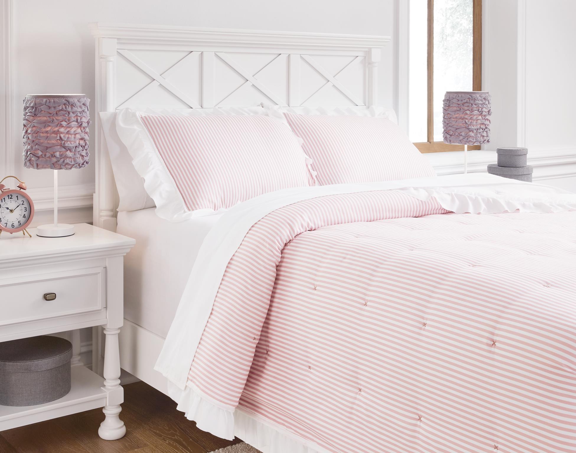 With her favorite colors coming together,,,, this comforter set makes for one sweet dreaming retreat. The crisp clean white comforter with flange border reverses to a light pink and white pinstripe design providing a fresh new look to suit your mood.