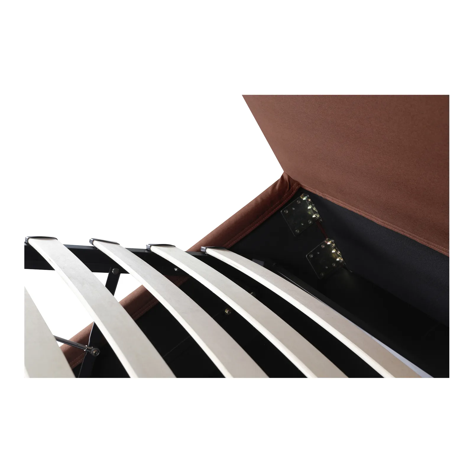 The Joan bed is more than meets the eye, with a hidden compartment that is tastefully innovative and easy to access. Beneath the mattress, a hydraulic system reveals ample storage space neatly tucked away, while a fully removable slipcover allows easy cleaning. The upholstered frame features the same fabric as the slipcover, so it can also be used on its own, providing two easy options to create the same classic look.