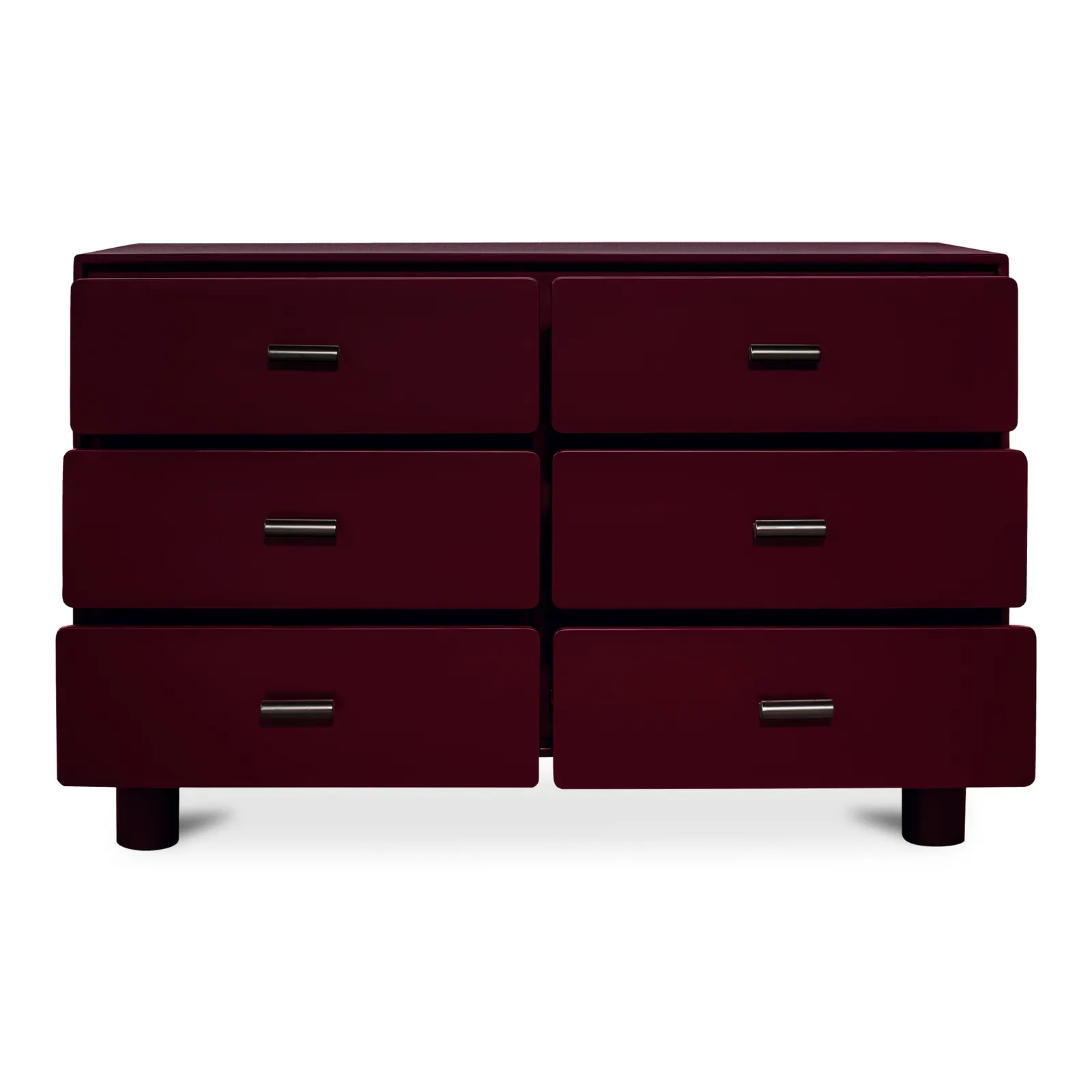 The Jolene 6-drawer dresser infuses the bedroom with a touch of vibrant elegance. This deep red dresser, expertly crafted with a rubberwood frame, offers both style and practicality. The six drawers provide versatile organization options. Playful legs and a paired-back frame with handle detailing create a charming silhouette that brings personality without compromising sophistication.