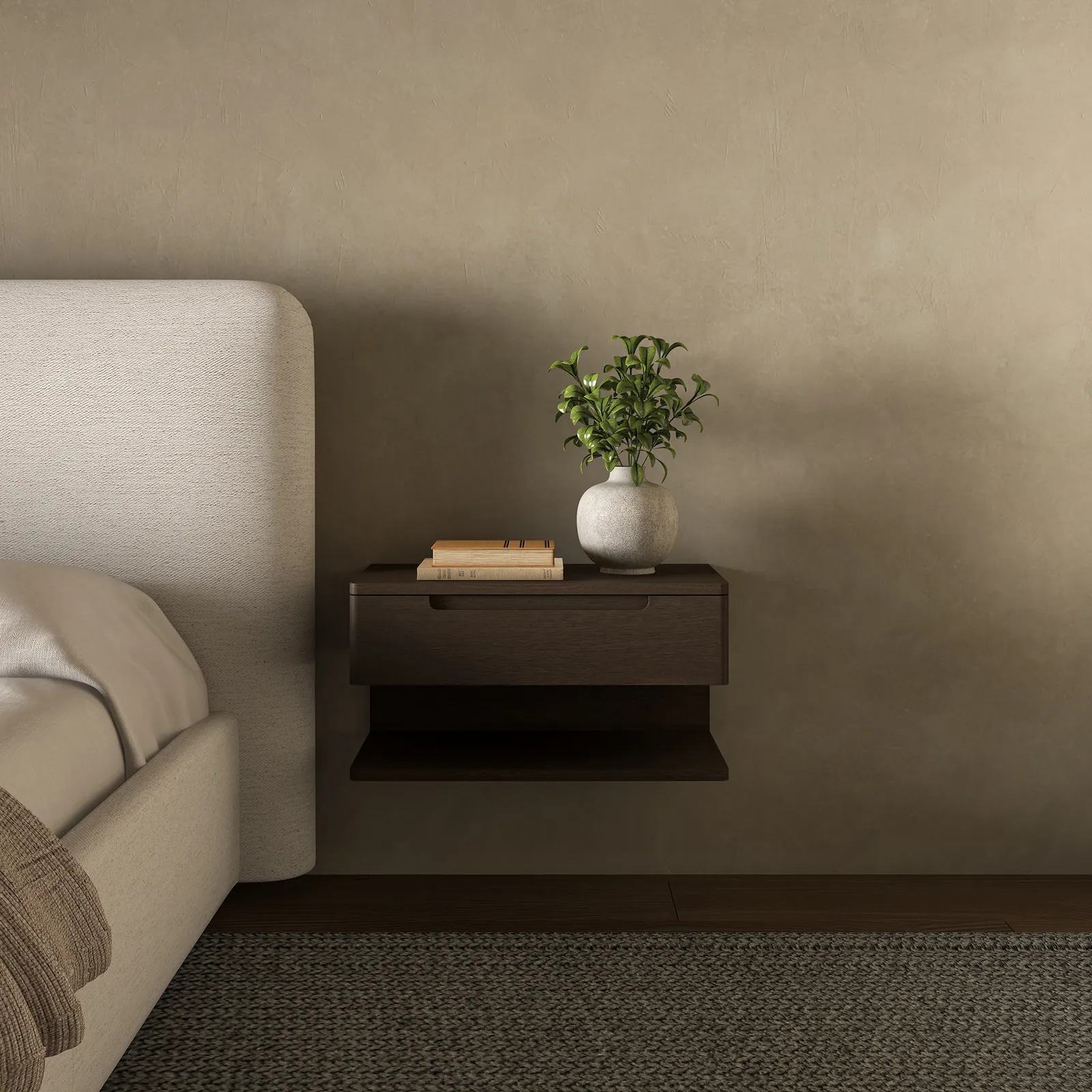 The versatile Jonah nightstand embodies midcentury style with its dark walnut finish and substantial form. Wall-mounted with a French cleat that creates a sleek, floating effect and featuring a drawer and an open shelf, ample storage allows this piece to serve as a nightstand or an entryway table.