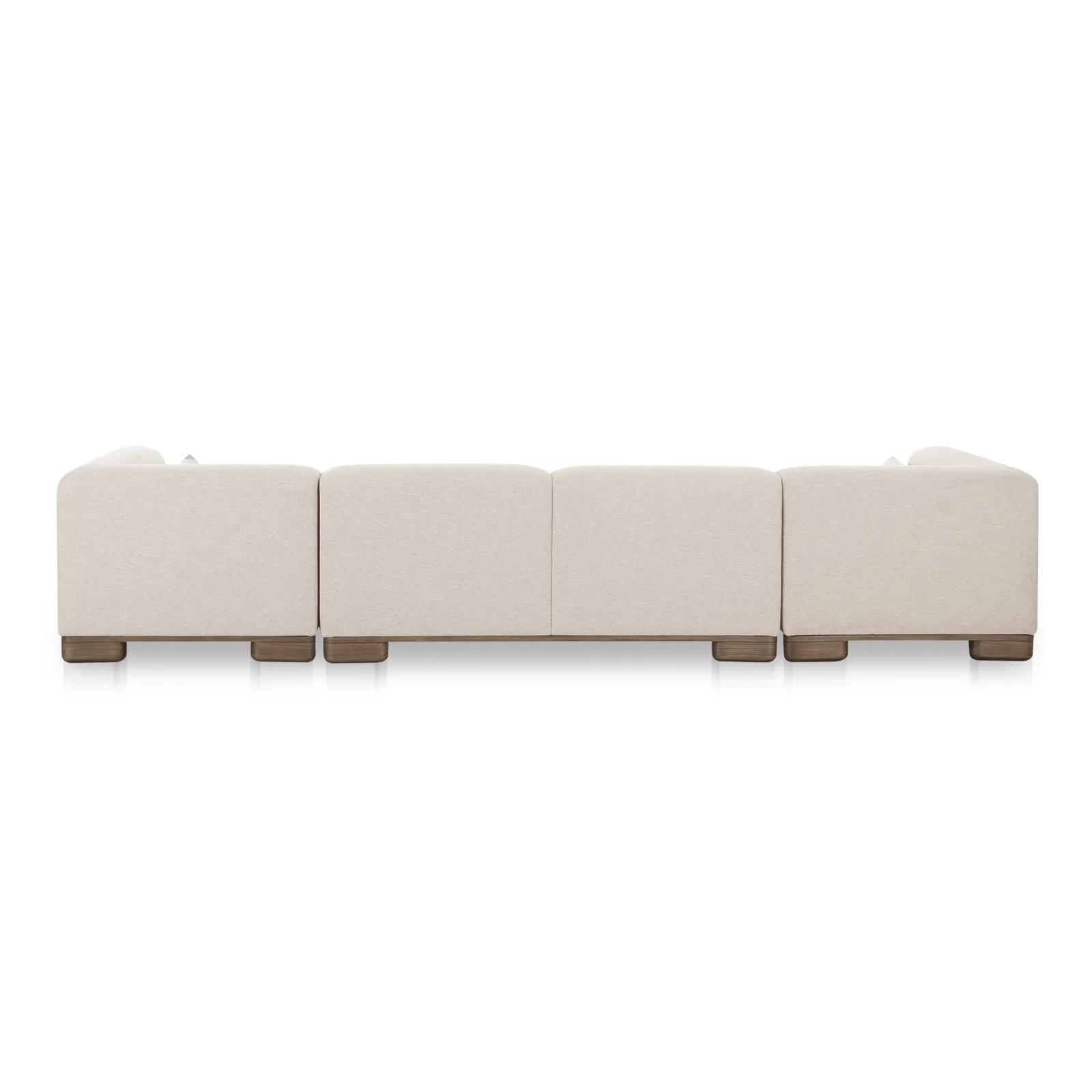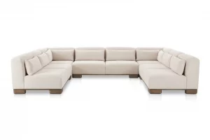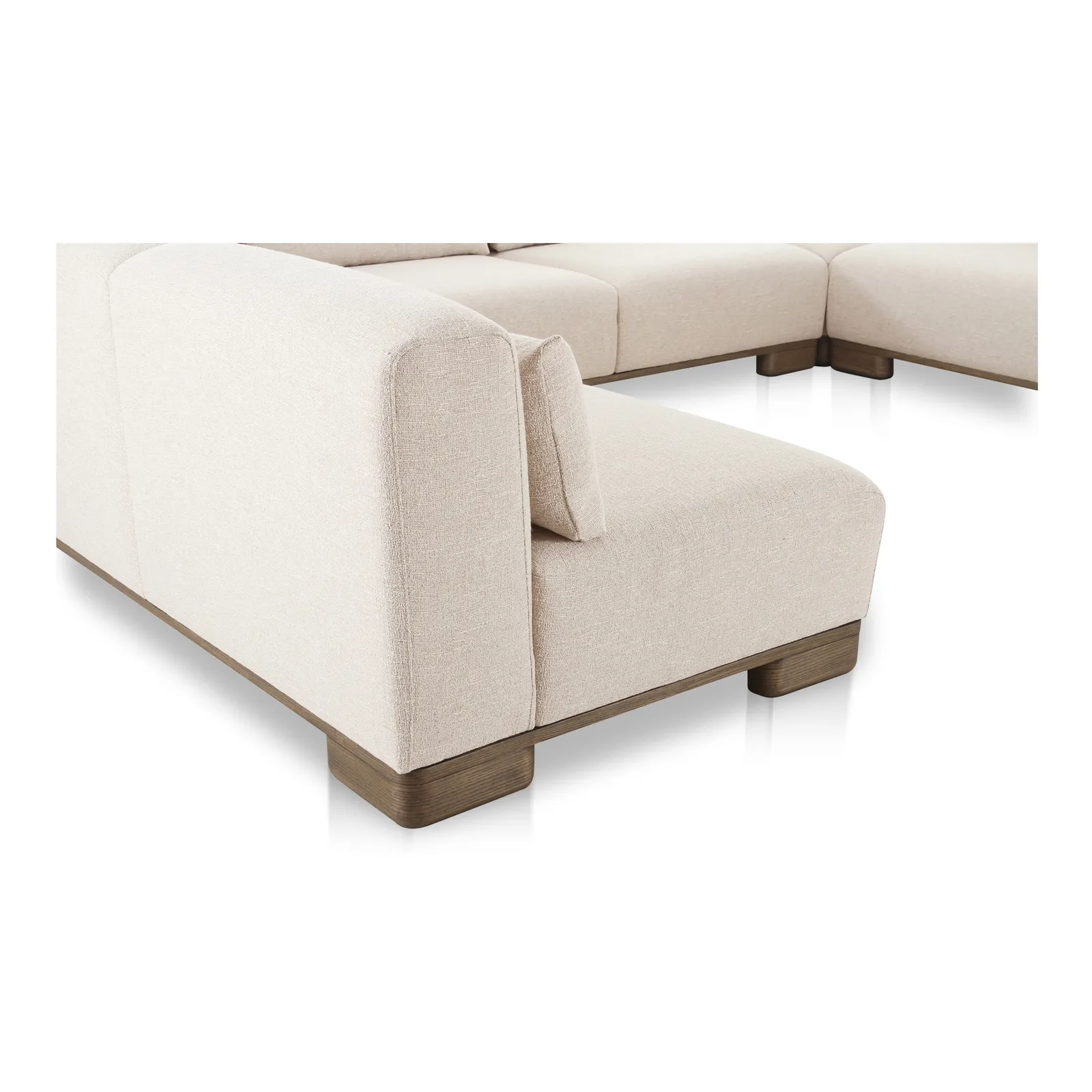 Designed with modular components that expertly function as standalone pieces or as part of modular configurations, the June collection is all about versatility. Wrapped in warm-toned, textured performance fabrics and elevated by oversized oak veneer legs, this piece combines everyday living and understated elegance. Built for ultimate relaxation — the plush feather and fiber fill, along with lumbar toss cushions, offer ultimate comfort. Consists of 5 modular parts: 3 slipper and 2 corner chairs for easy switch around.