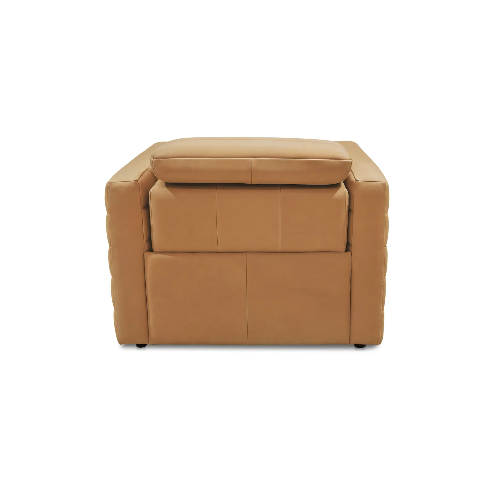 Wrapped in top-grain leather, the Juno power recliner chair’s sleek silhouette and horizontal channel detailing exude modern elegance. Hidden buttons effortlessly transition between positions, while the adjustable headrest offers personalized support.